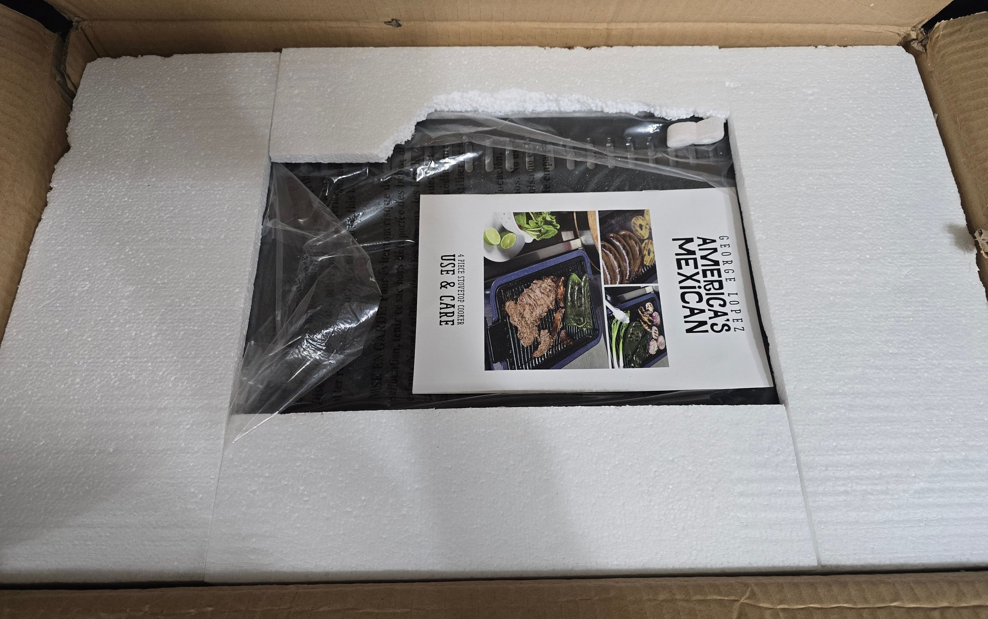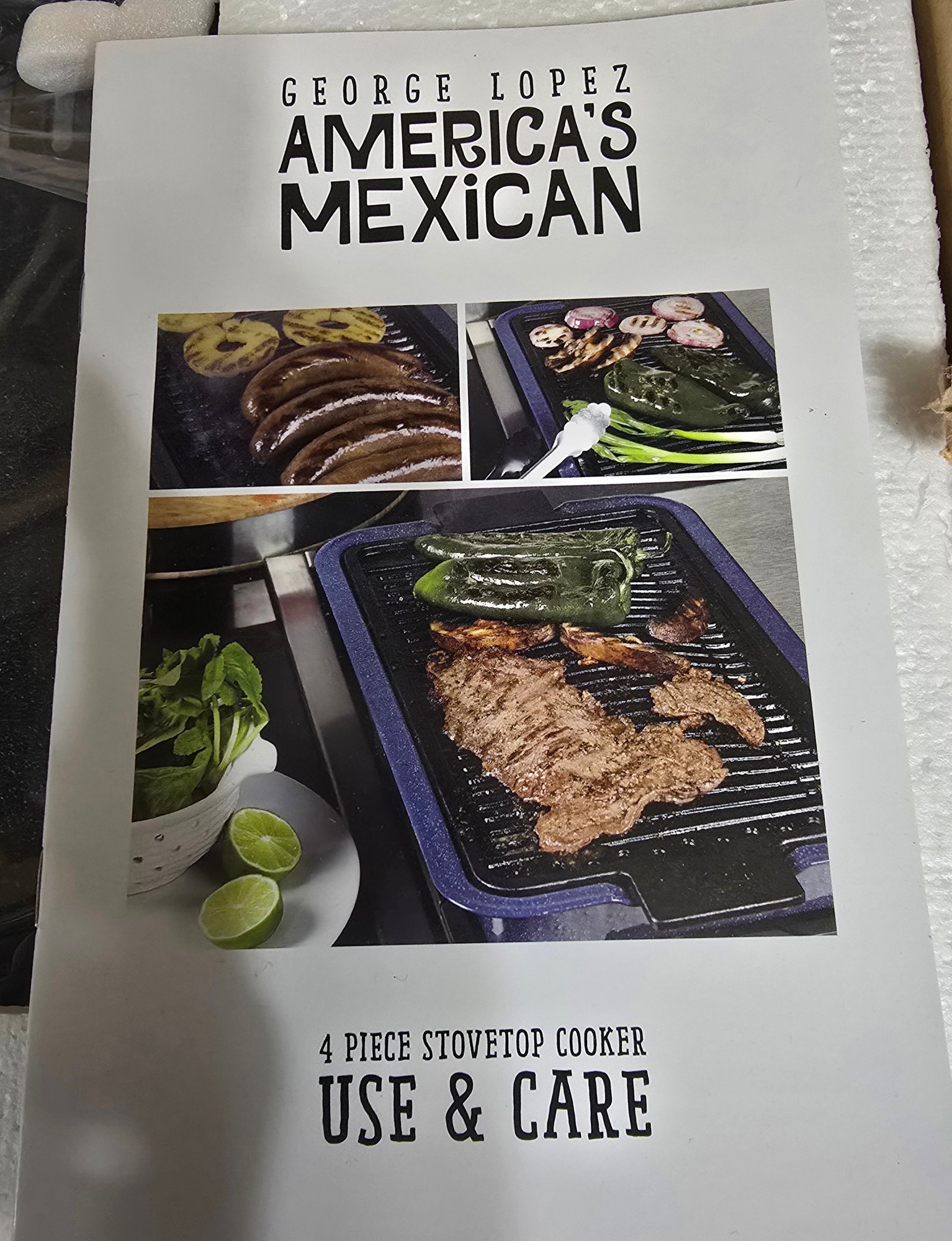George Lopez "America's Mexican" 4-piece stovetop cooker set designed for grilling and griddling. Looks to be unused. Untested. Please see all pics for details.