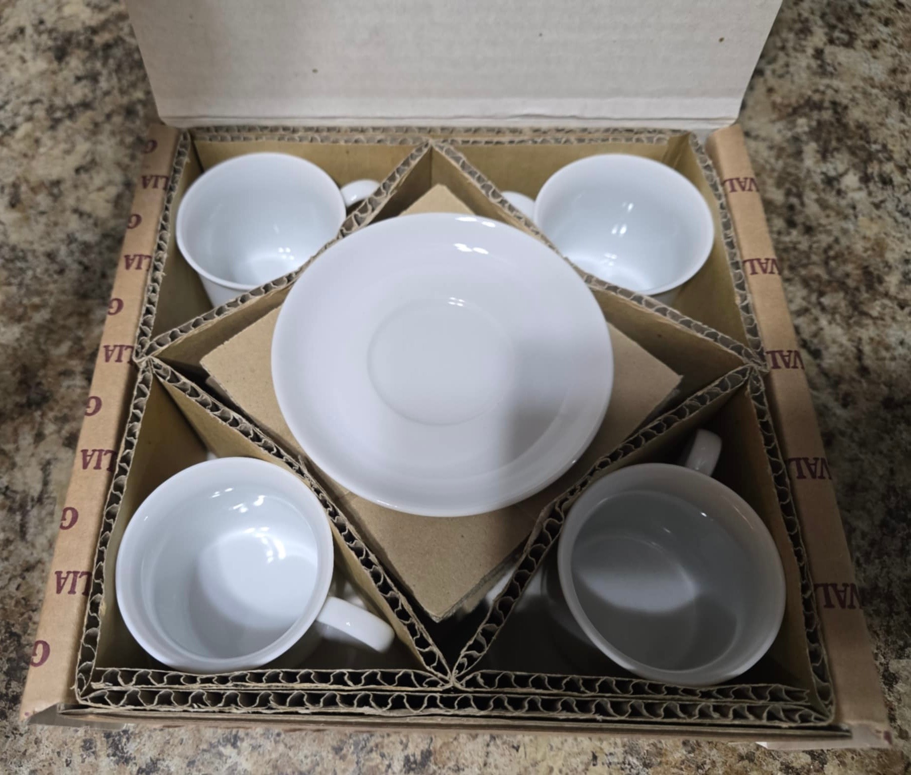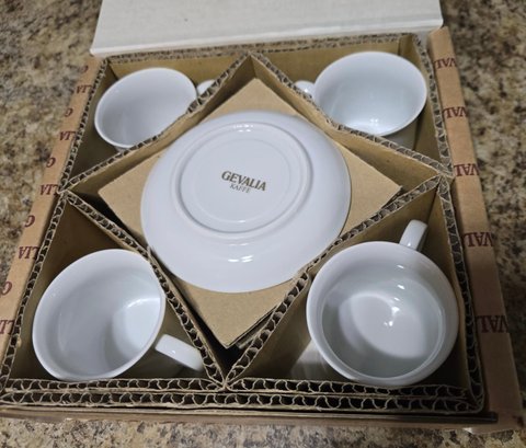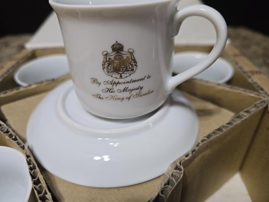 Gevalia Kaffe "By Appointment to His Majesty The King of Sweden" white ceramic cups and saucers.