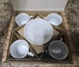 Looks unused. Plates measure 4.25" and cups are 3.5 x 2.5 x 2.5.