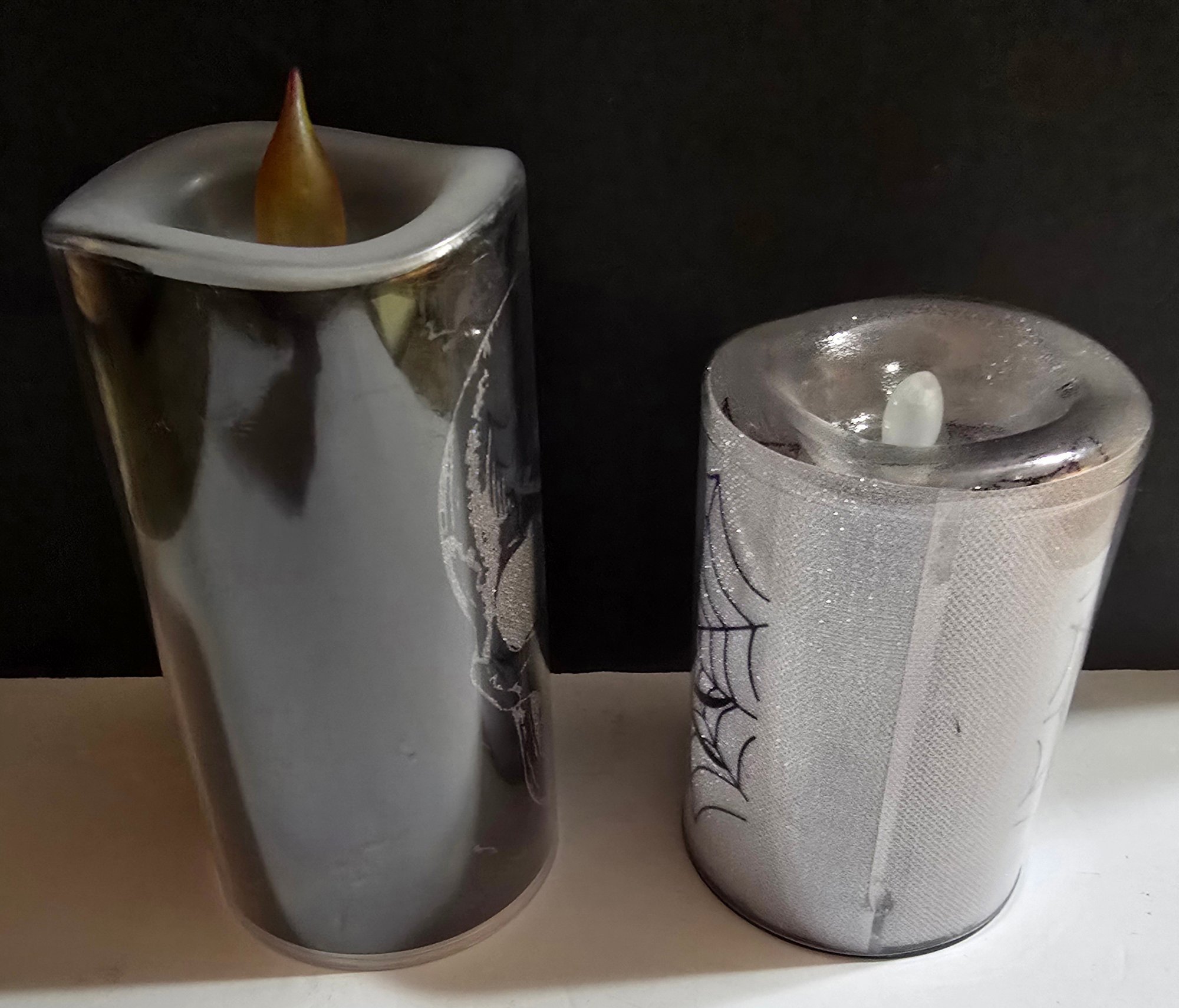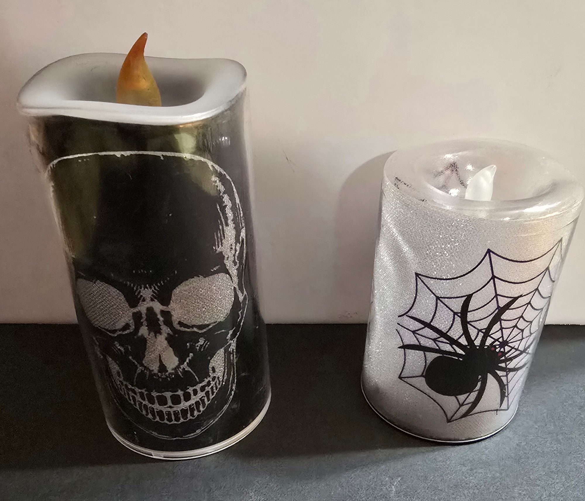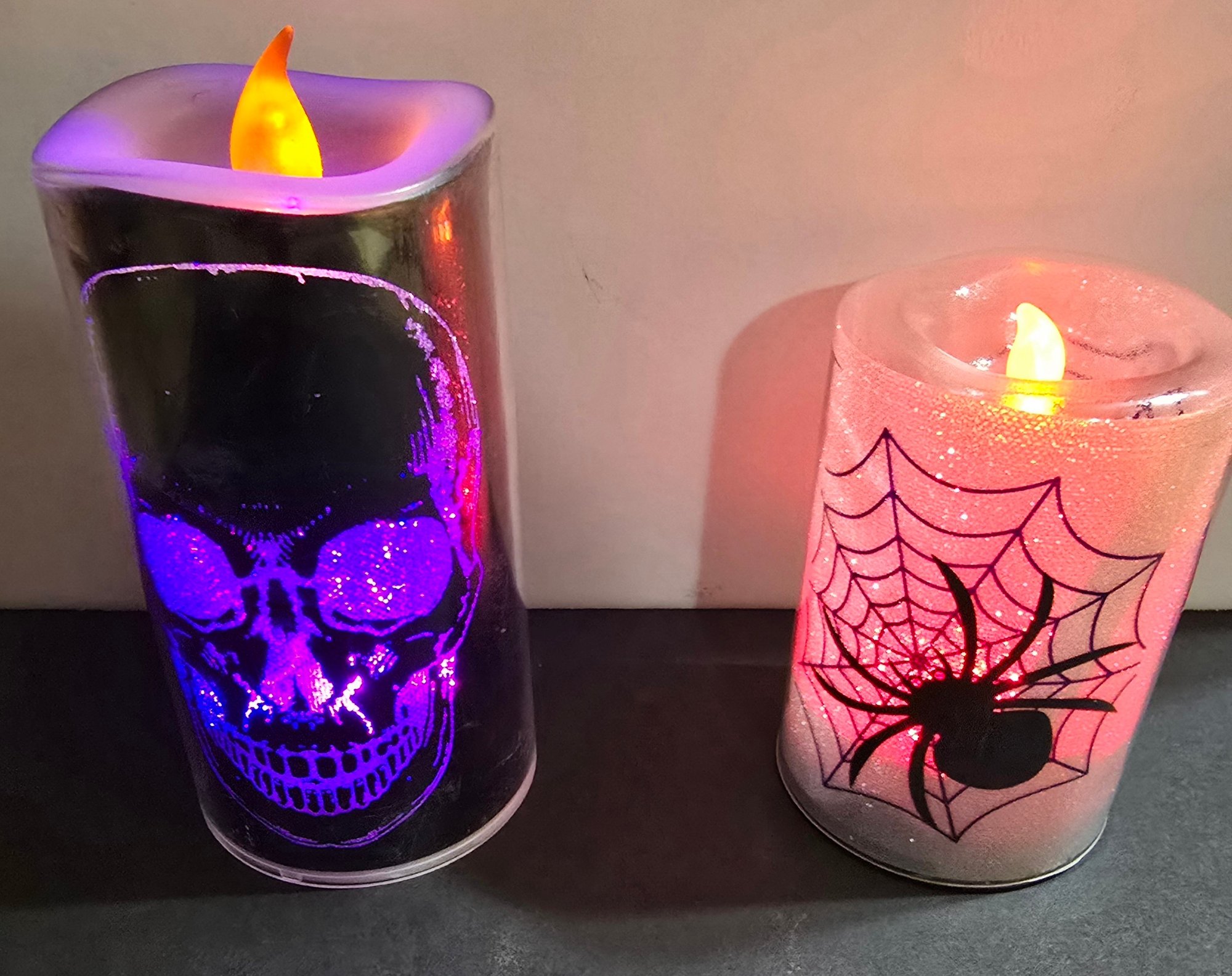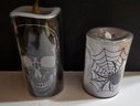Flameless Halloween-themed LED pillar candles designed for holiday decoration. . The tall one changes colors. Please see all pics for details.