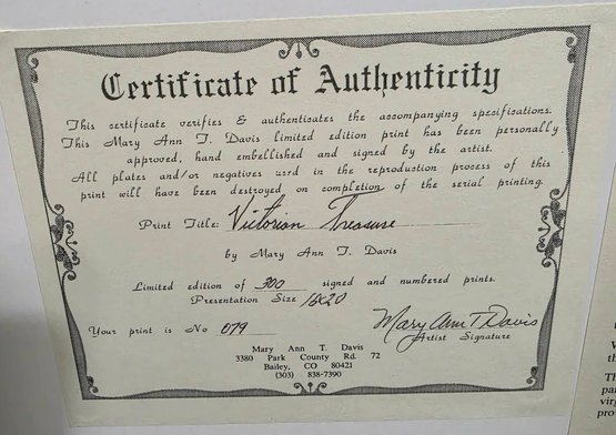 Framed and matted signed & numbered print titled "Victorian Treasure" by artist Mary Ann T. Davis. Measures 18.25 x 22.25.