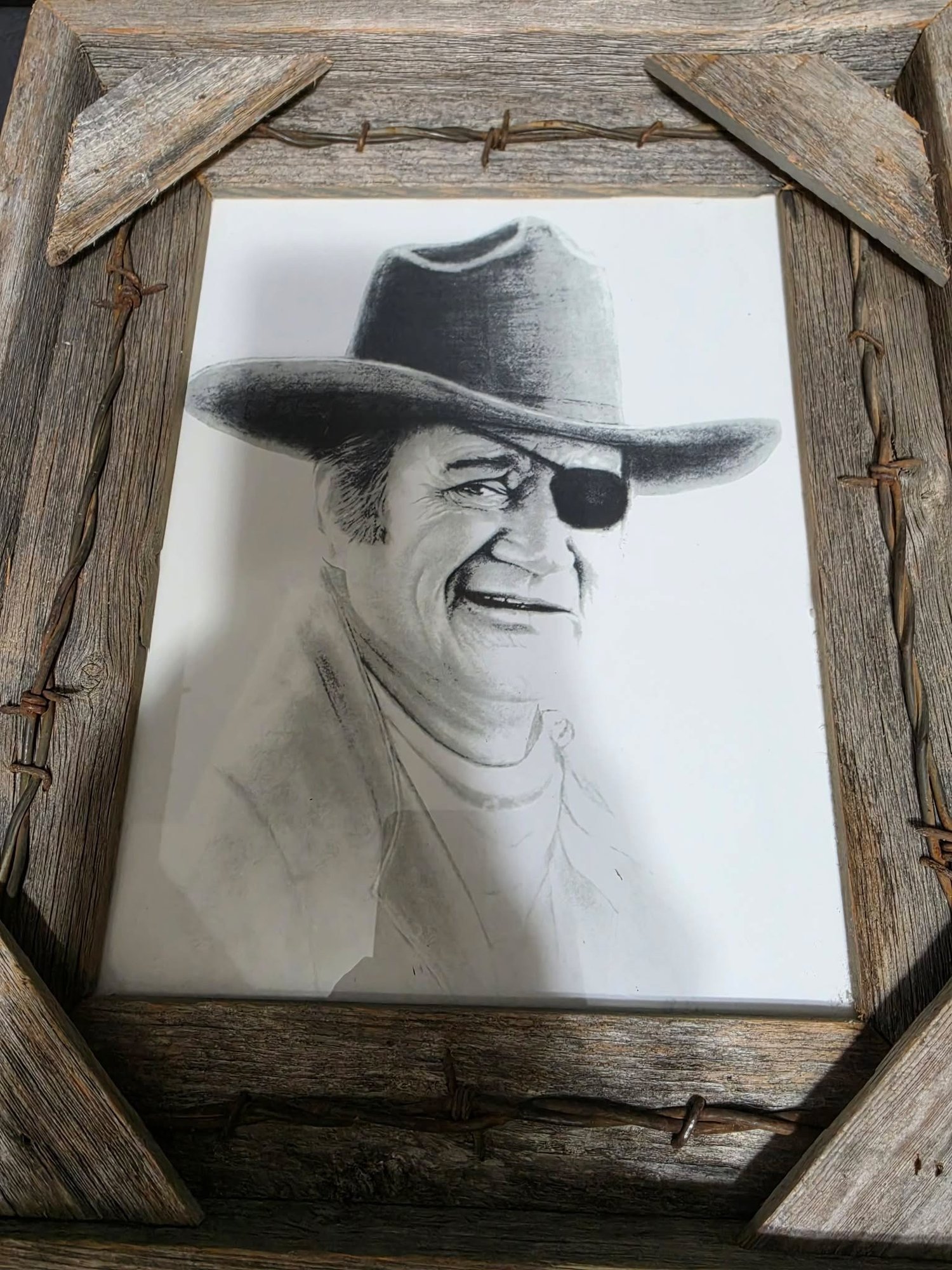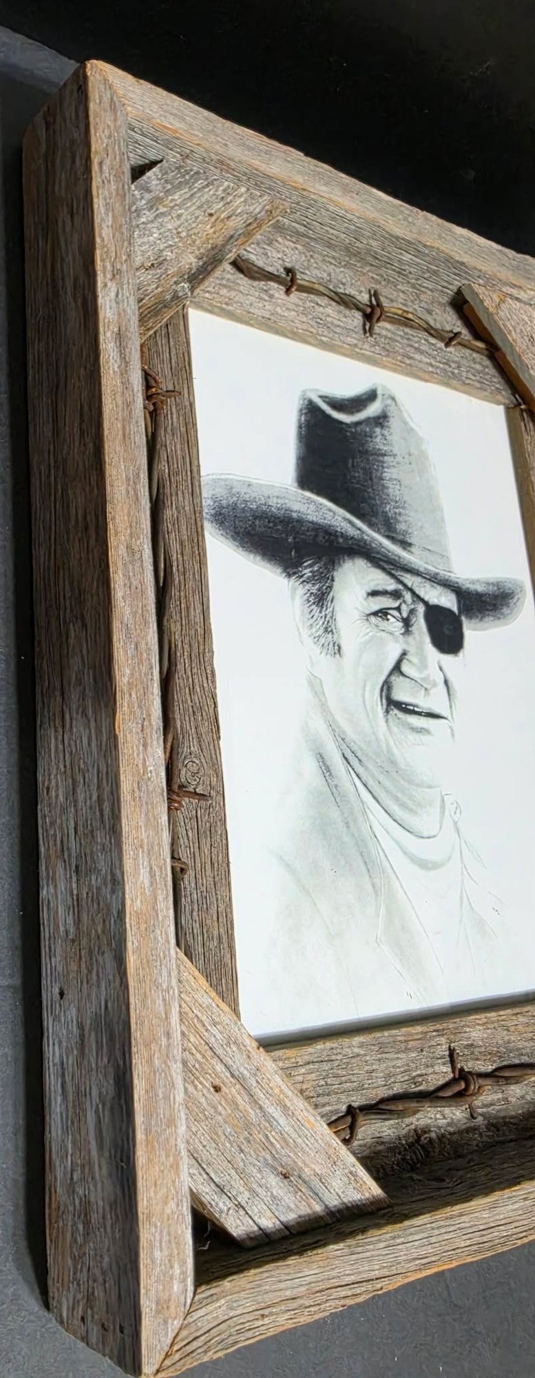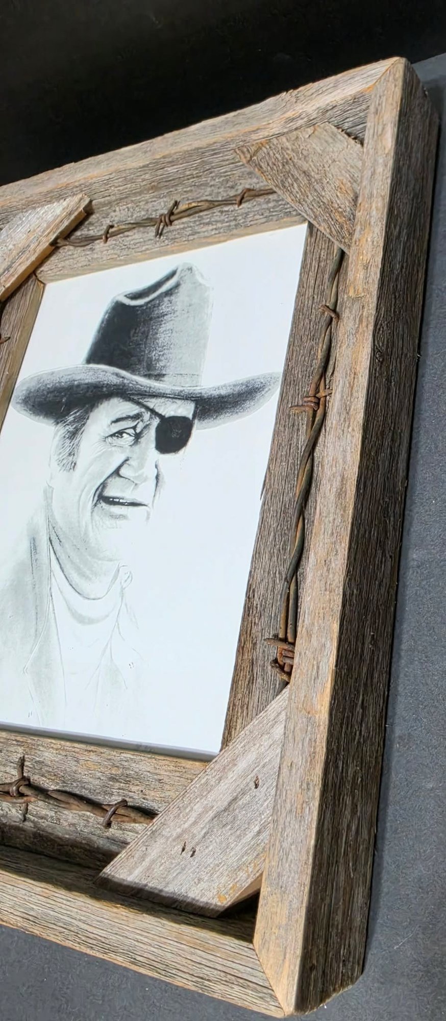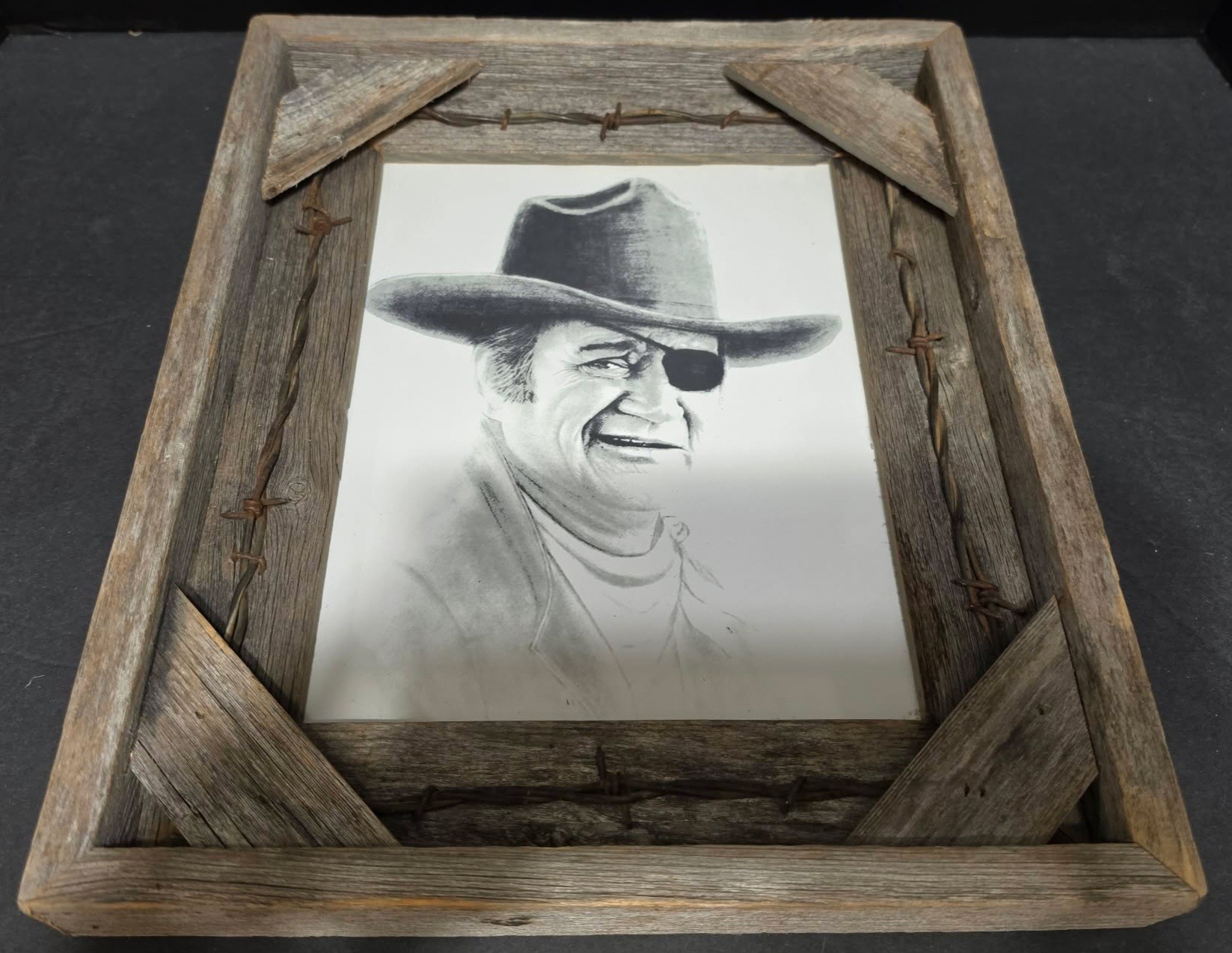 Framed black and white print of John Wayne as Rooster Cogburn from the 1969 film "True Grit. Measures 12 x 14 x 1.75.