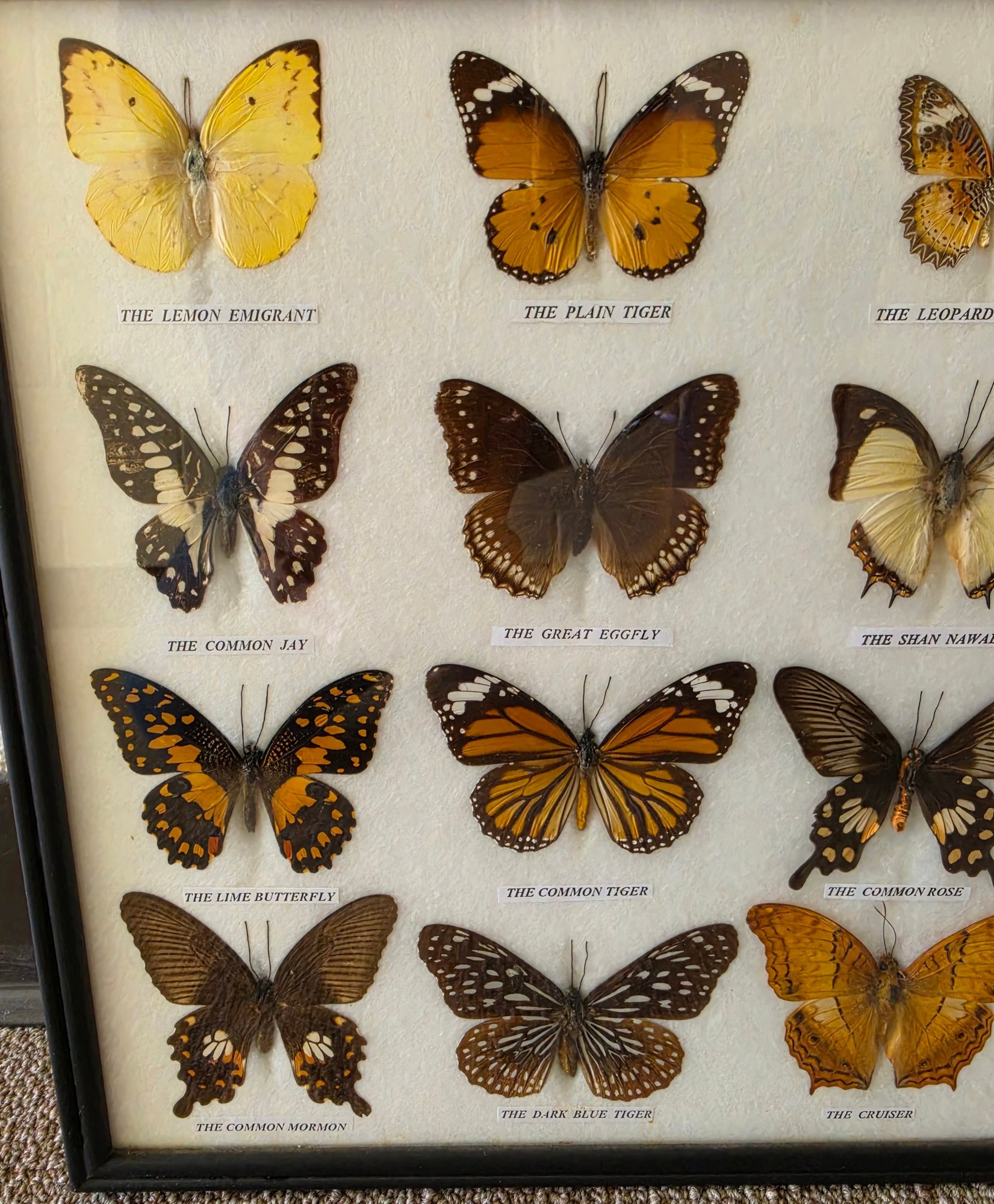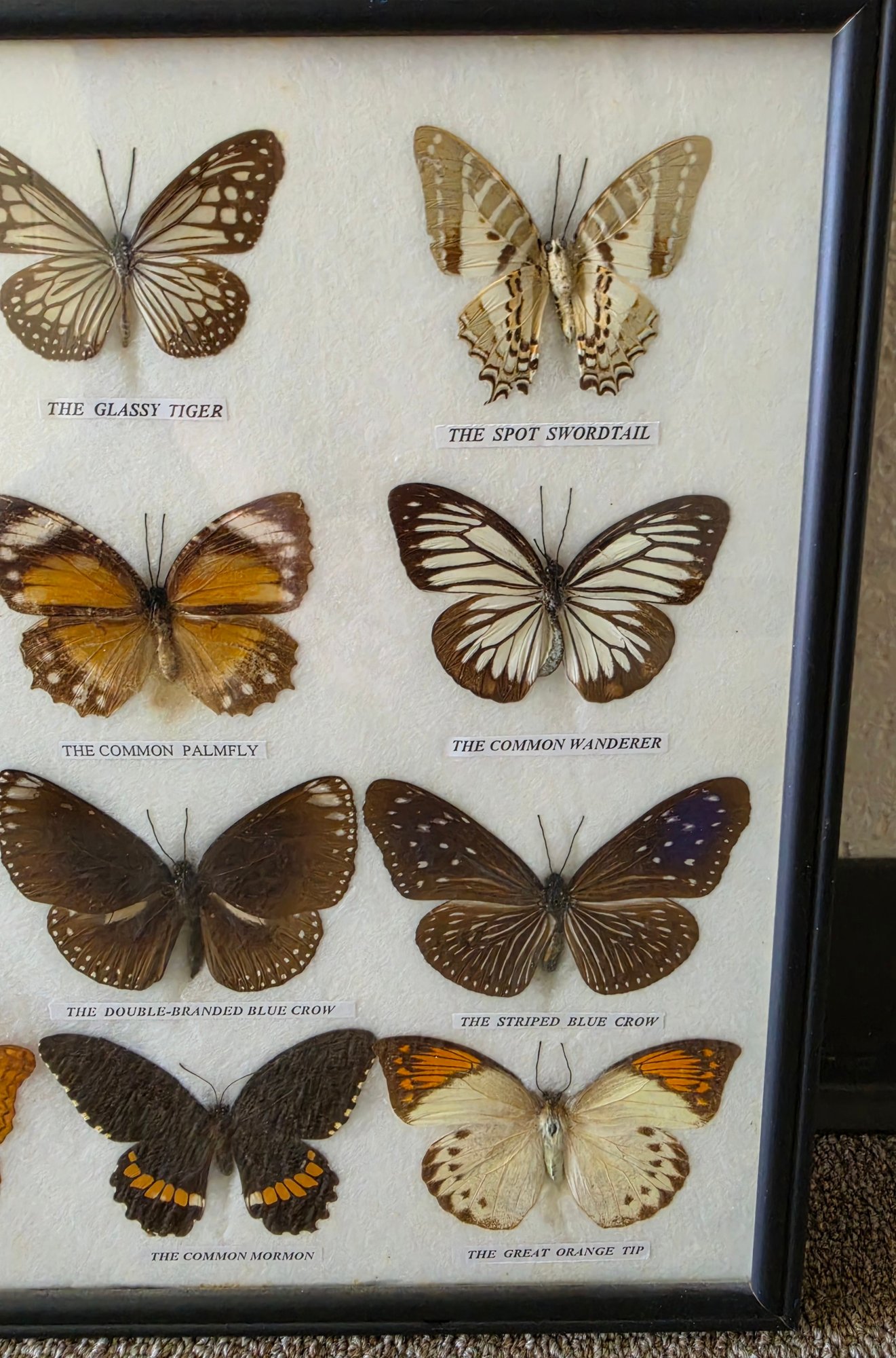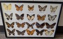 Framed collection of 20 butterfly specimens, meticulously arranged and labeled. Measures 18.75 x 12.75. Please see all pics for details