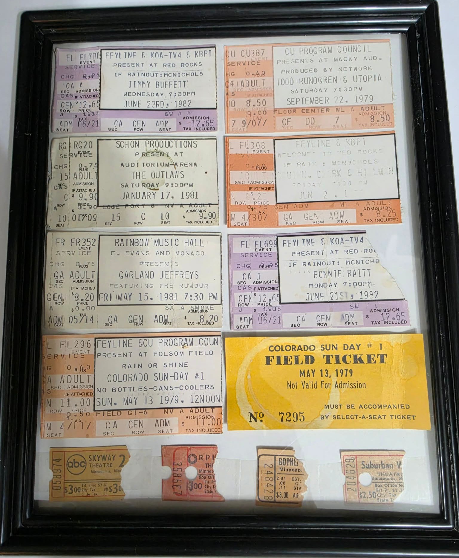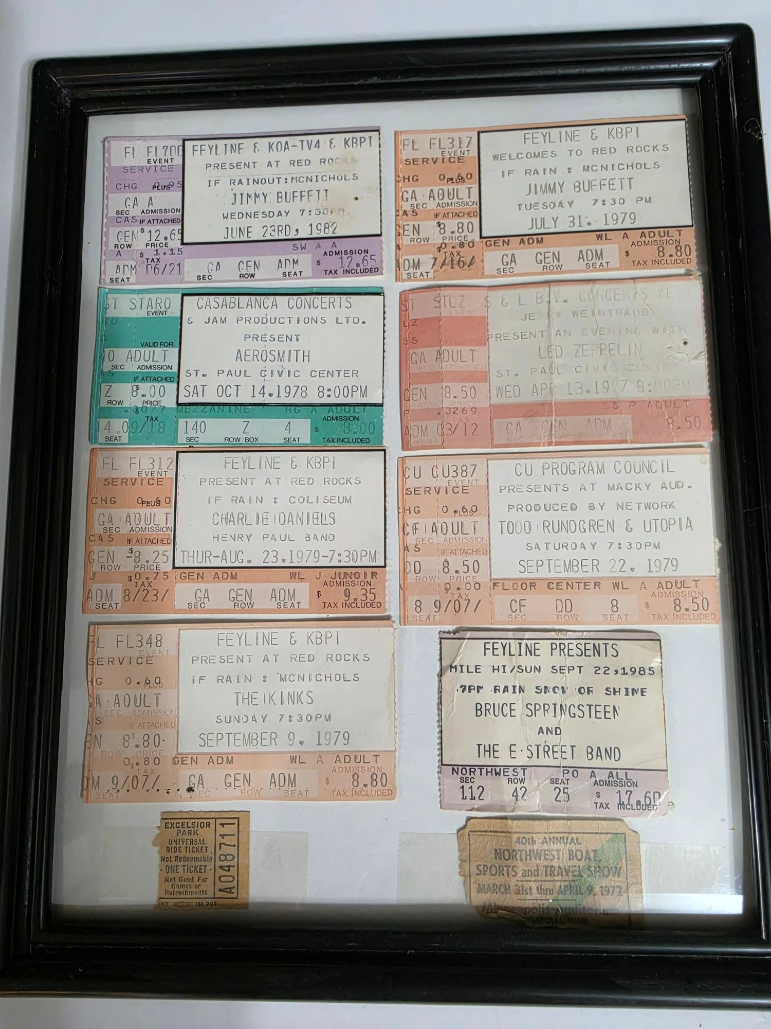 Framed collection of vintage concert ticket stubs from the late 1970s and early 1980s.