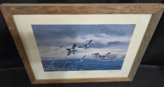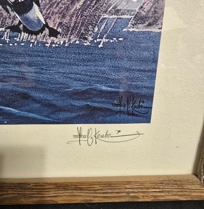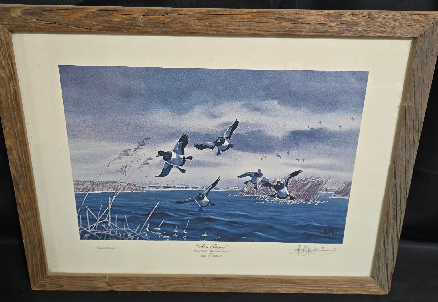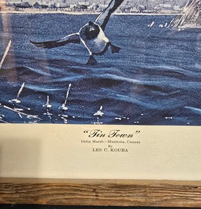 Frames limited edition print titled "Tin Town" Bluebill Ducks, featuring wildlife art by Les Kouba. Measures 17 x 13.