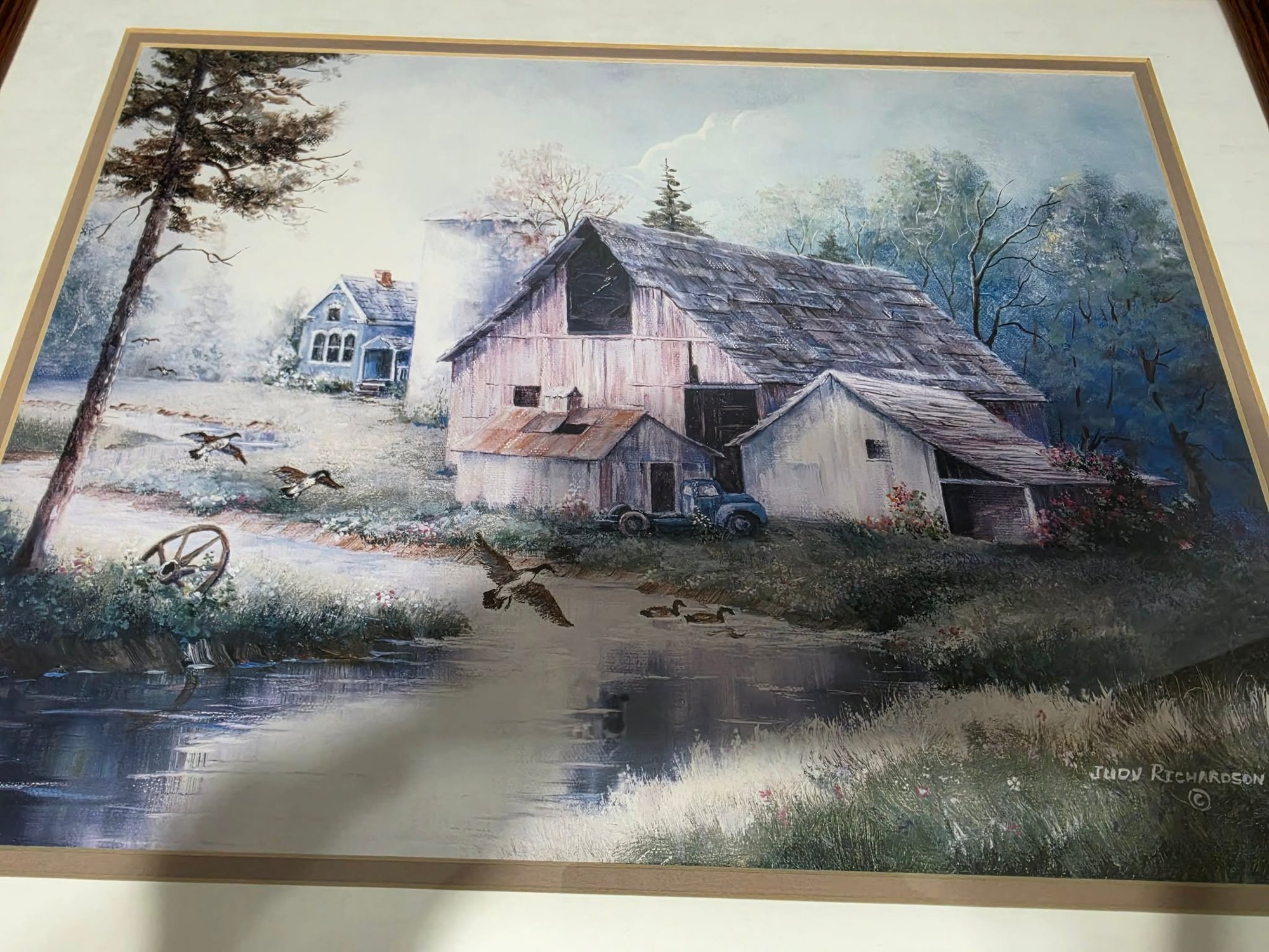 Framed print featuring a rural barn scene. Measures 23 x 19.