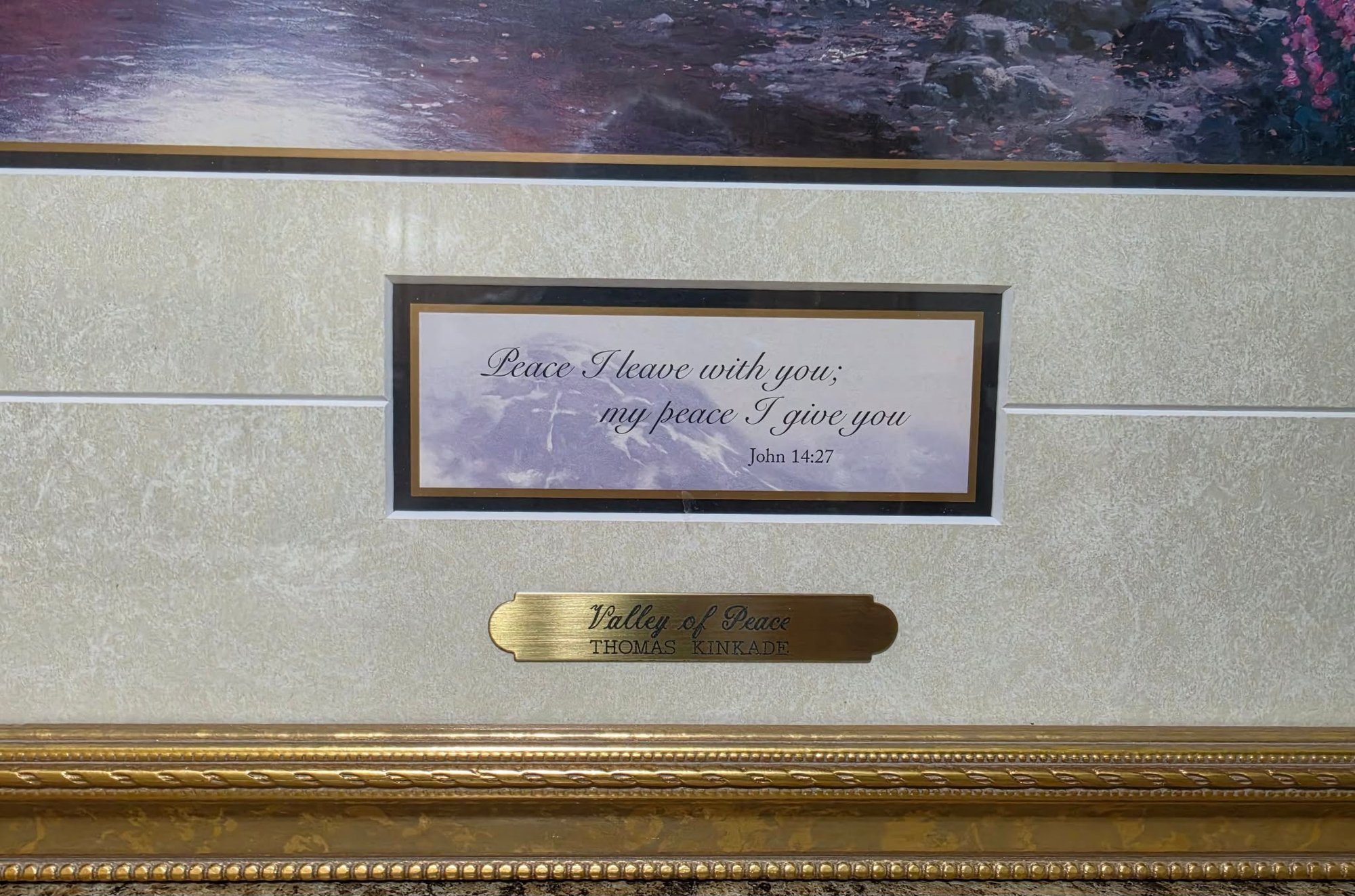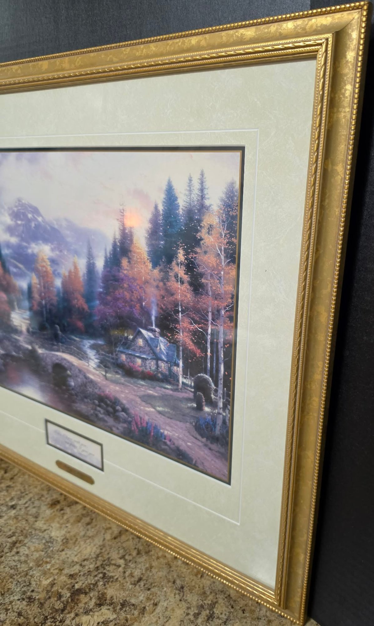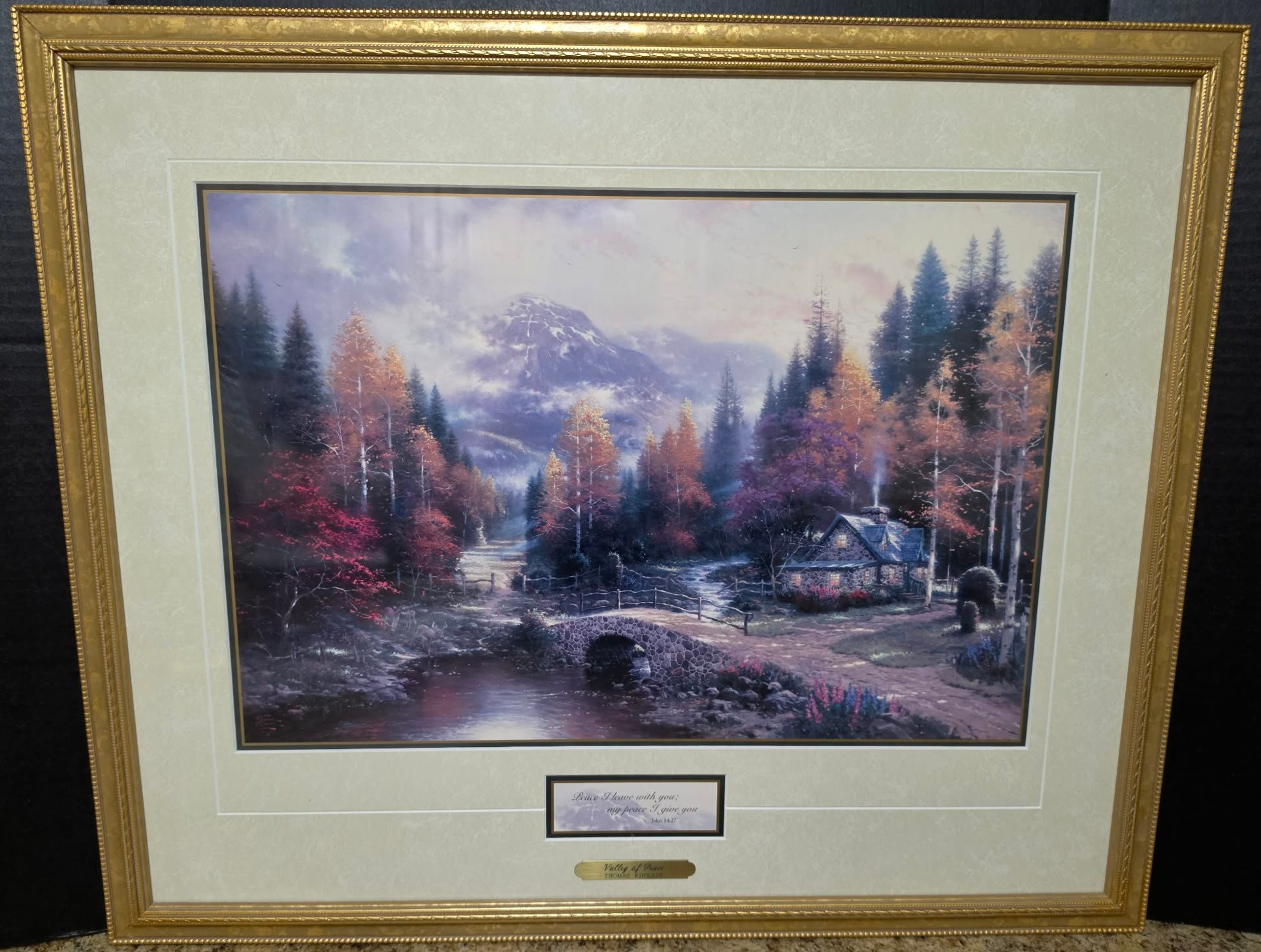 Framed "The Valley of Peace" art print by Thomas Kinkade. Has certificate of authenticity. Measures 26 x 21.5.