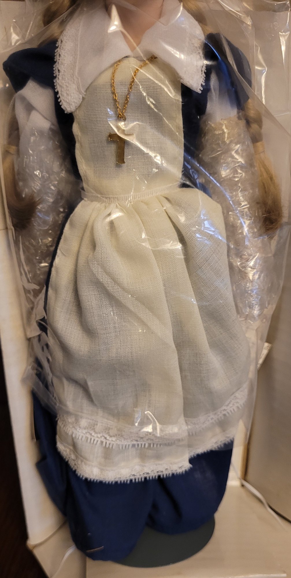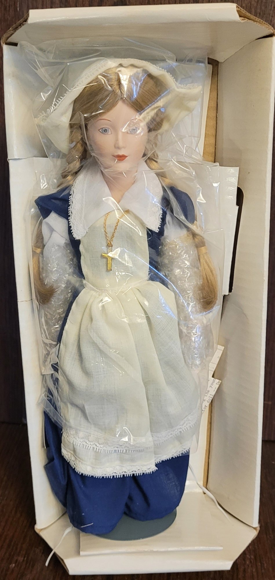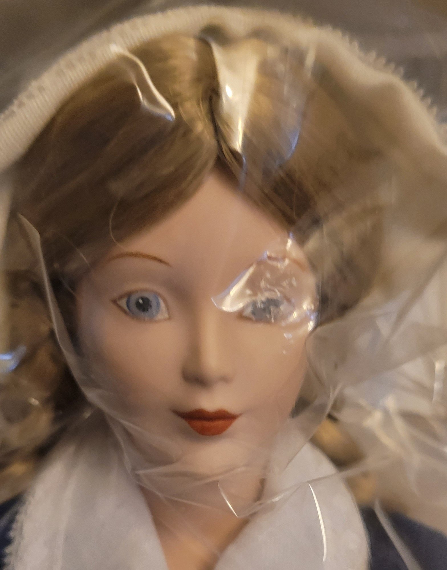 This porcelain doll measures about 12" tall. This is in like new condition. Comes in the original box. See pictures for details.
