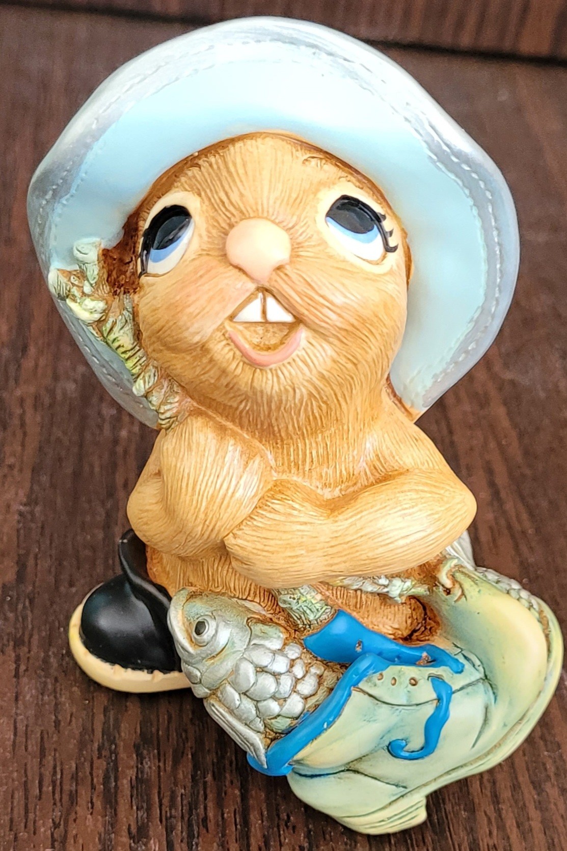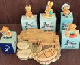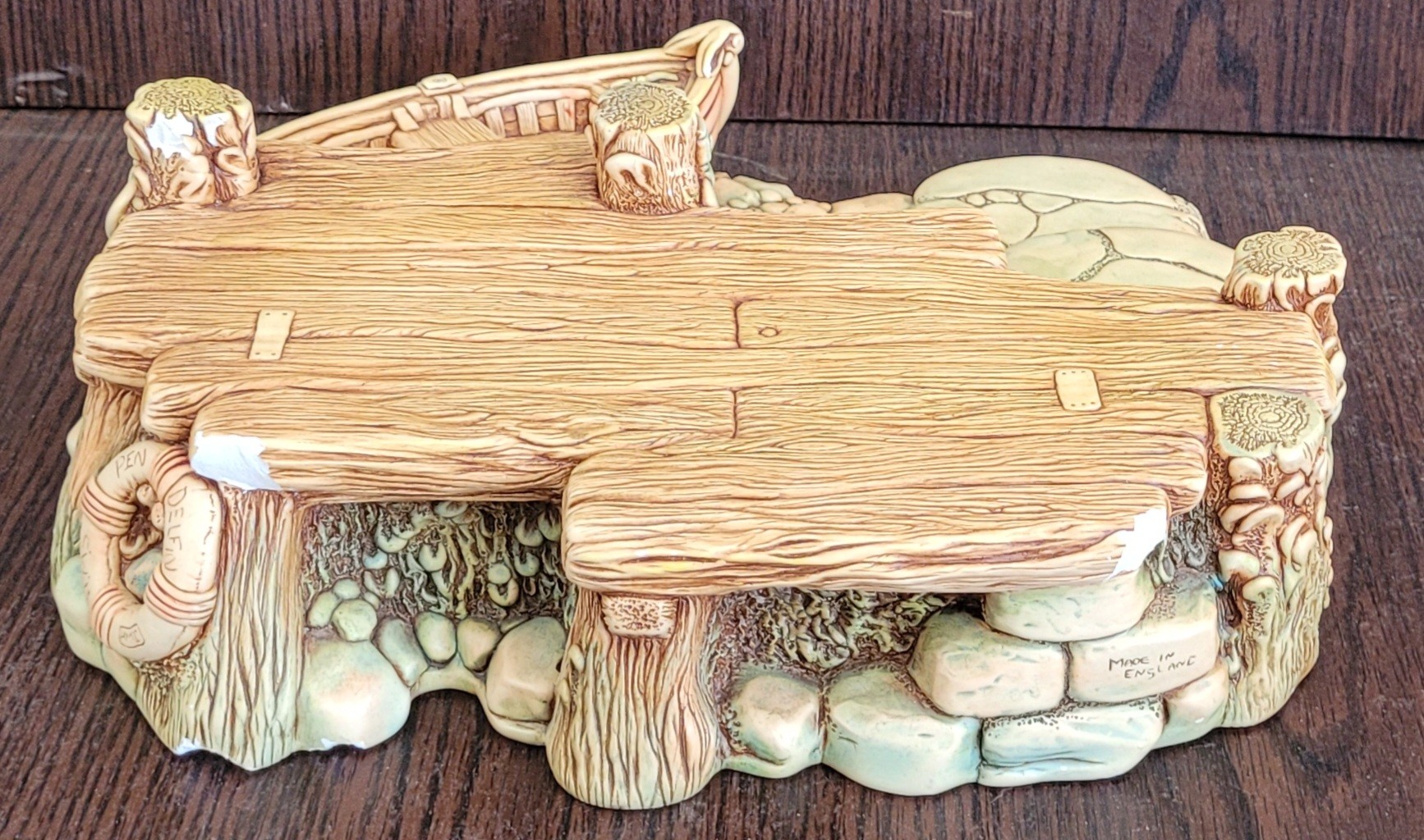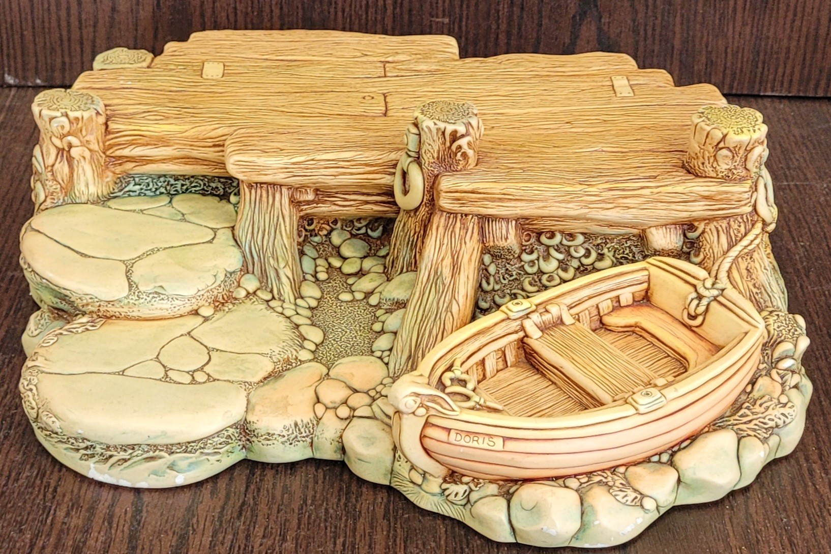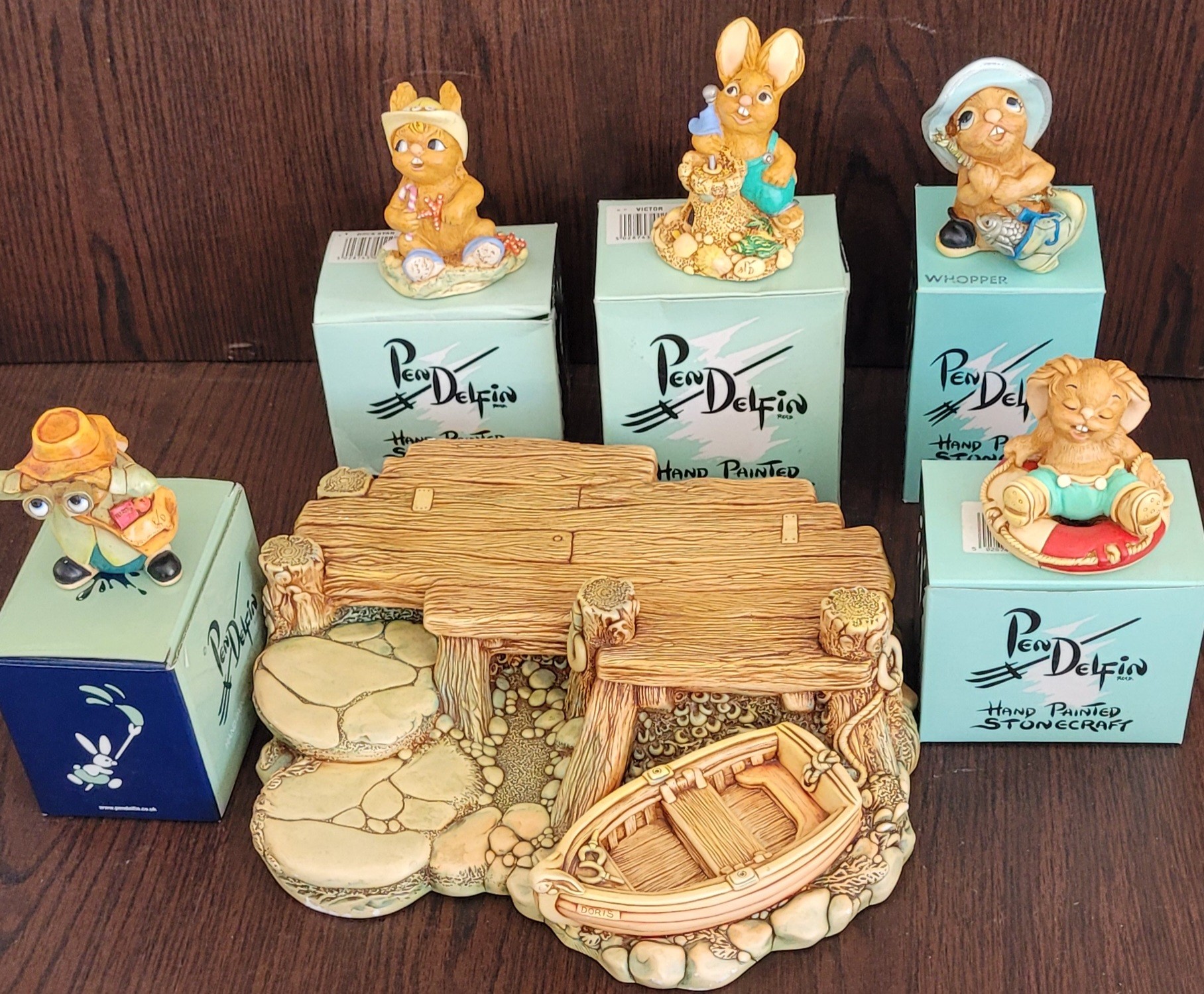 The rabbits come in the original boxes. The boat dock doesn't have the original box. It measures 12.5" long by 12" wide by 4" tall. It does have some large chips out of it but if someone could paint the spots it would look pretty good. One of the rabbits has had some repair done on its hat. See pictures for details.