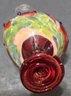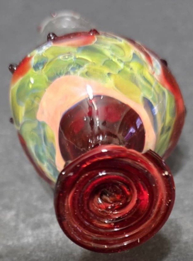Hand-blown art glass bud vase, measures 5.5h. Has a small chip on the base.