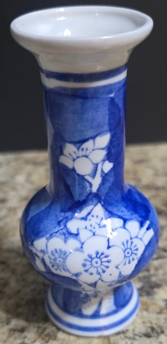 Hand Painted Chinese Blue And White Mini Porcelain Vase 4 Inches Tall. No cracks or chips noted.