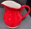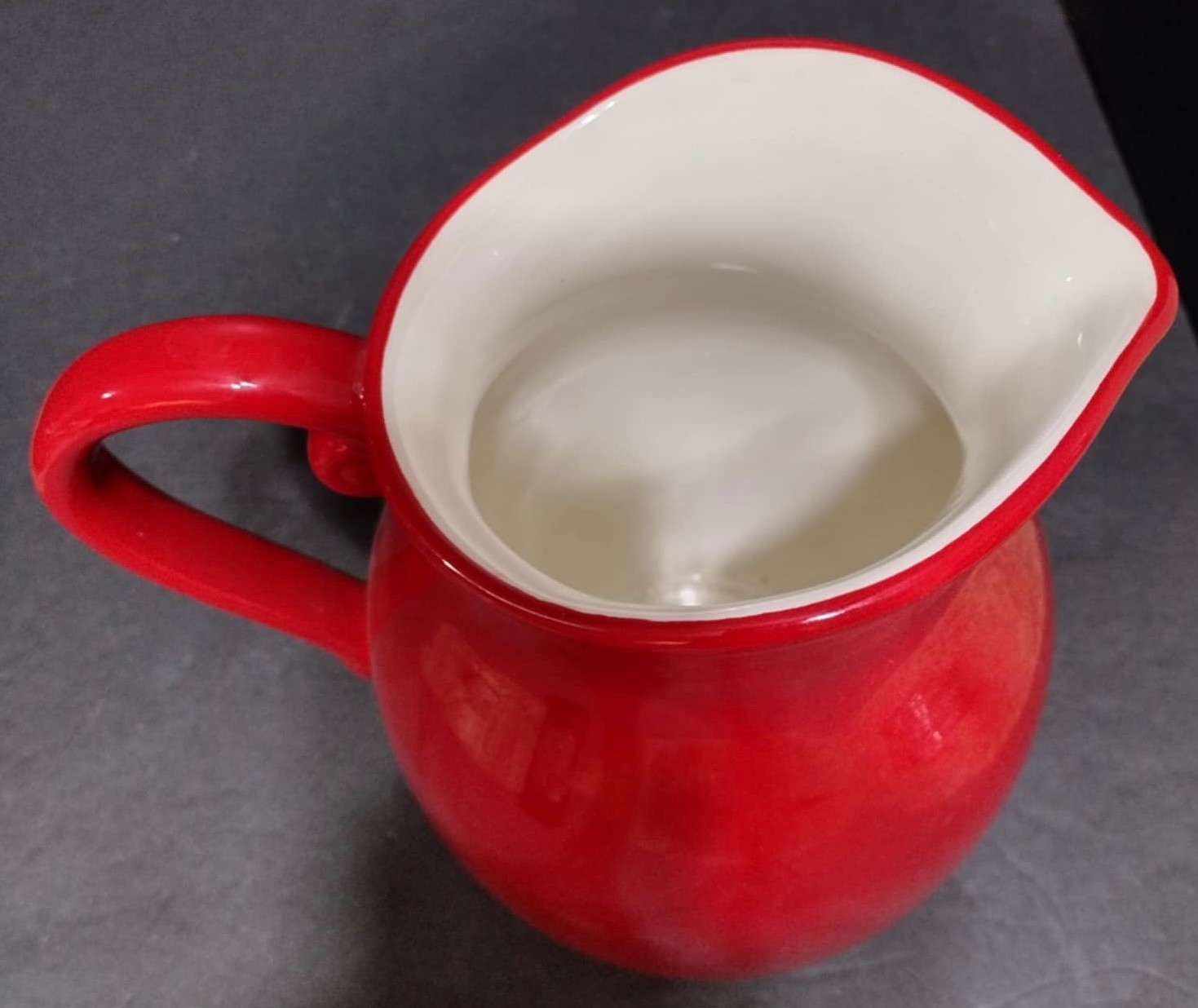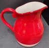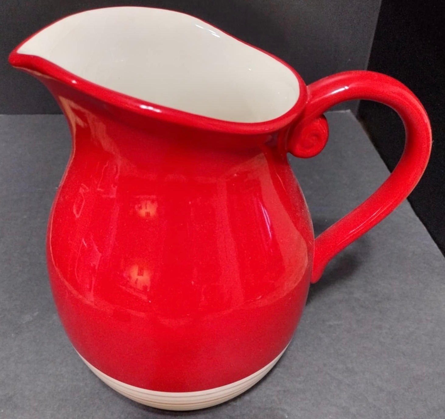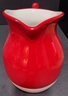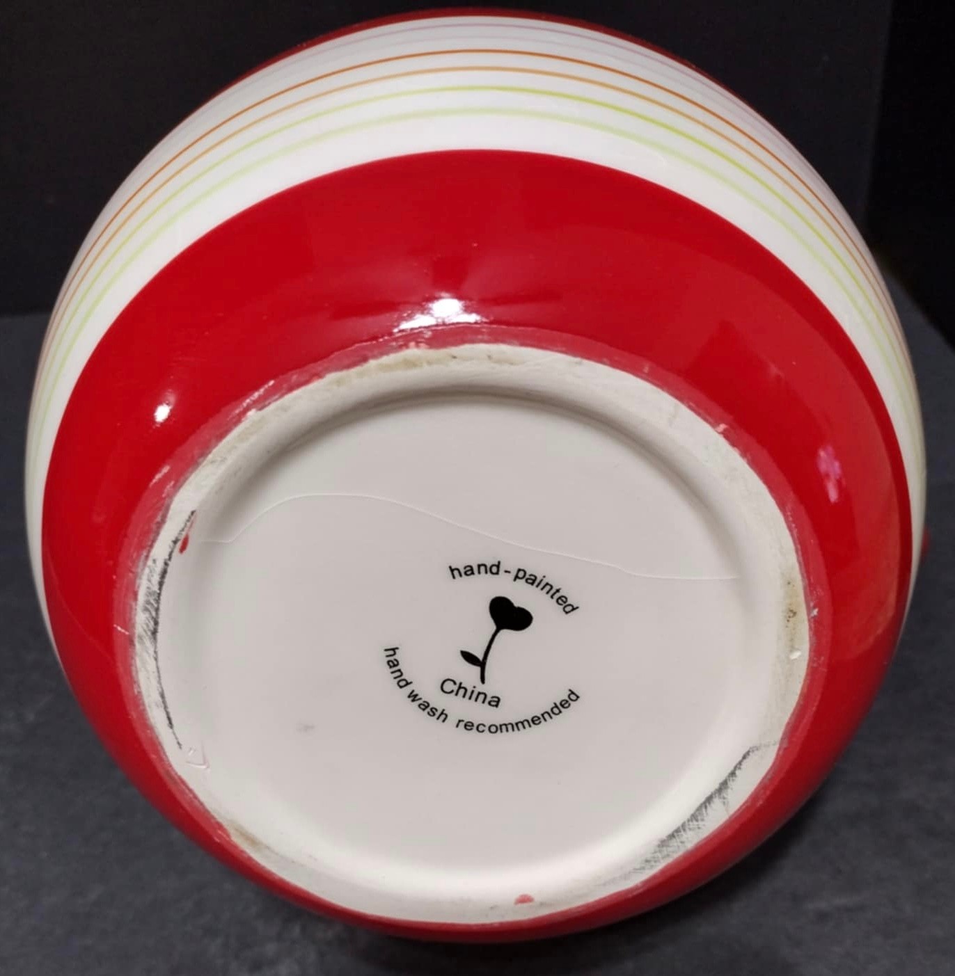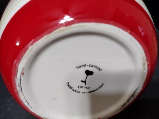 Hand-painted pitcher made in China. Looks like a crack on the bottom but not on the inside. Does hold water. Measure 9.5h x 9w with handle.