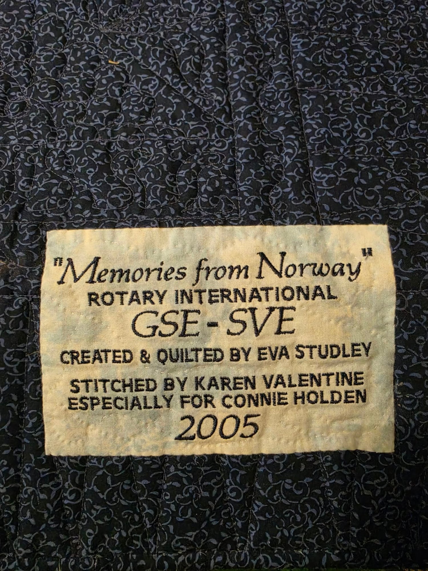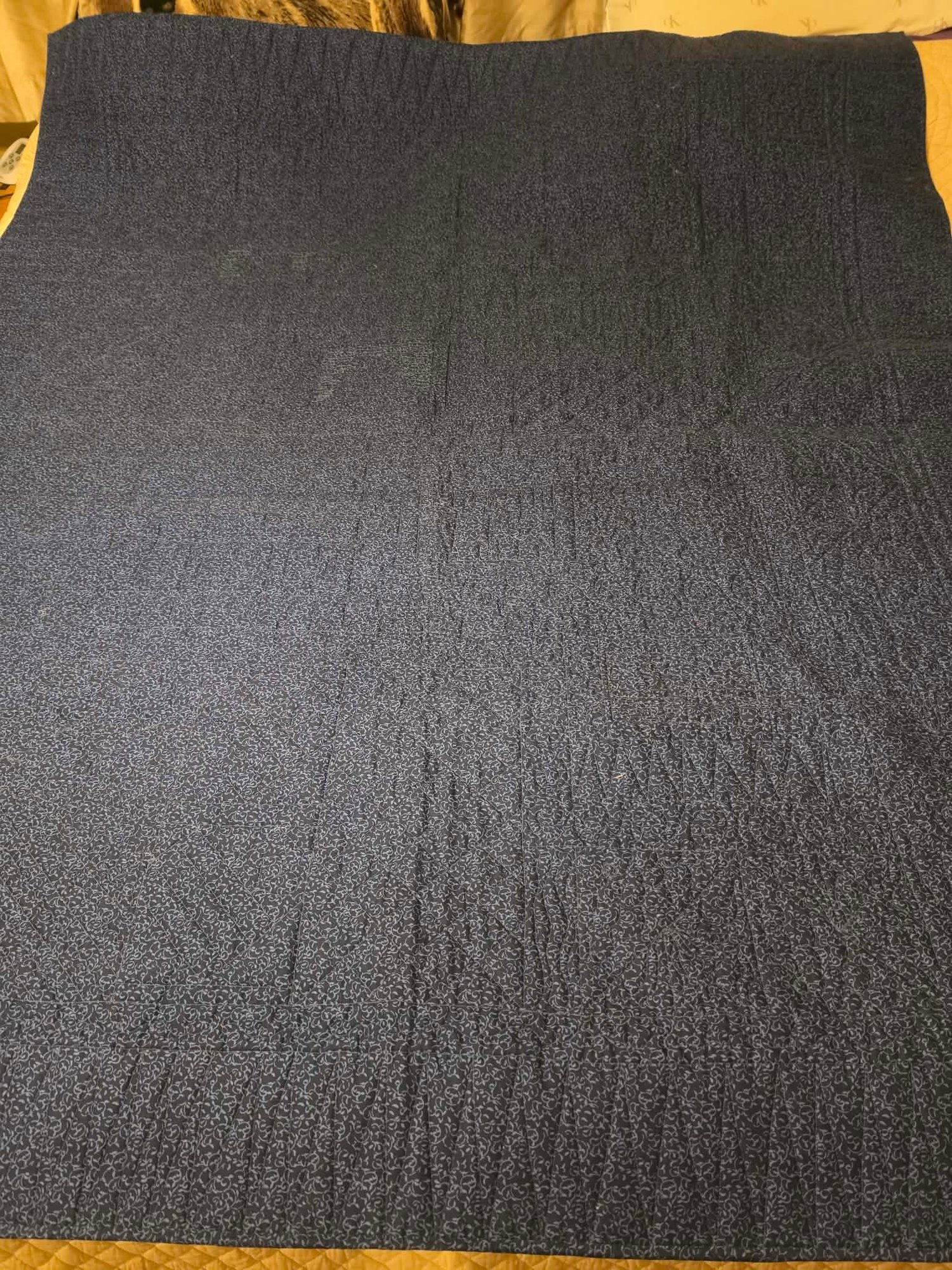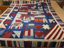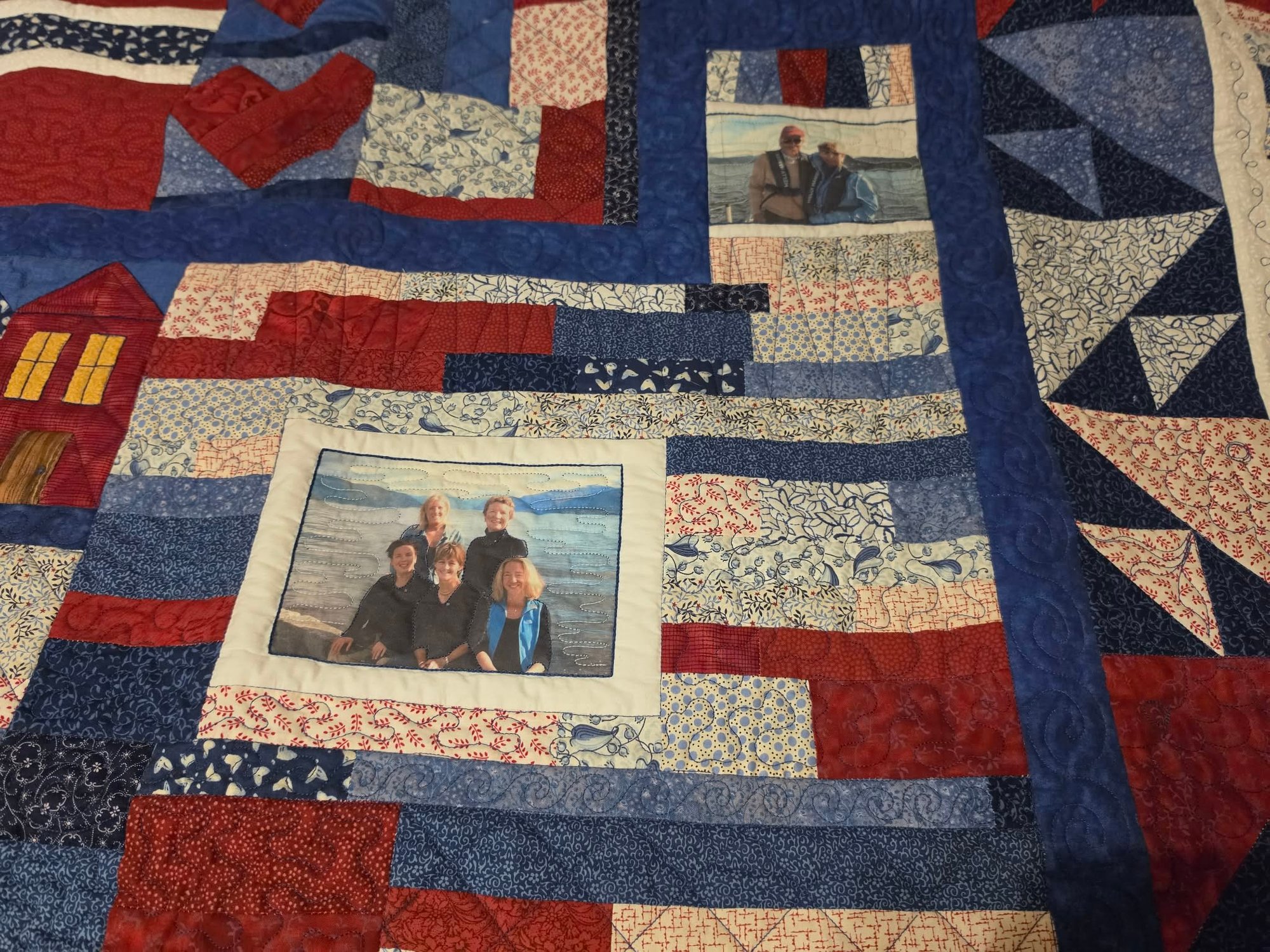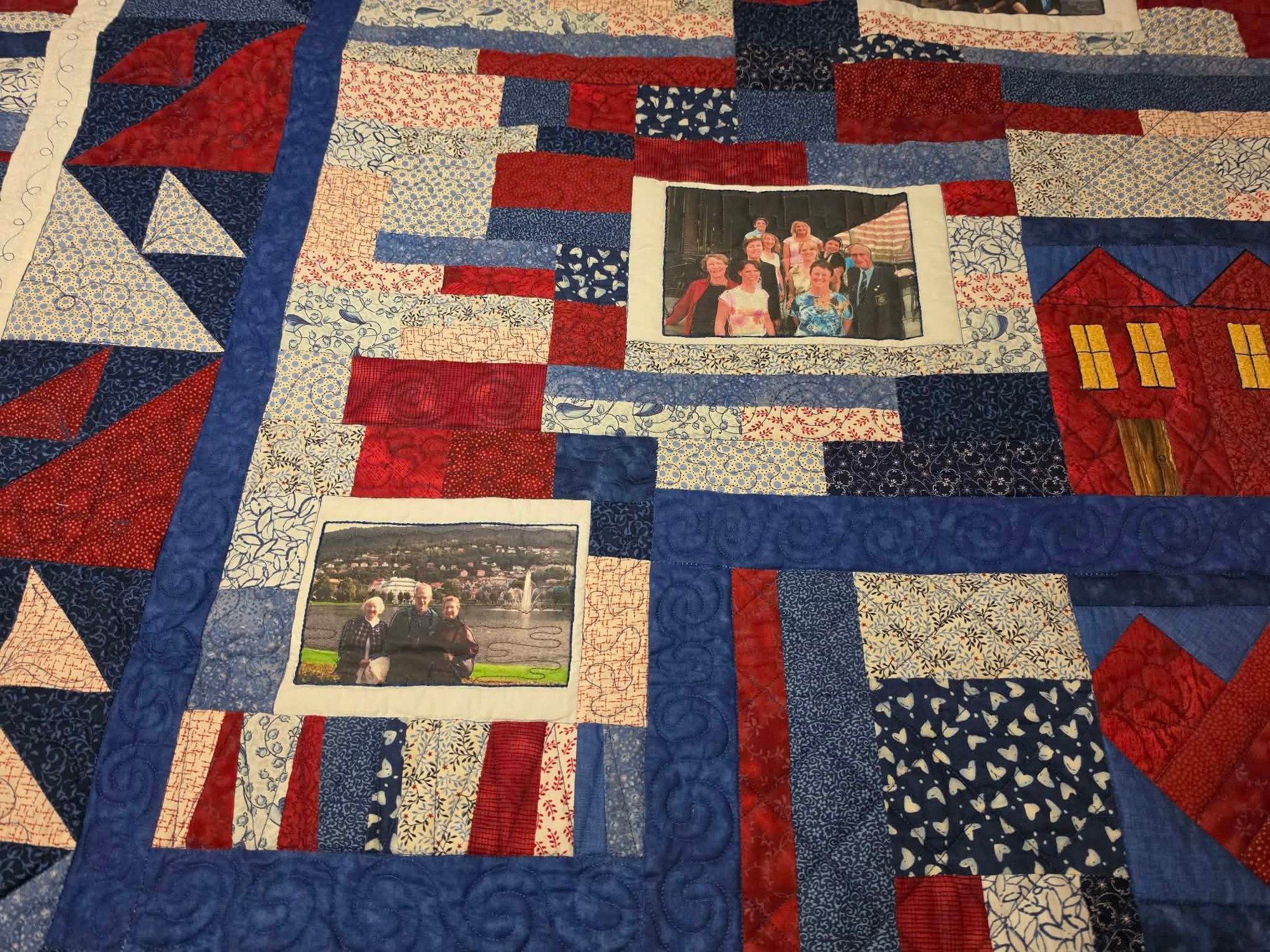 Handmade quilt with family pics stitched in. The right person might be able to remove and stitch in something else. Measures 59 x 70.