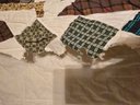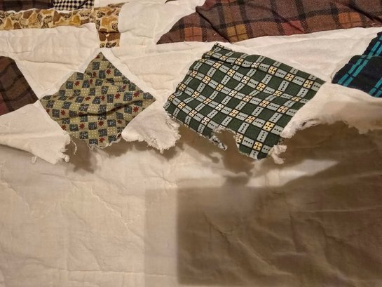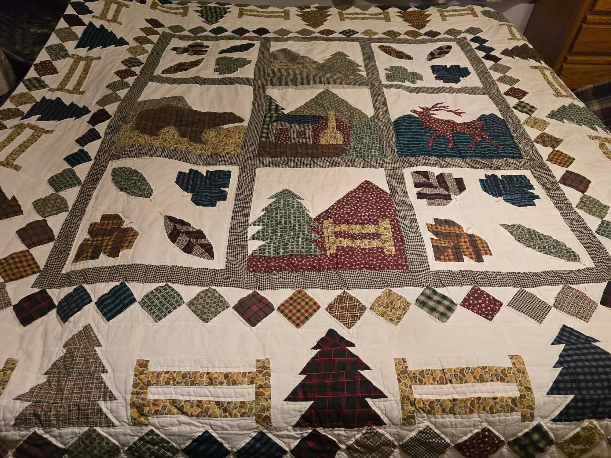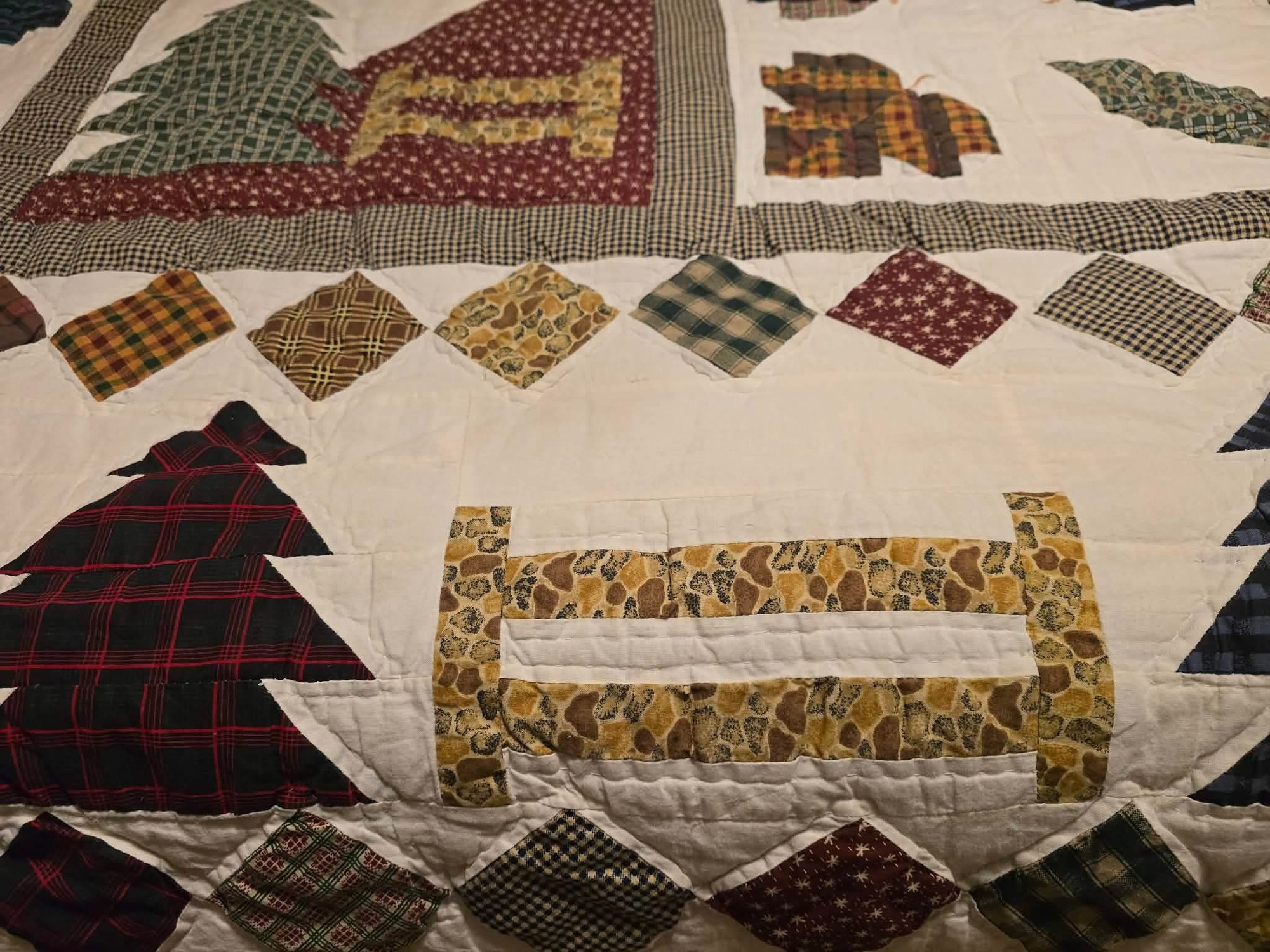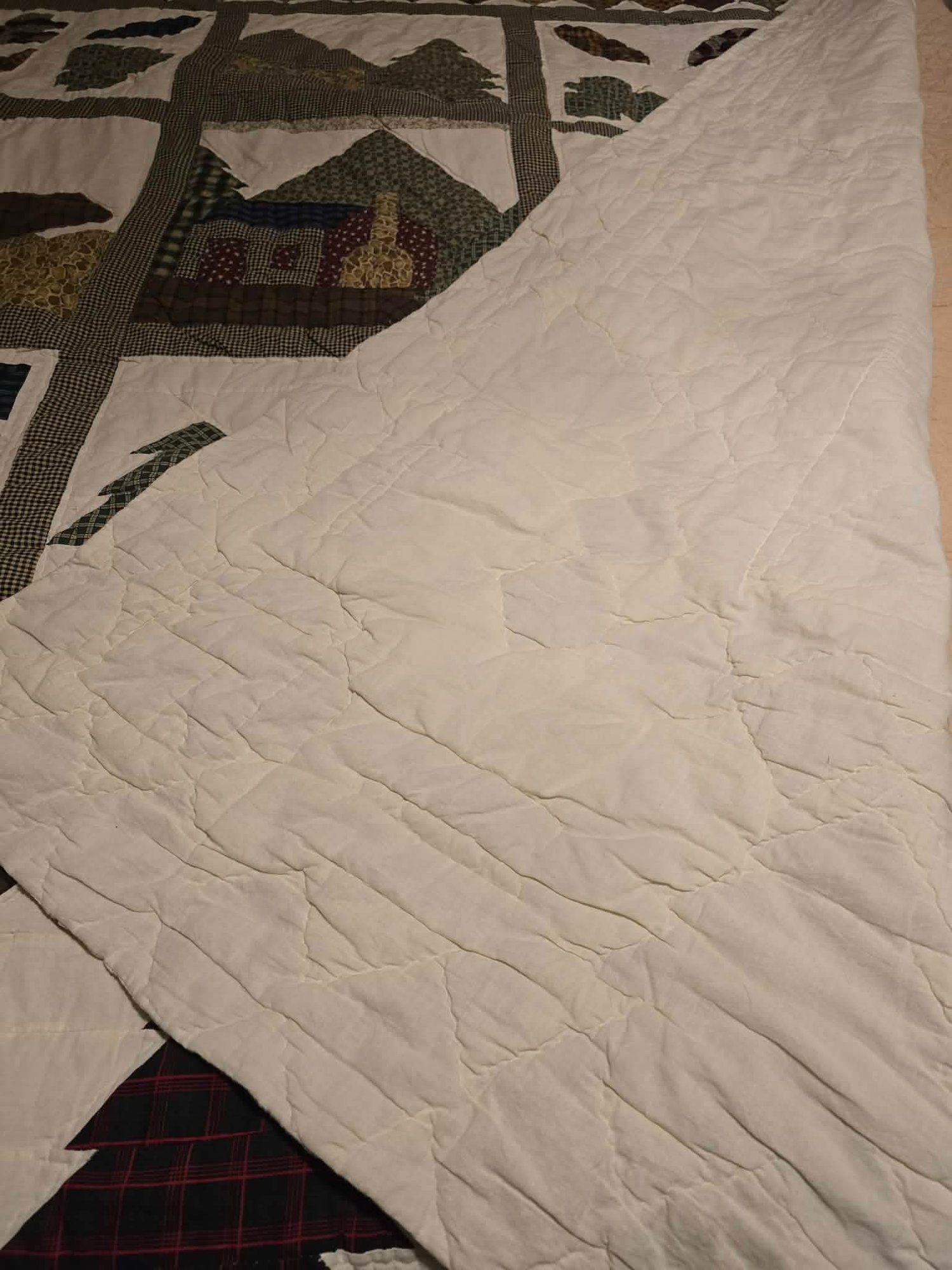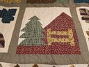 Hanging rustic cabin in the woods themed quilt is reminiscent of the "Be My Neighbor" quilt pattern. Has the sewn in holders for a hanging rod. Measures approximately 77 x 80. Has a torn spot on edge that could possibly be fixed.