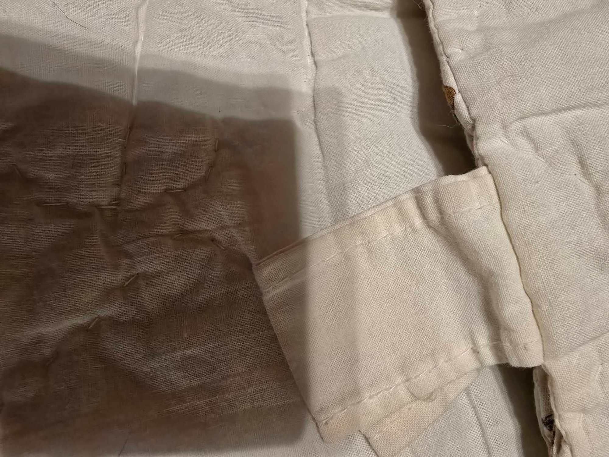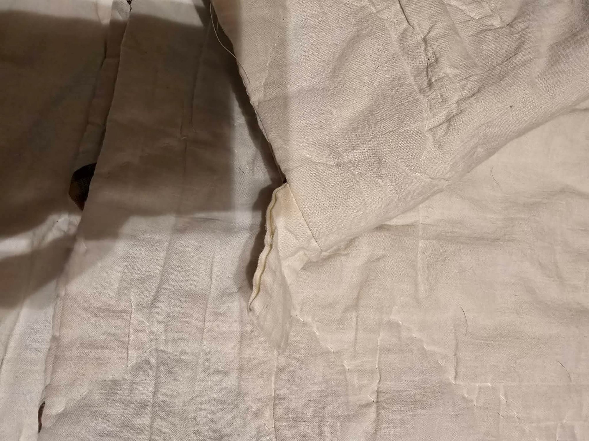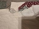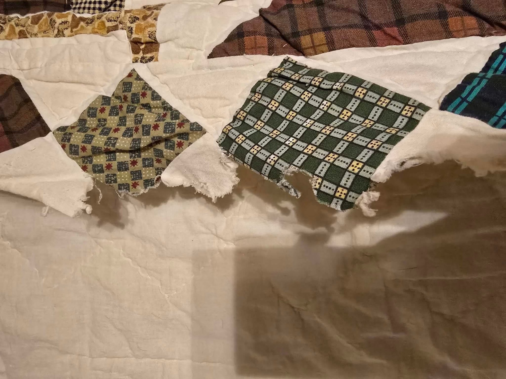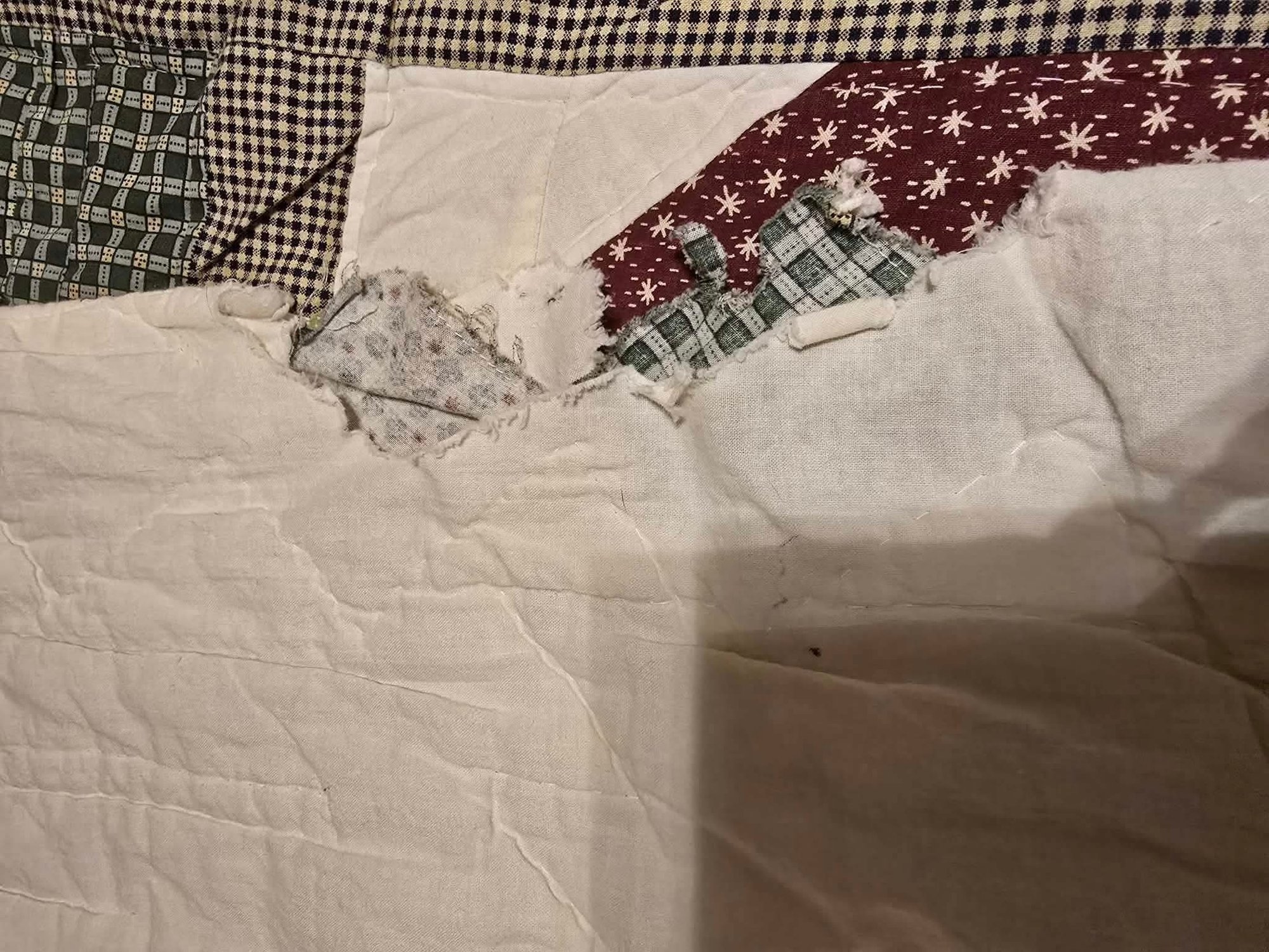 Hanging rustic cabin in the woods themed quilt is reminiscent of the "Be My Neighbor" quilt pattern. Has the sewn in holders for a hanging rod. Measures approximately 77 x 80. Has a torn spot on edge that could possibly be fixed.
