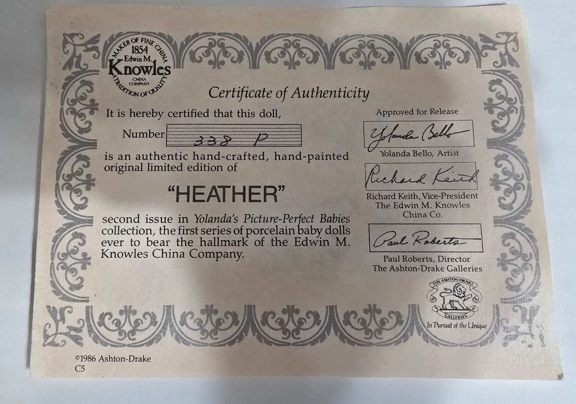 "Heather" porcelain baby doll from the "Yolanda's Picture-Perfect Babies" collection, No box. Please see all pics for details