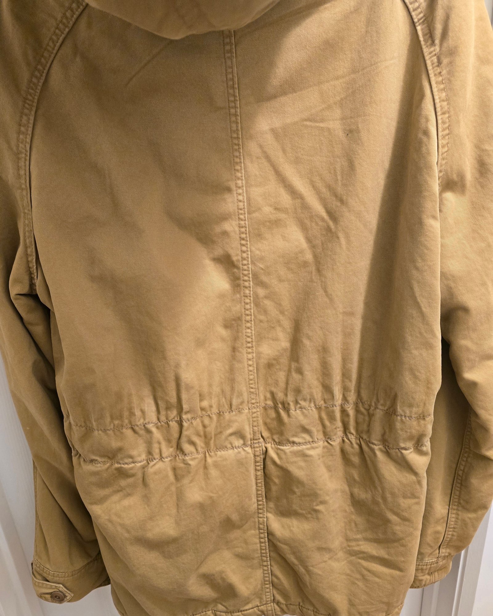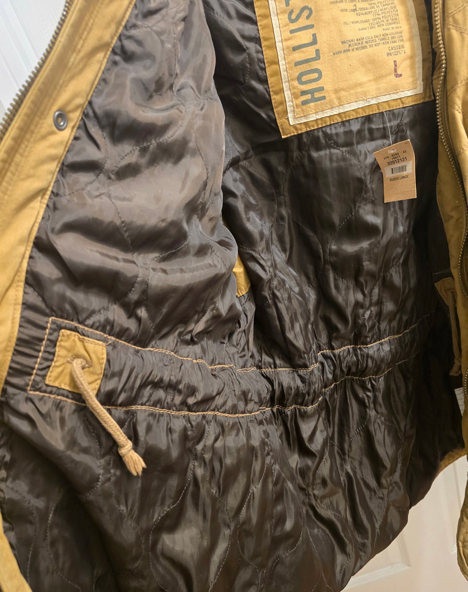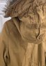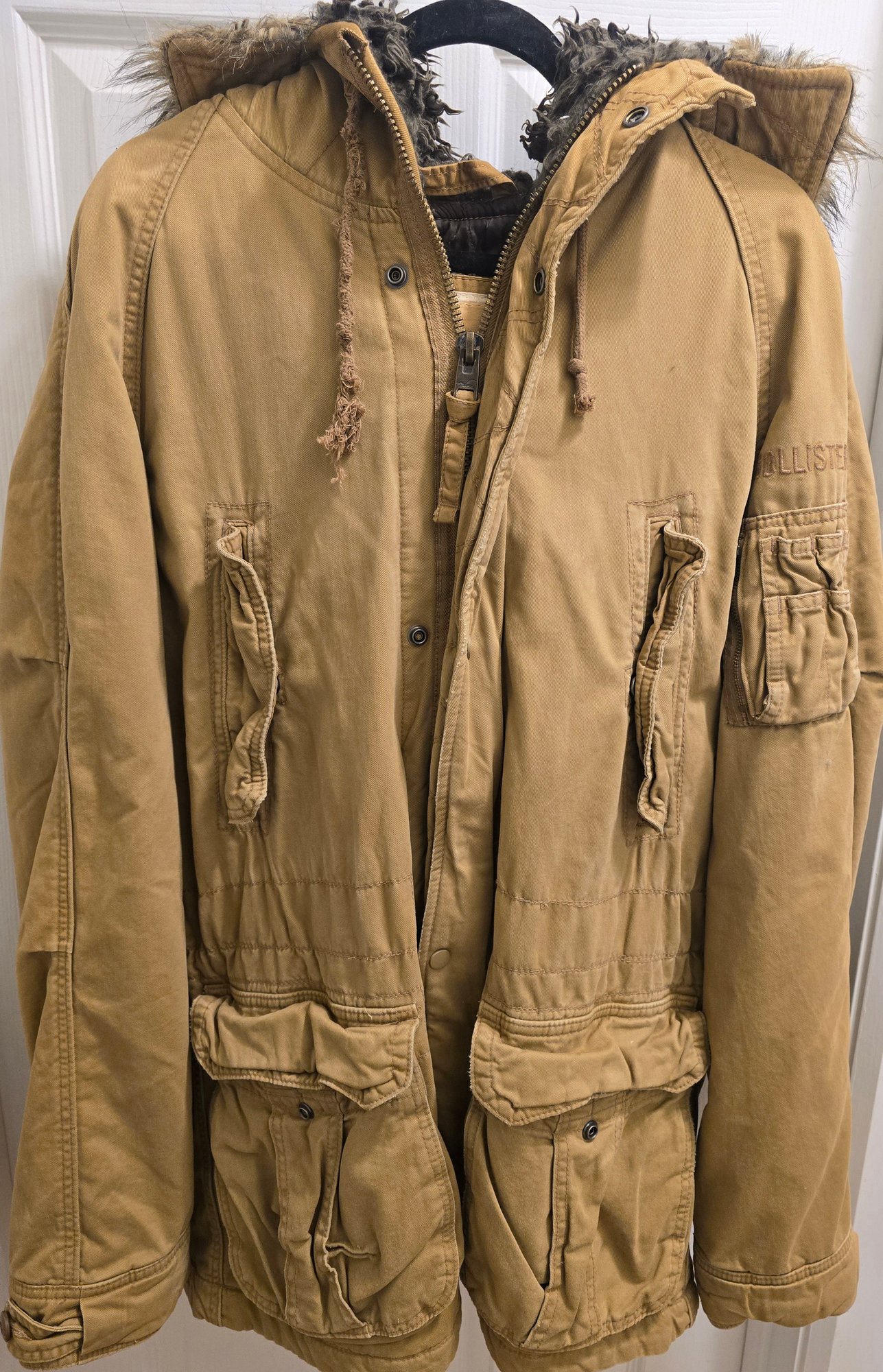 Hollister mens hooded military-style parka jacket with a tan outer shell. Size Large. Still has tag on it. Please see all pics for details.
