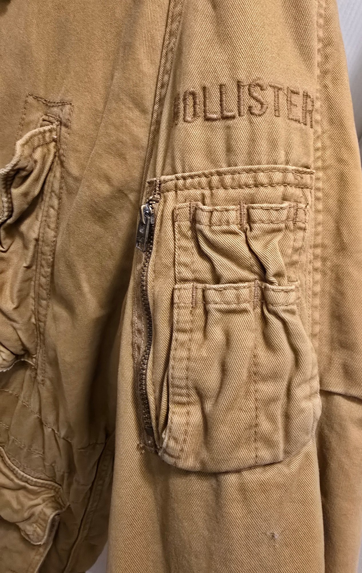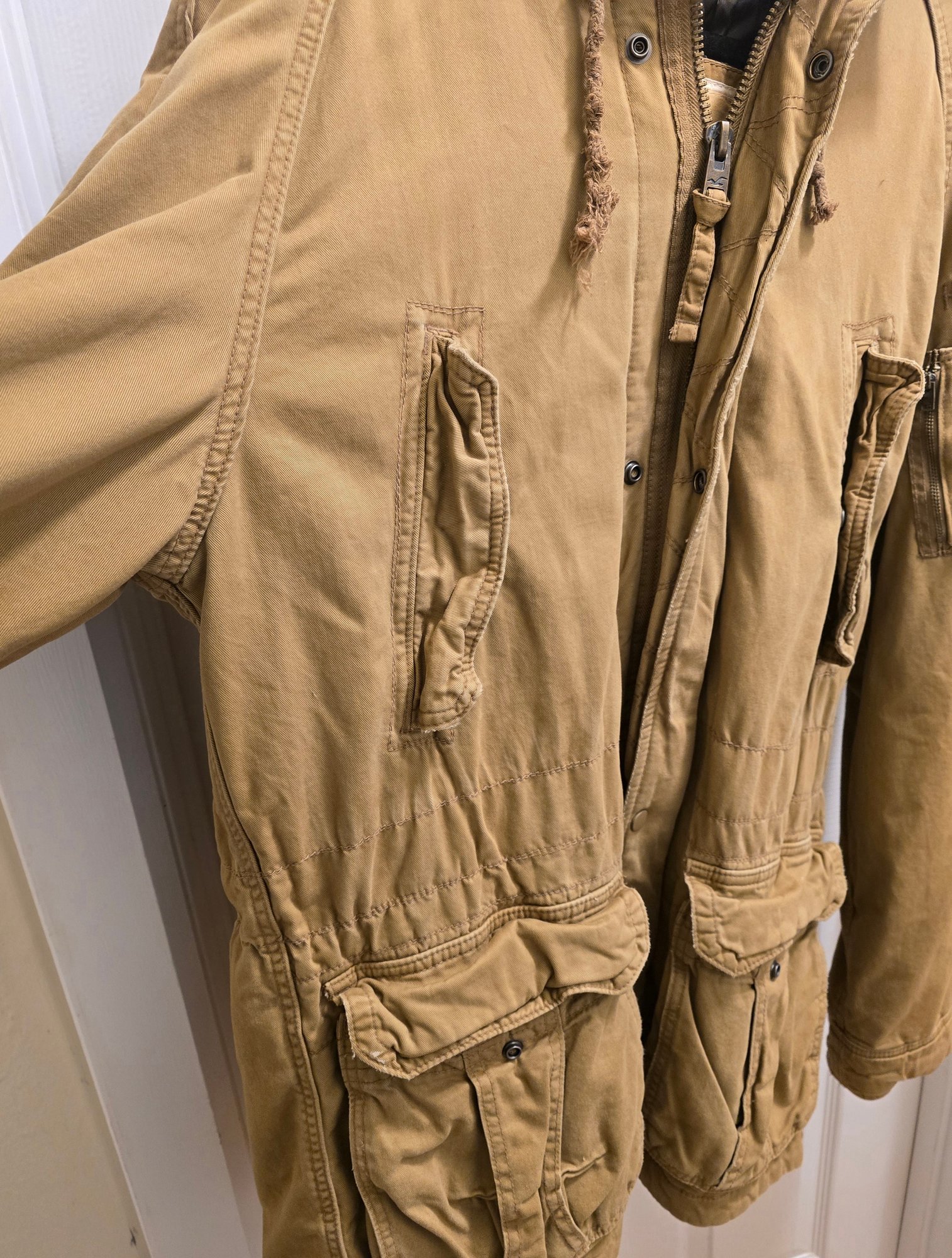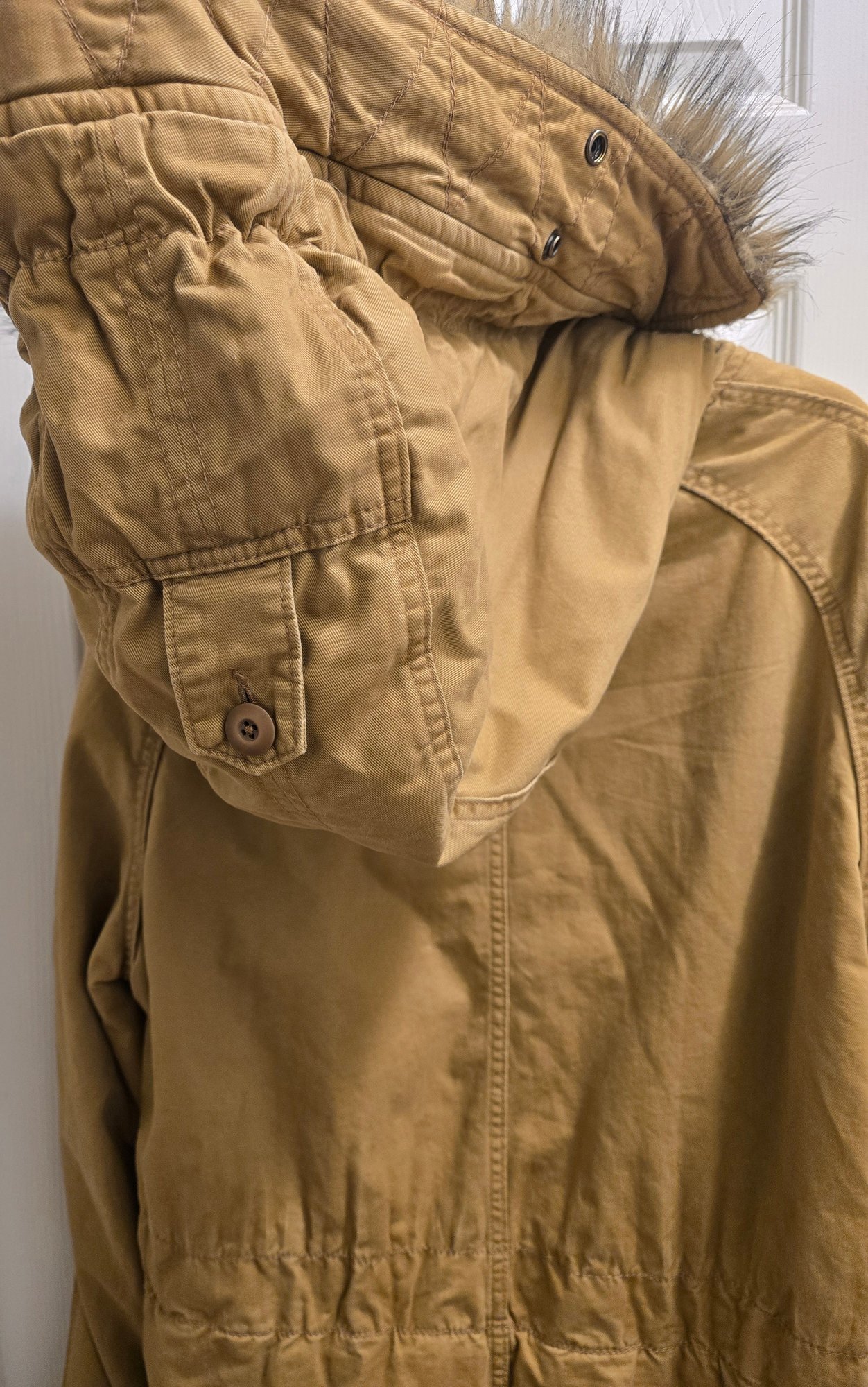 Hollister mens hooded military-style parka jacket with a tan outer shell. Size Large. Still has tag on it. Please see all pics for details.