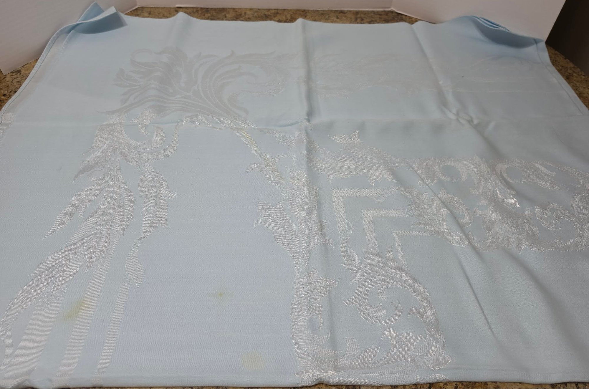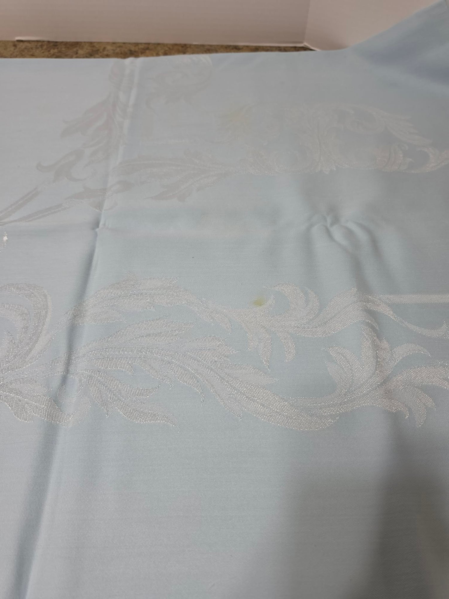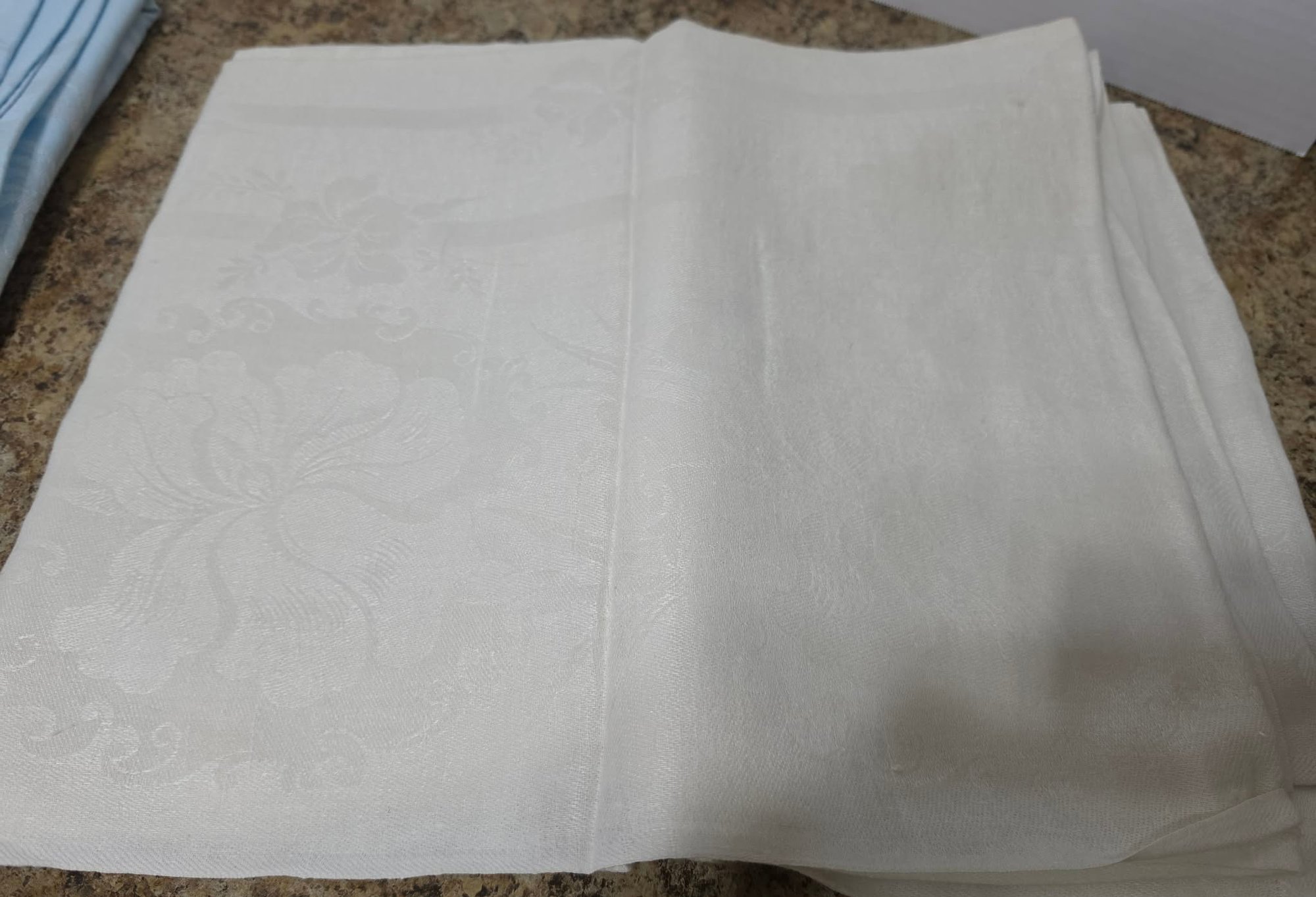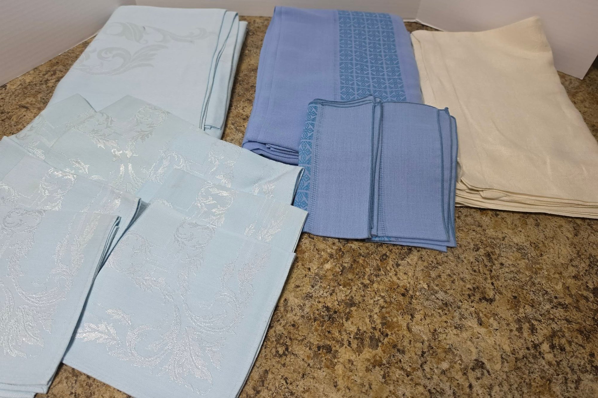Large Cloth Table Clothes & Napkins. Staining. Not sure if it can come out. Measures 74 x62 white, 60 x 120 darker blue and 74 x 60 light blue.