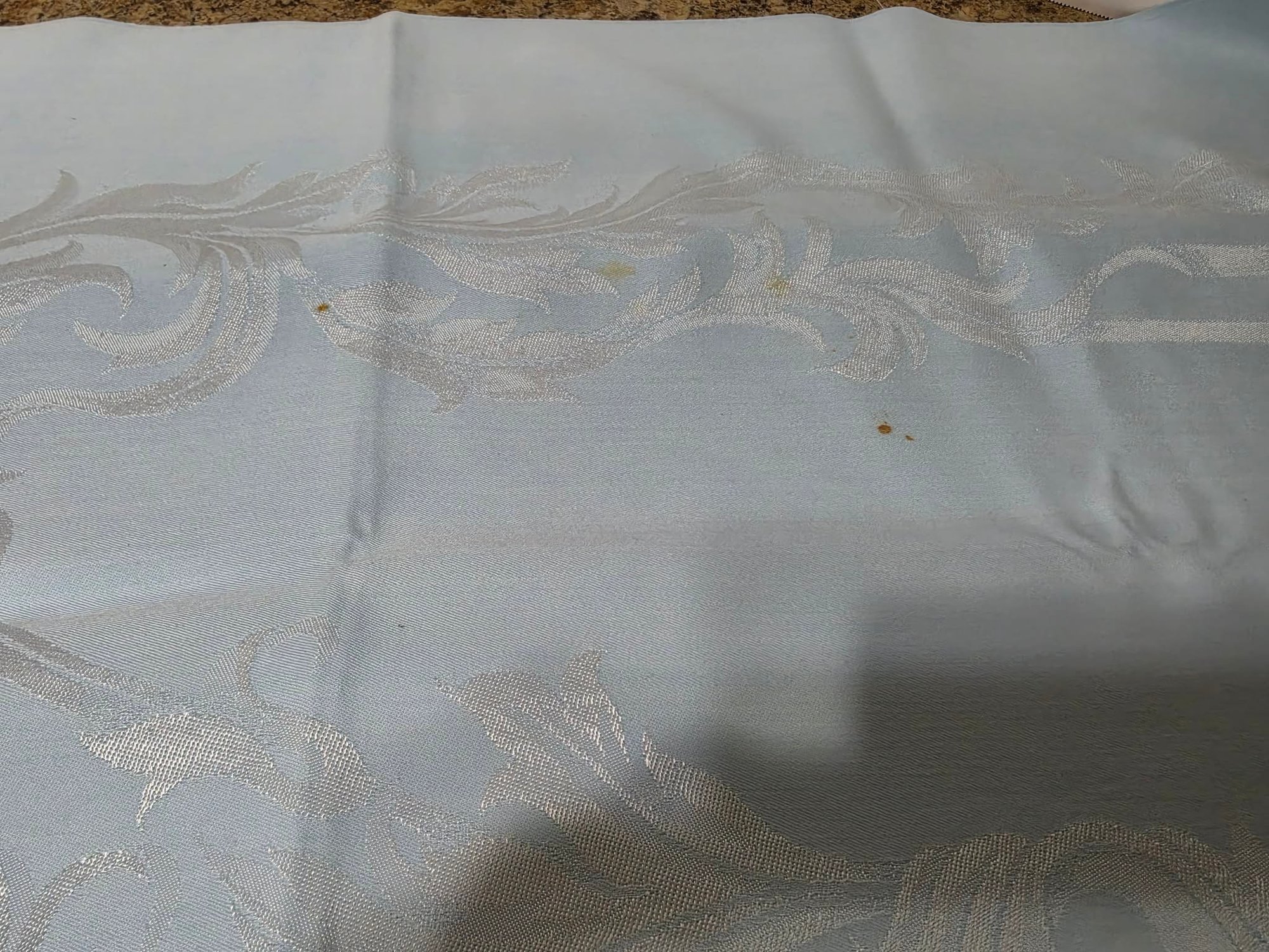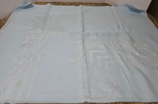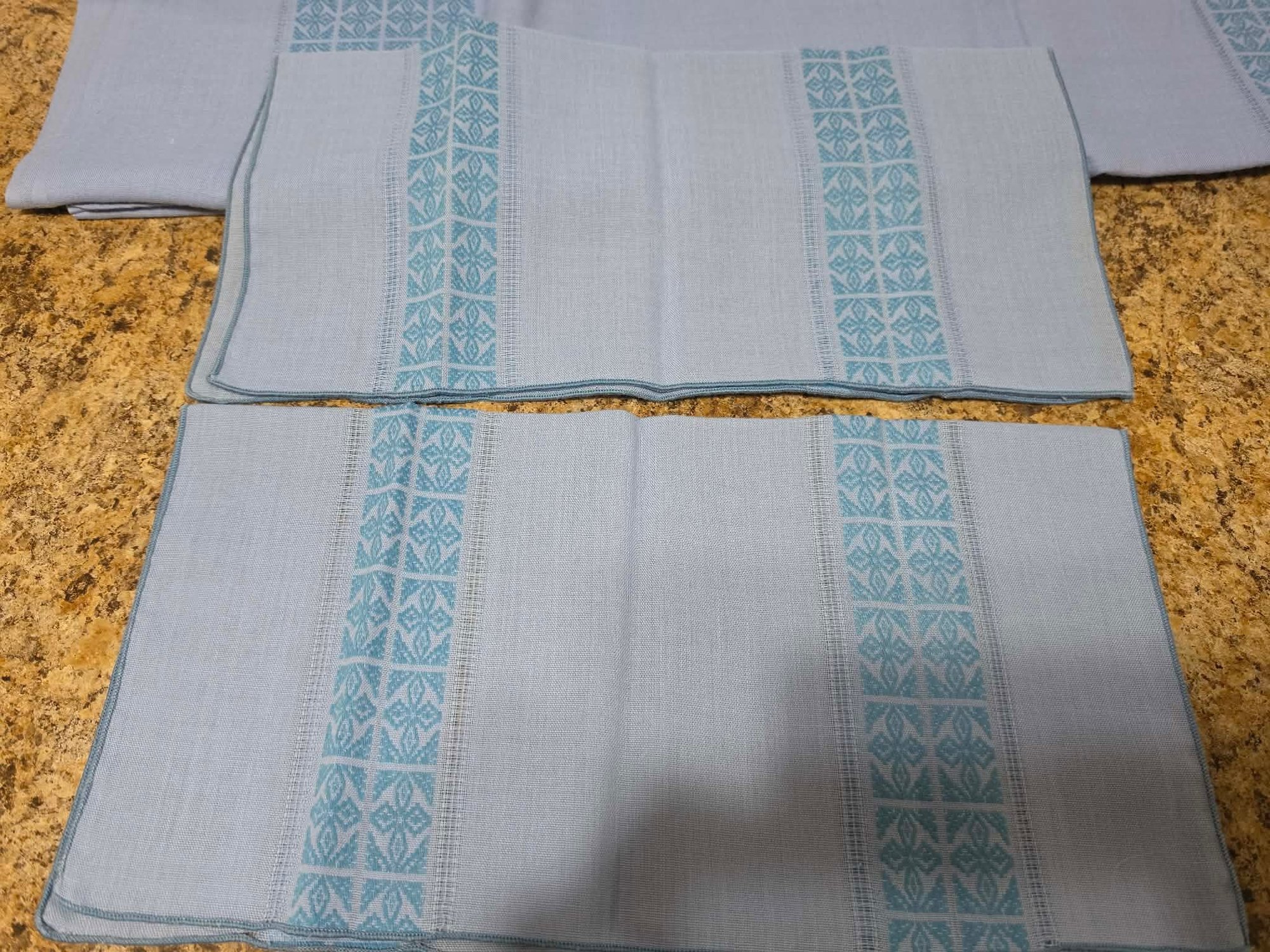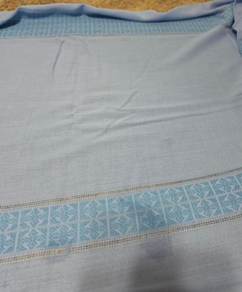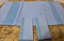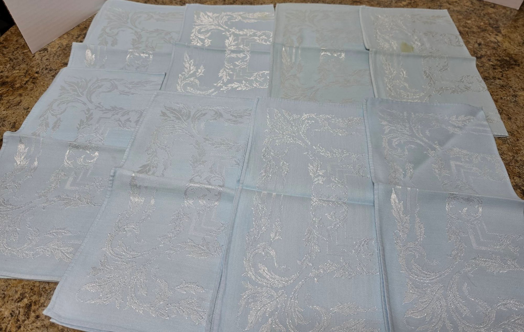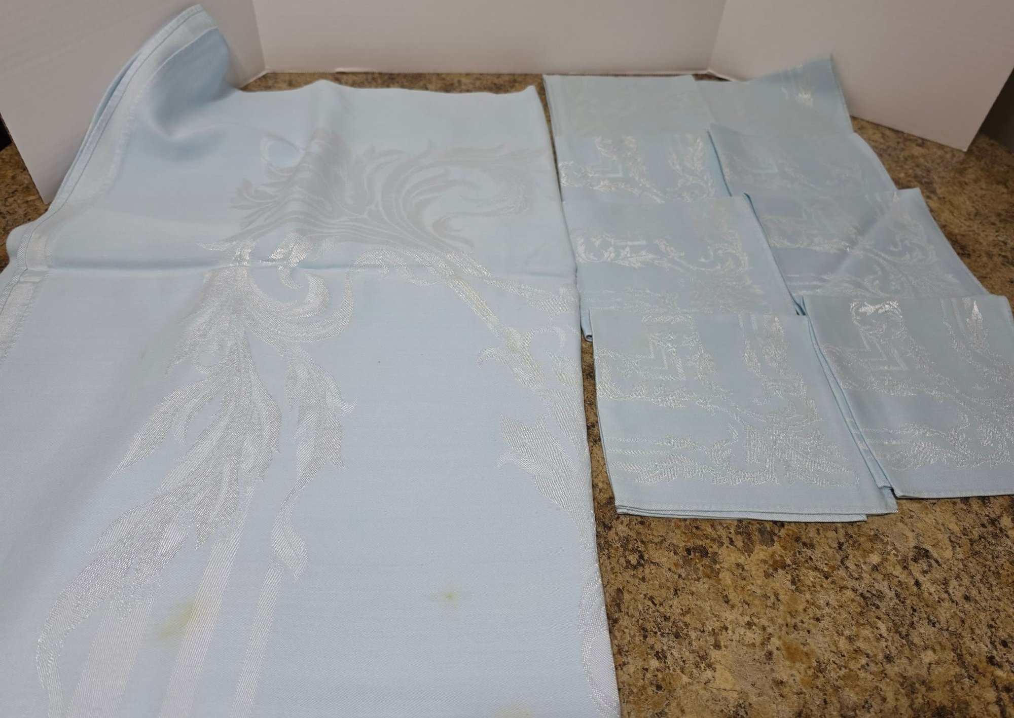 Large Cloth Table Clothes & Napkins. Staining. Not sure if it can come out. Measures 74 x62 white, 60 x 120 darker blue and 74 x 60 light blue.