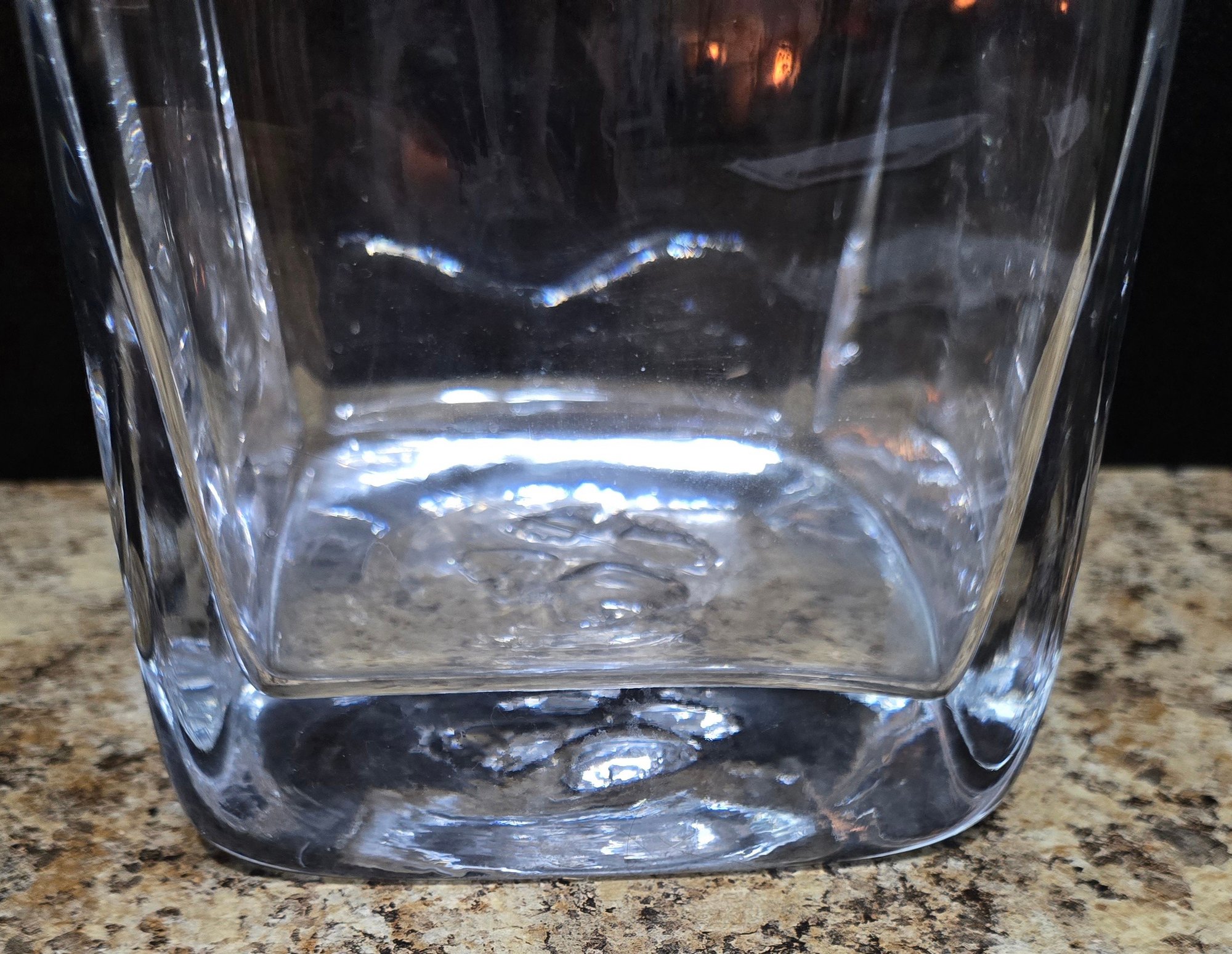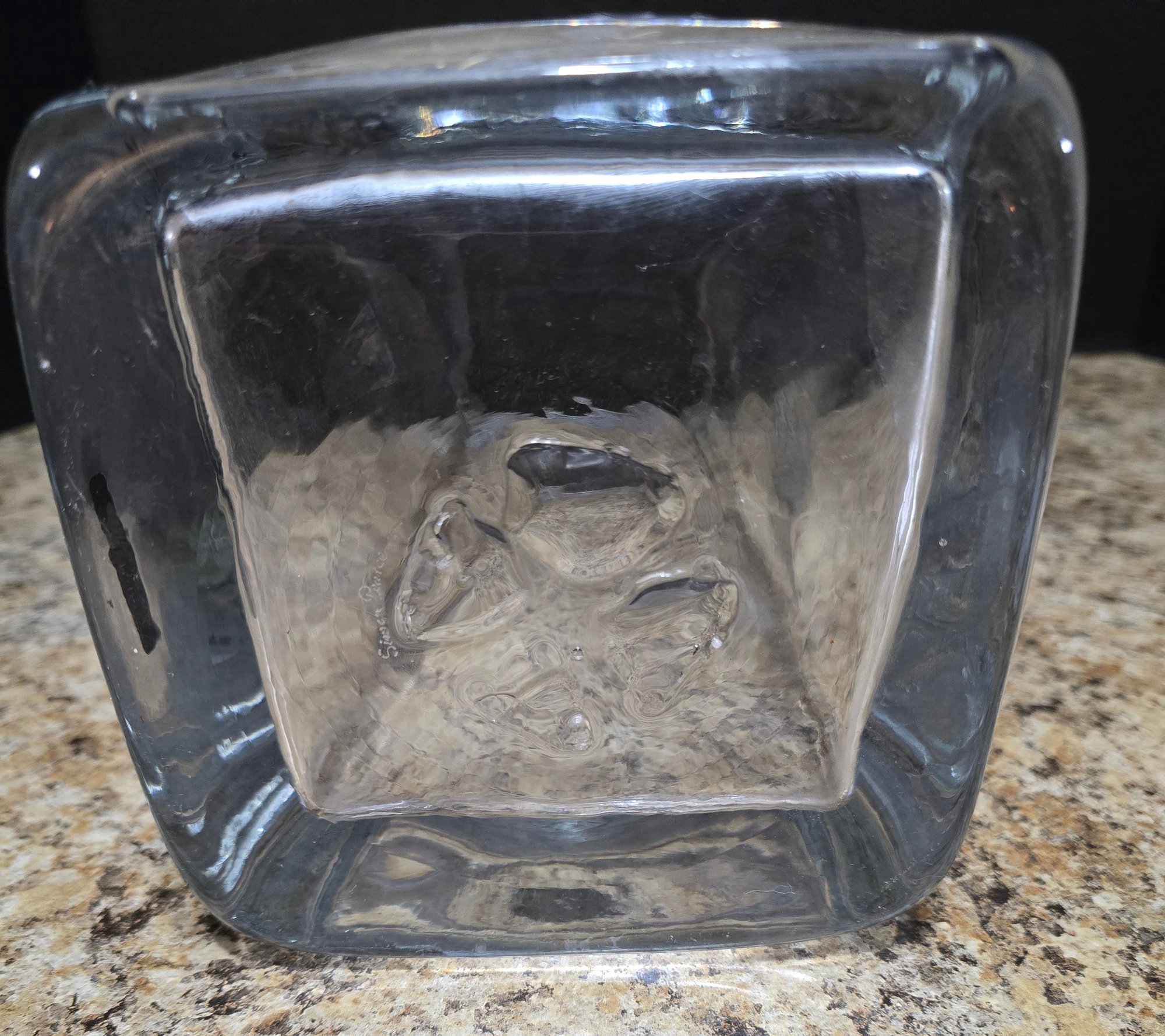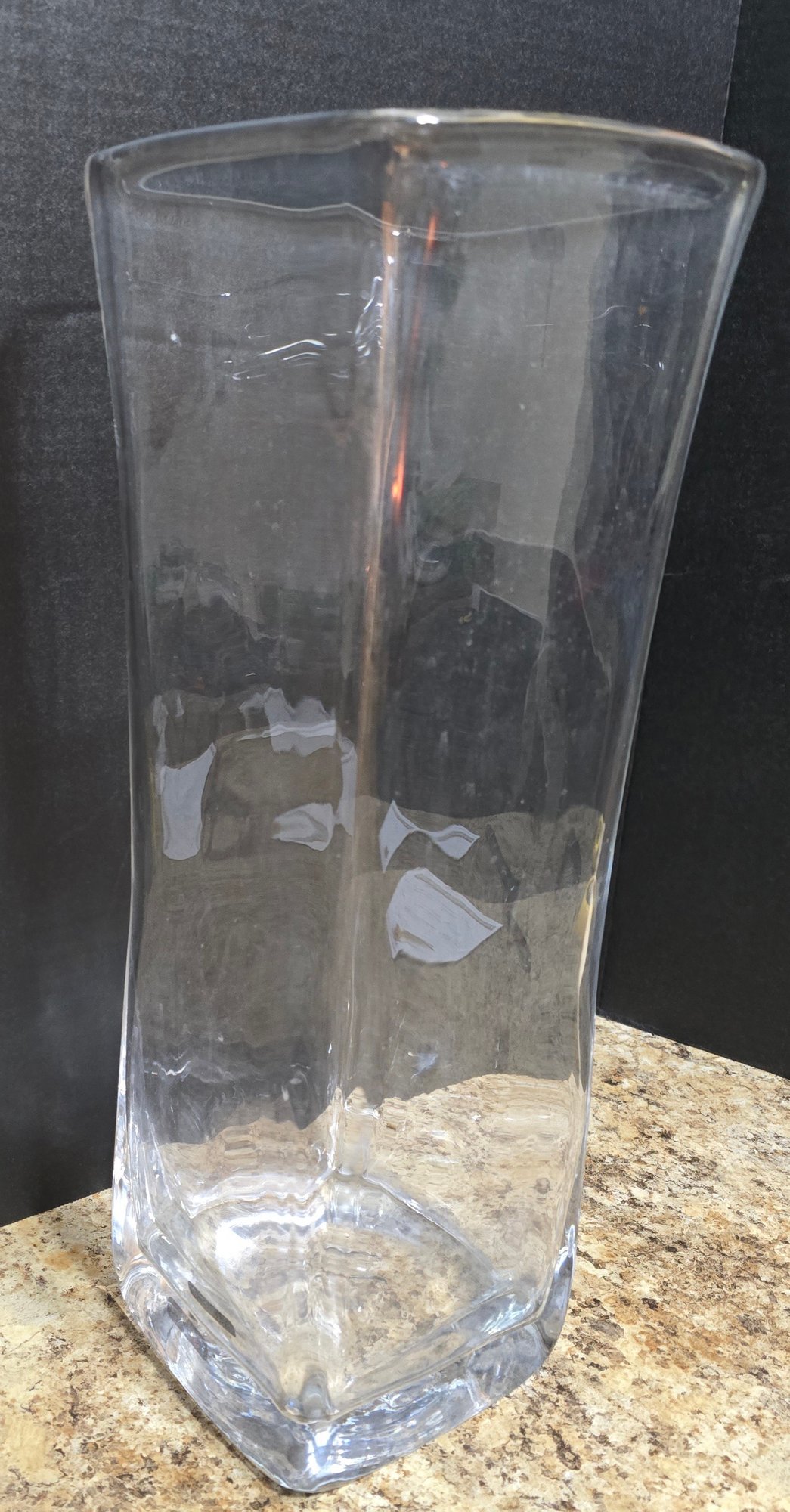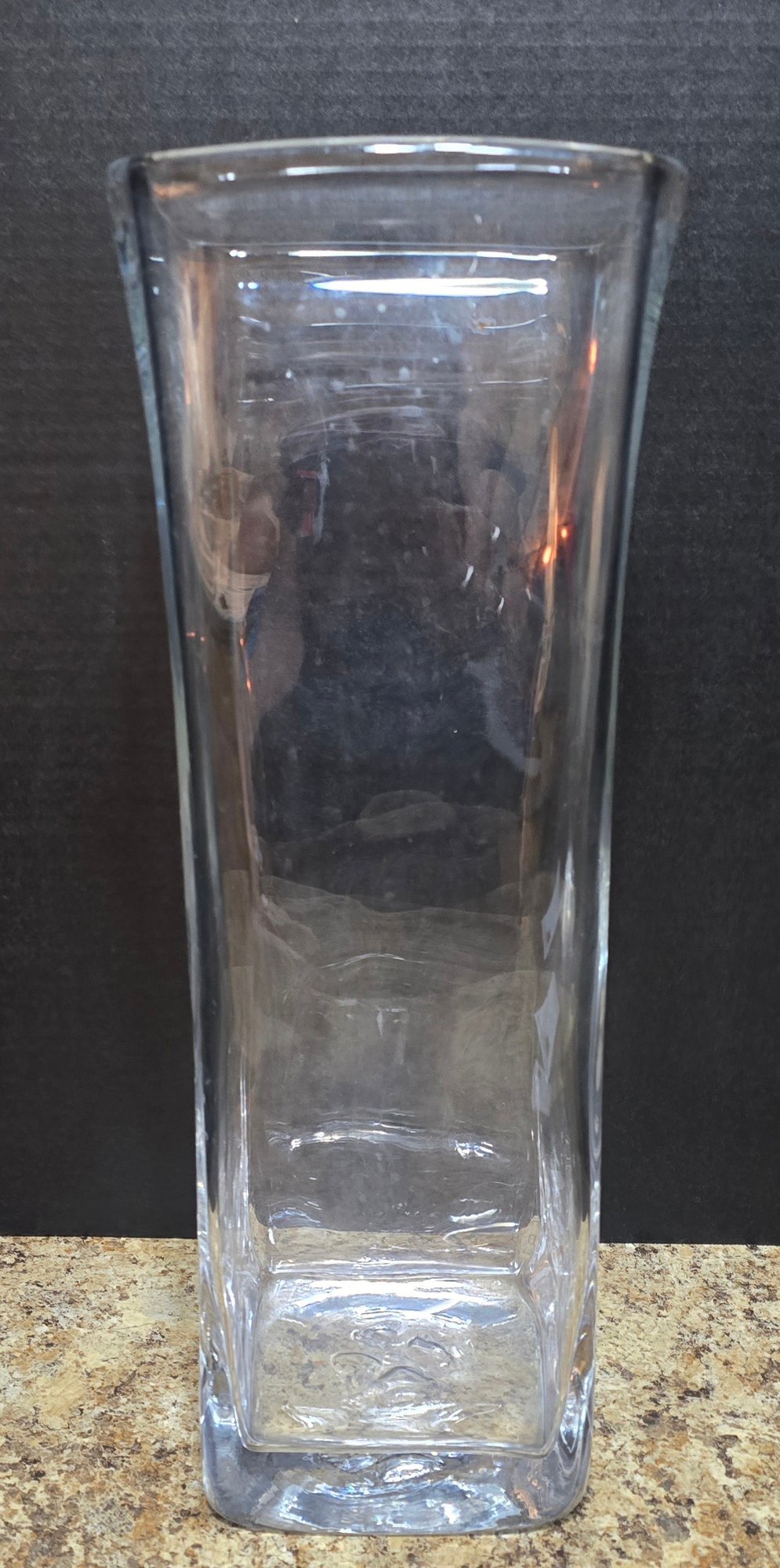 Large Heavy Clear Vase. Measures 6.5 x 6.5 x 18. No cracks or chips noted. Please see all pics for details.