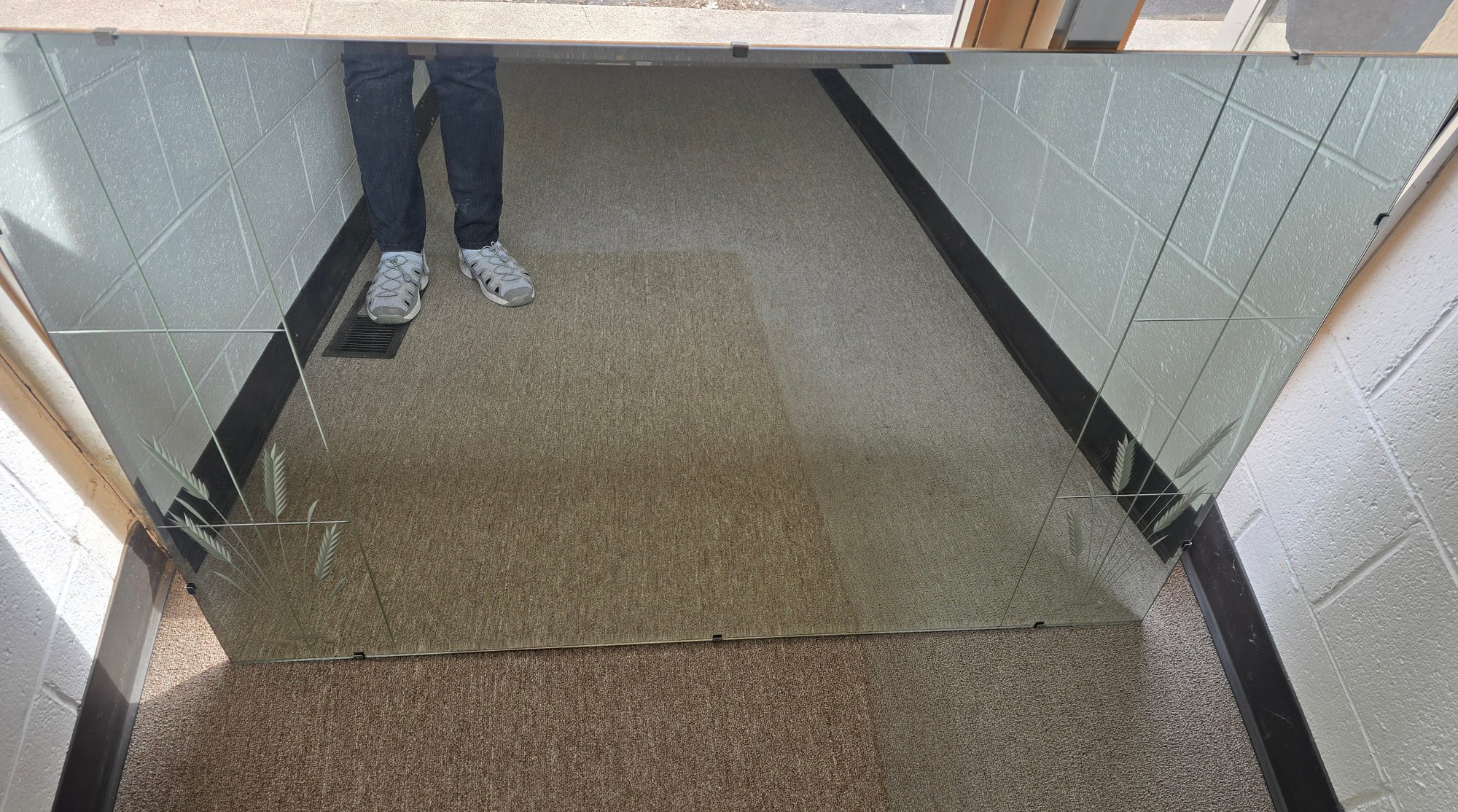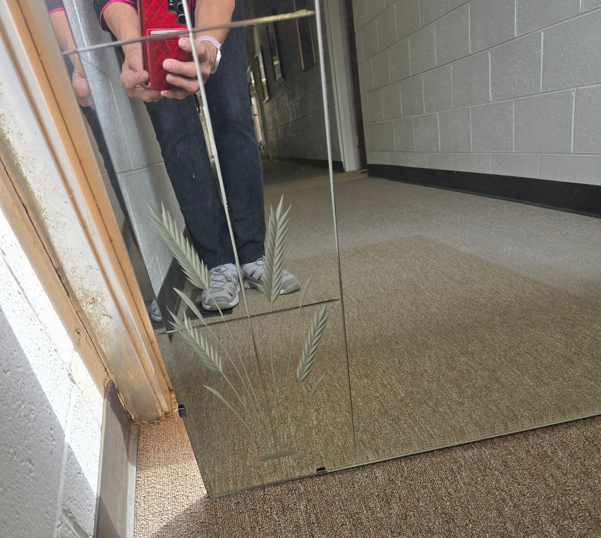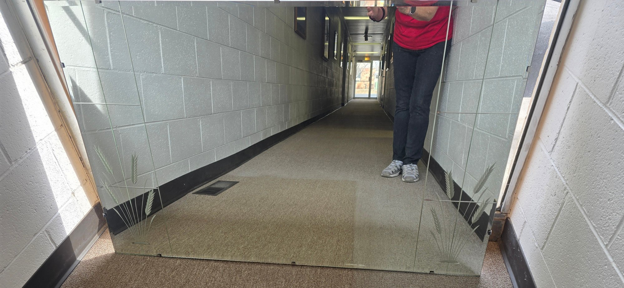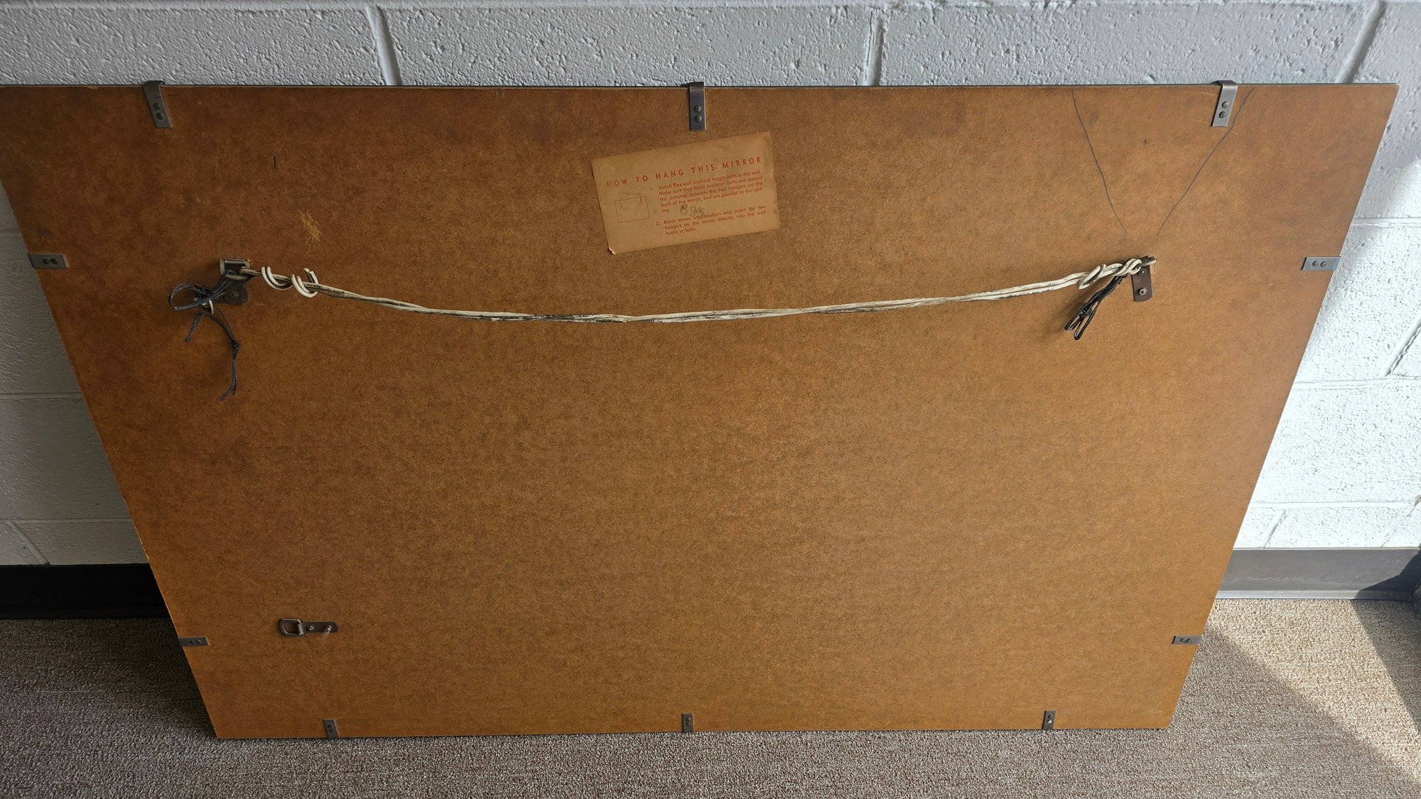 Large Vintage Wall Mirror. Very heavy. Has an extra sturdy wire for hanging. Measures 48 x 30. Beautiful. Wheat etching on each lower corners. This item is large and will not fit in a standard car. Please see all pics for details.