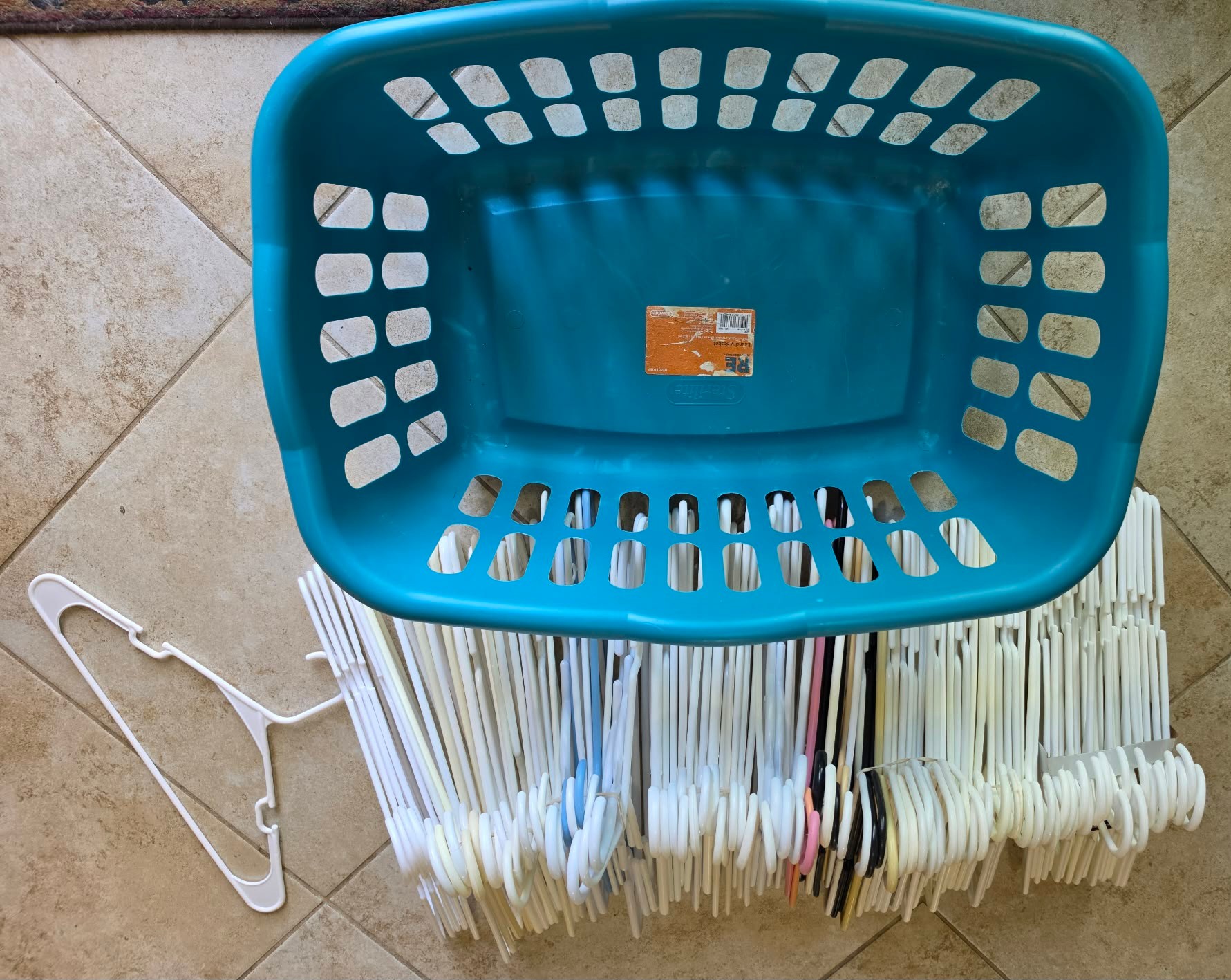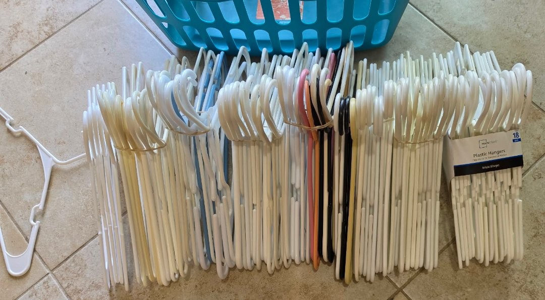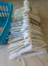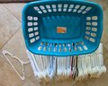 Laundry Basket and group of adult Plastic hangers.