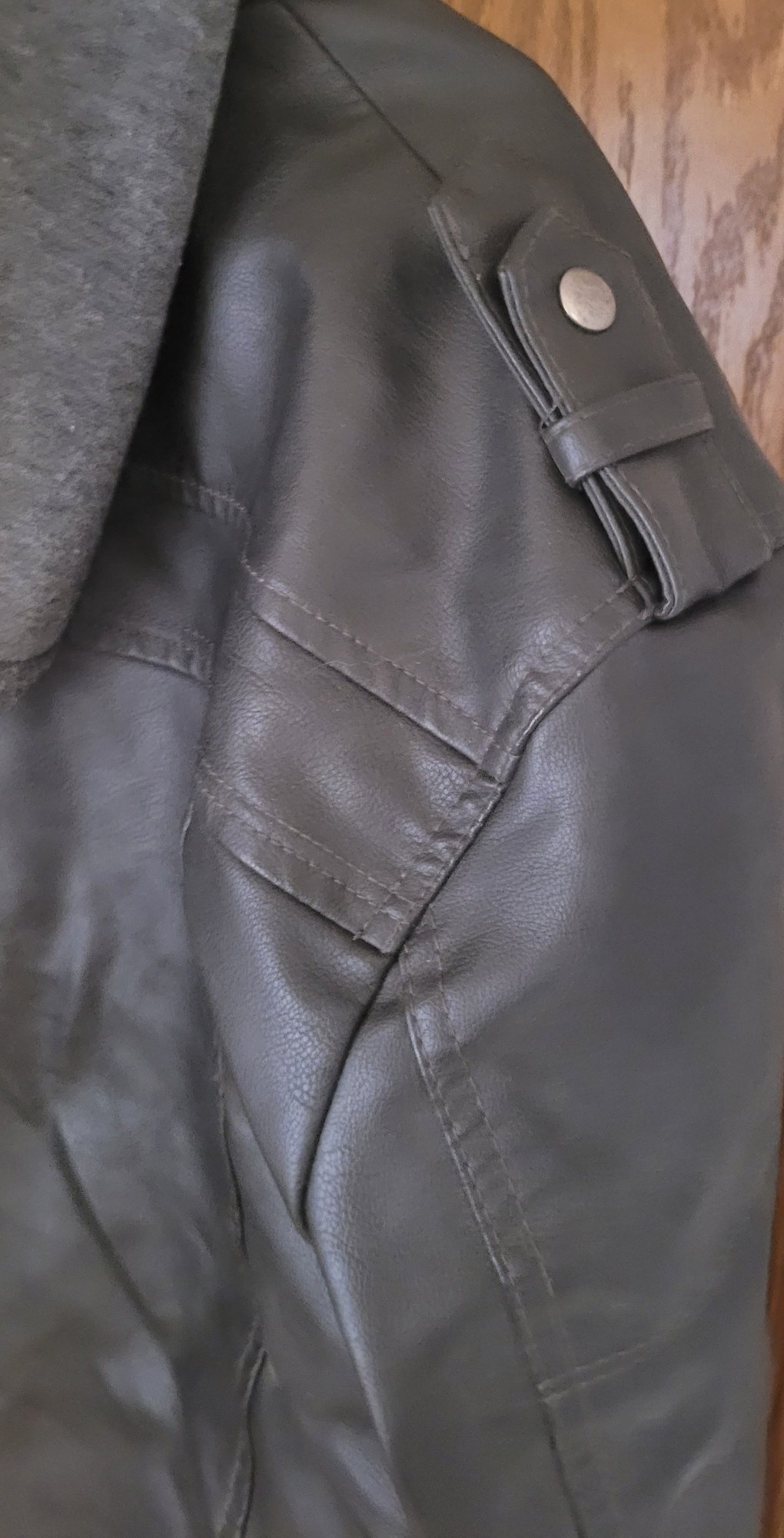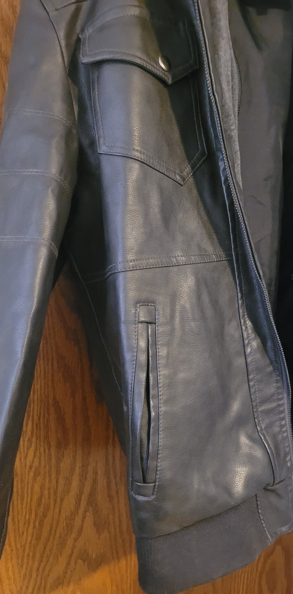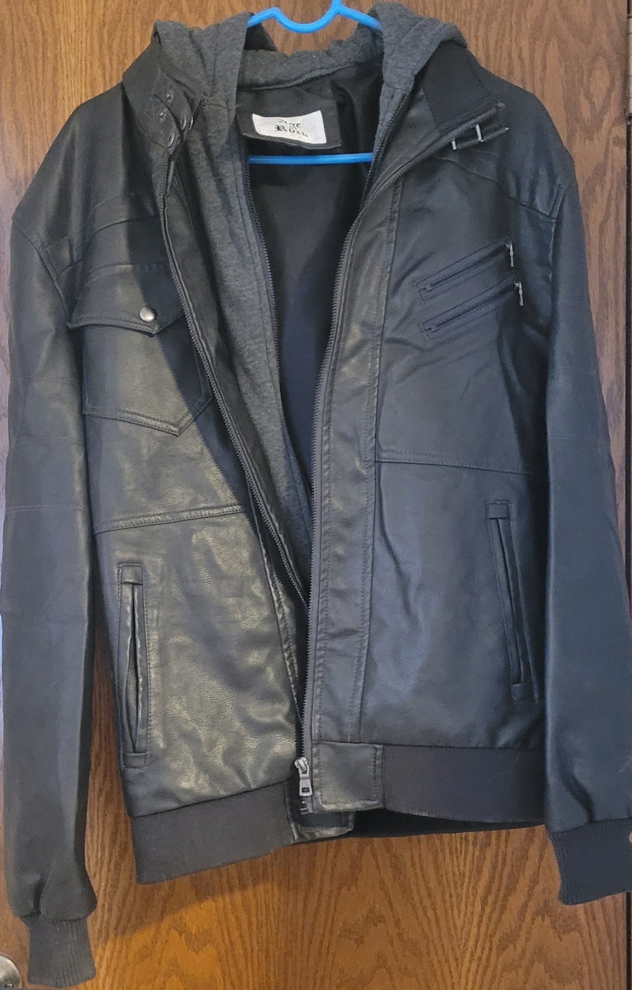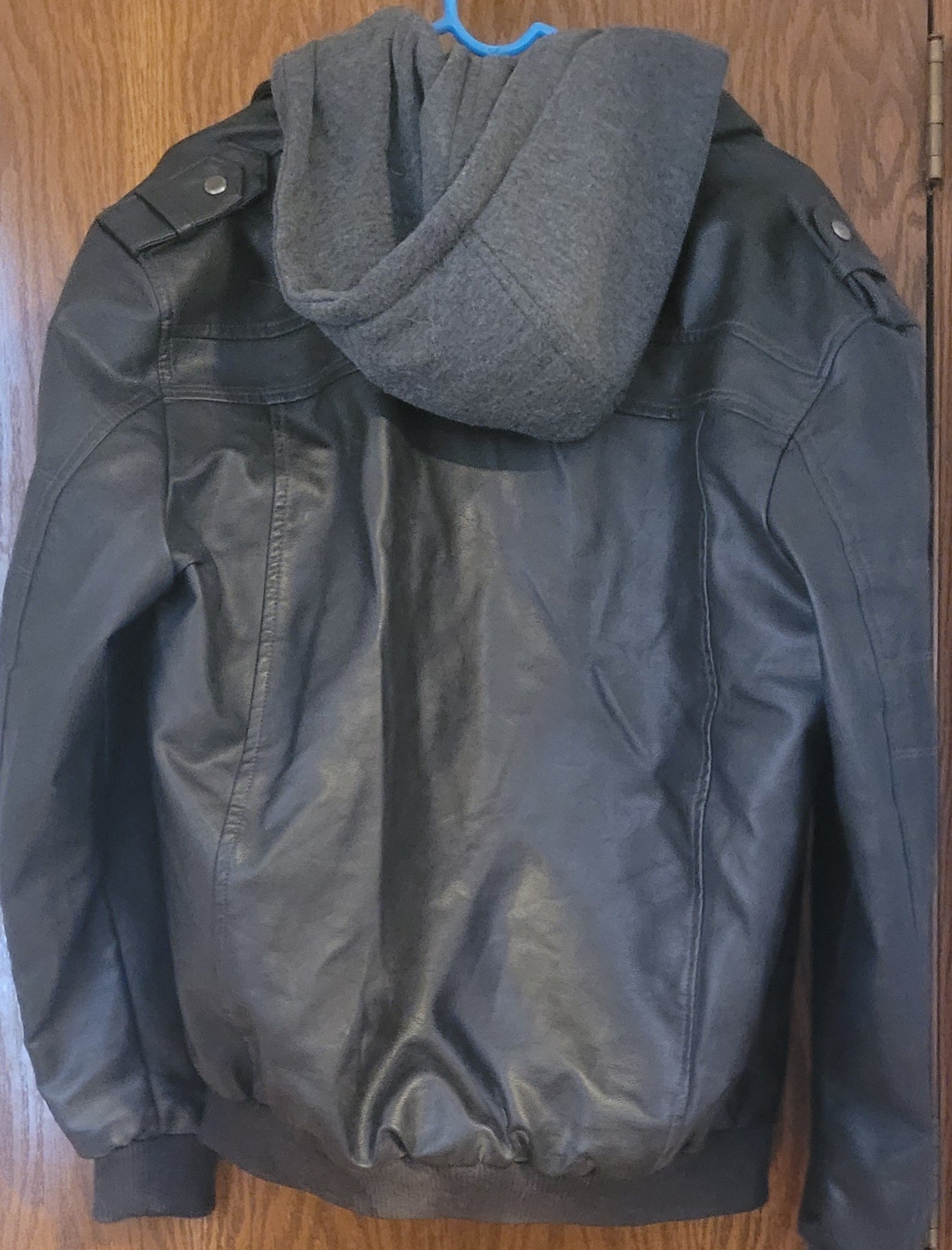 This jacket is a large. I tried to find this jacket but I have had no luck. It is hooded but I don't think that it is leather. See pictures for details.