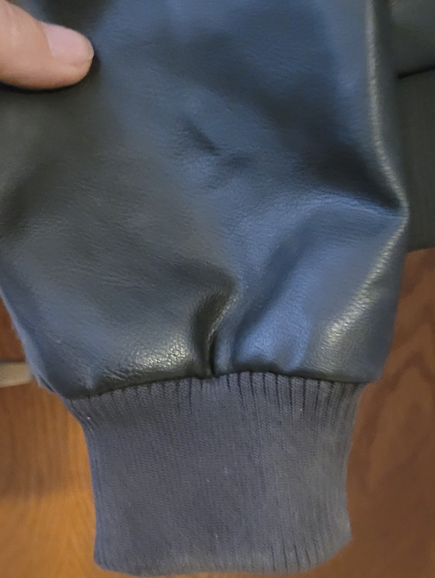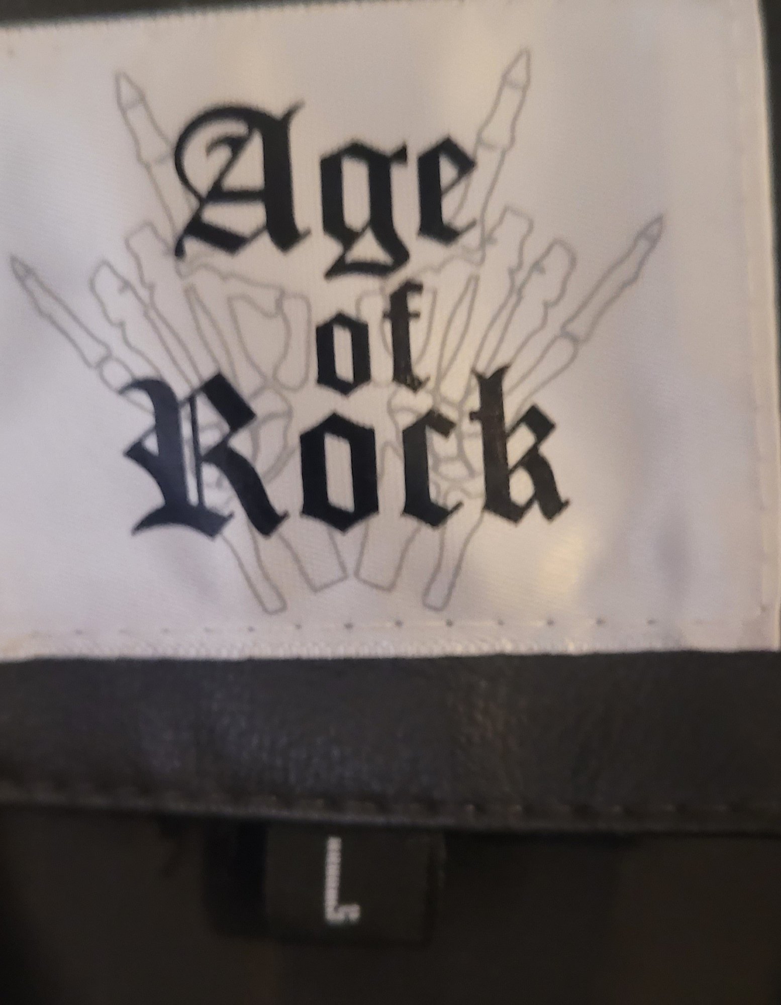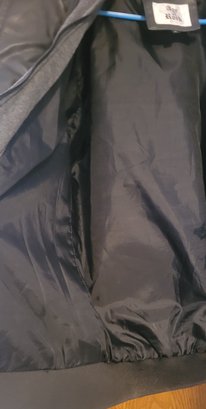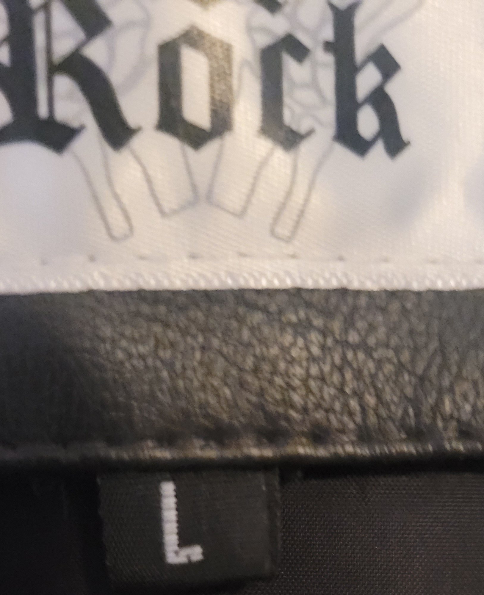 This jacket is a large. I tried to find this jacket but I have had no luck. It is hooded but I don't think that it is leather. See pictures for details.