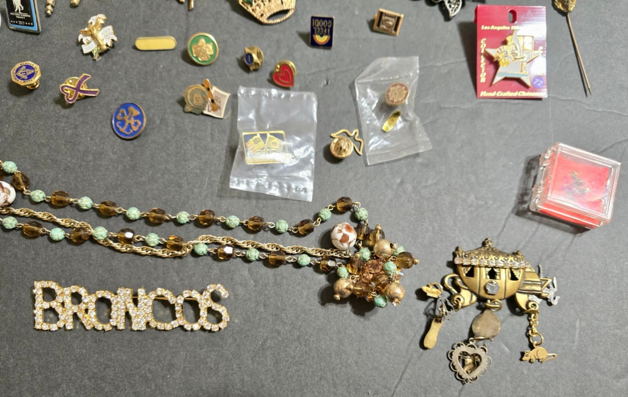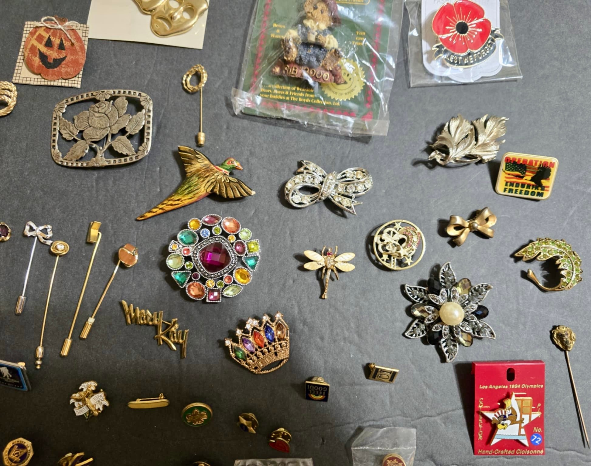 Lot #1 - Group of stick pins, brooches and more. Not all have backs.
