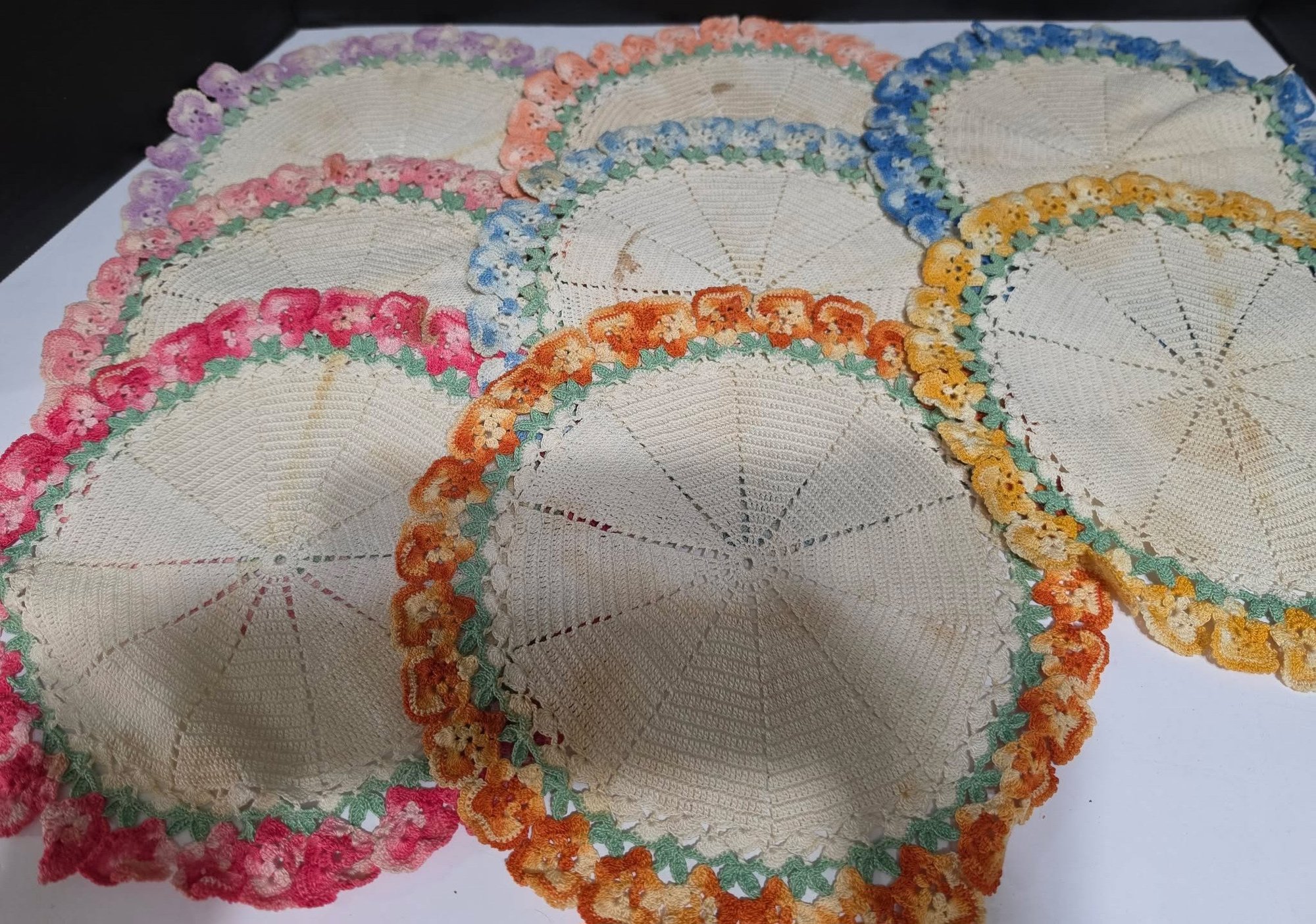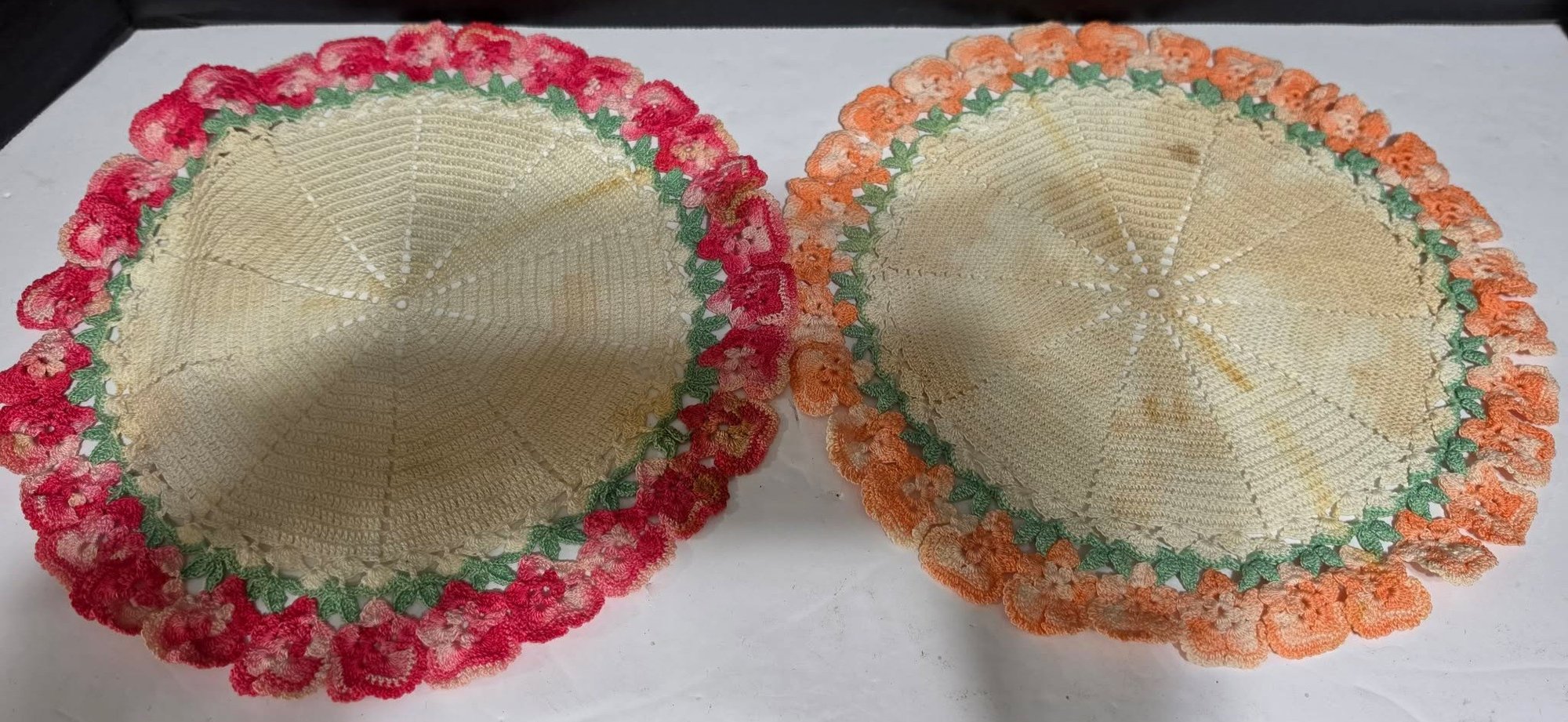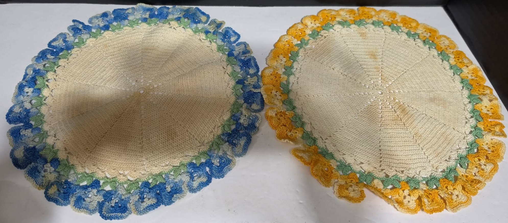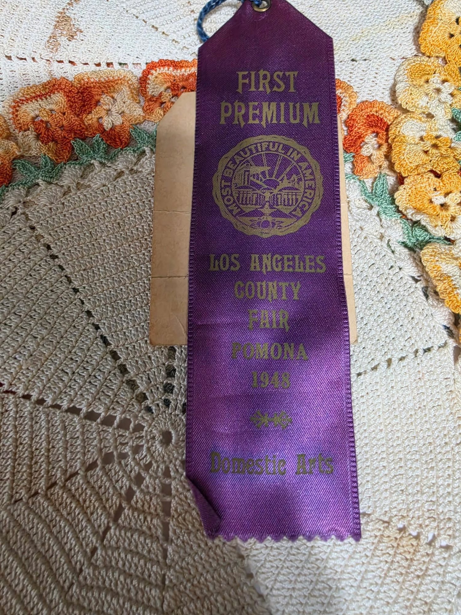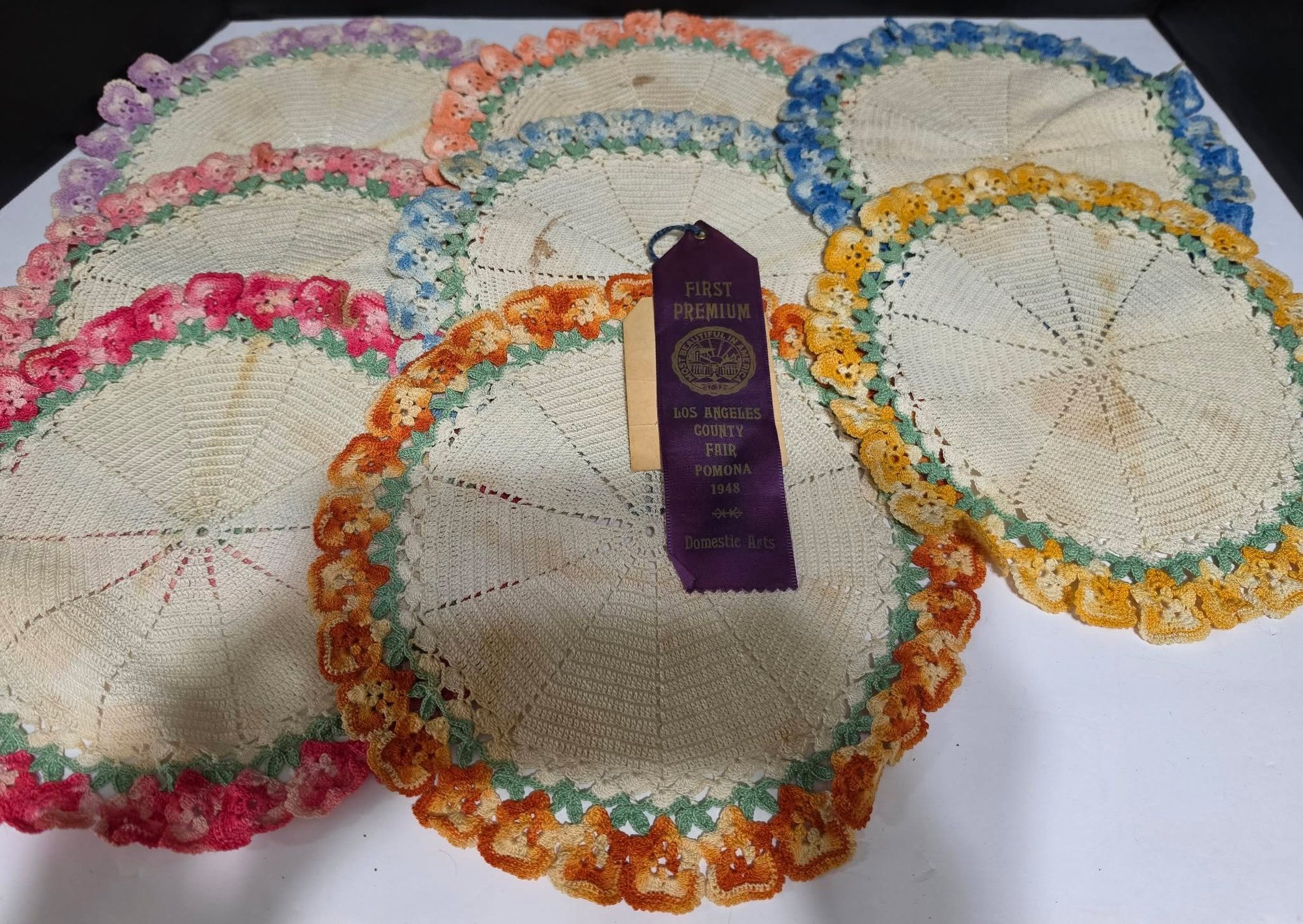 Lot # 2 - Vintage-style handmade crochet doilies from 1948. The creator won 1st premium place. Ribbon not included. Measures 10". Needs cleaned.