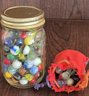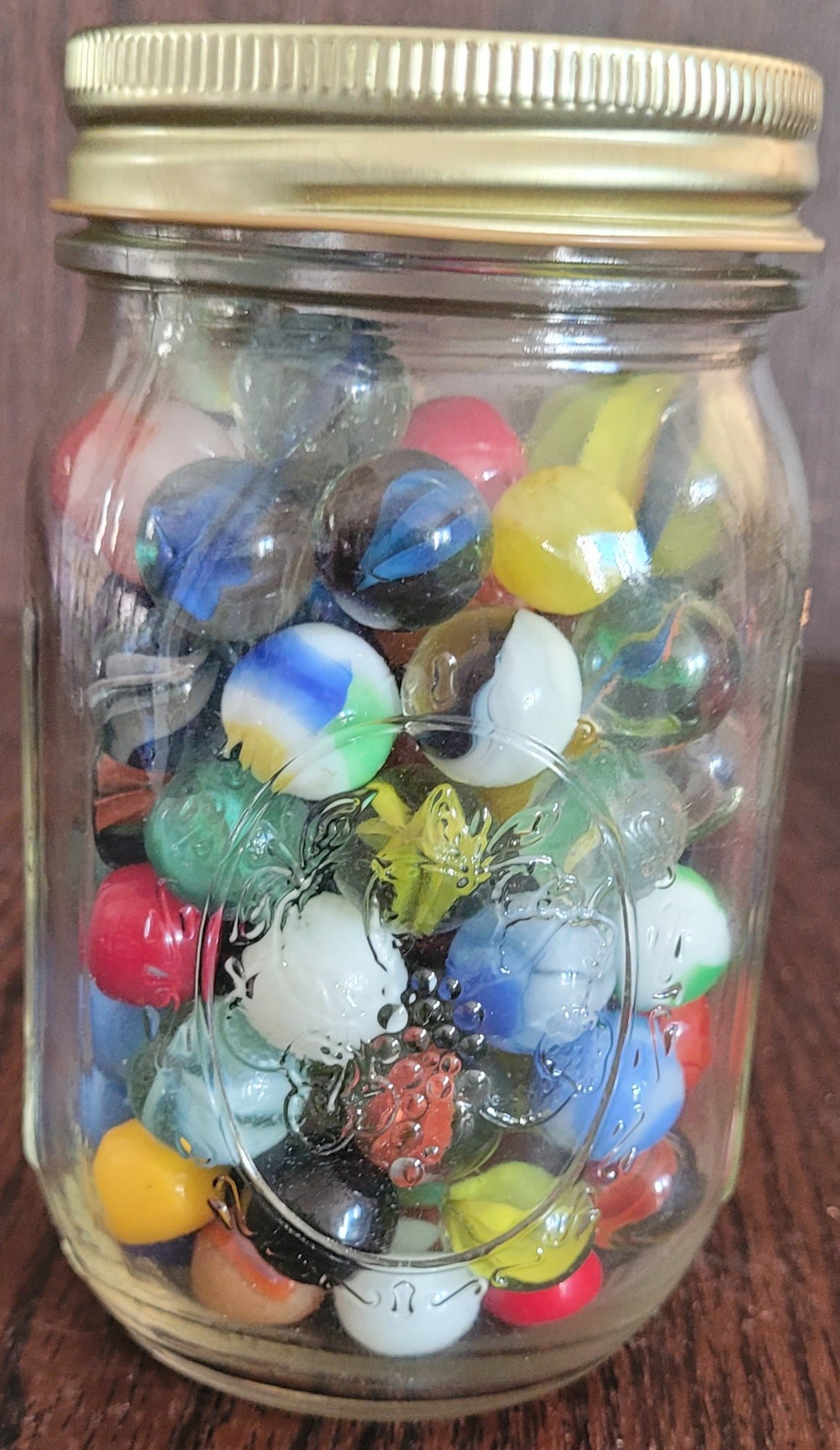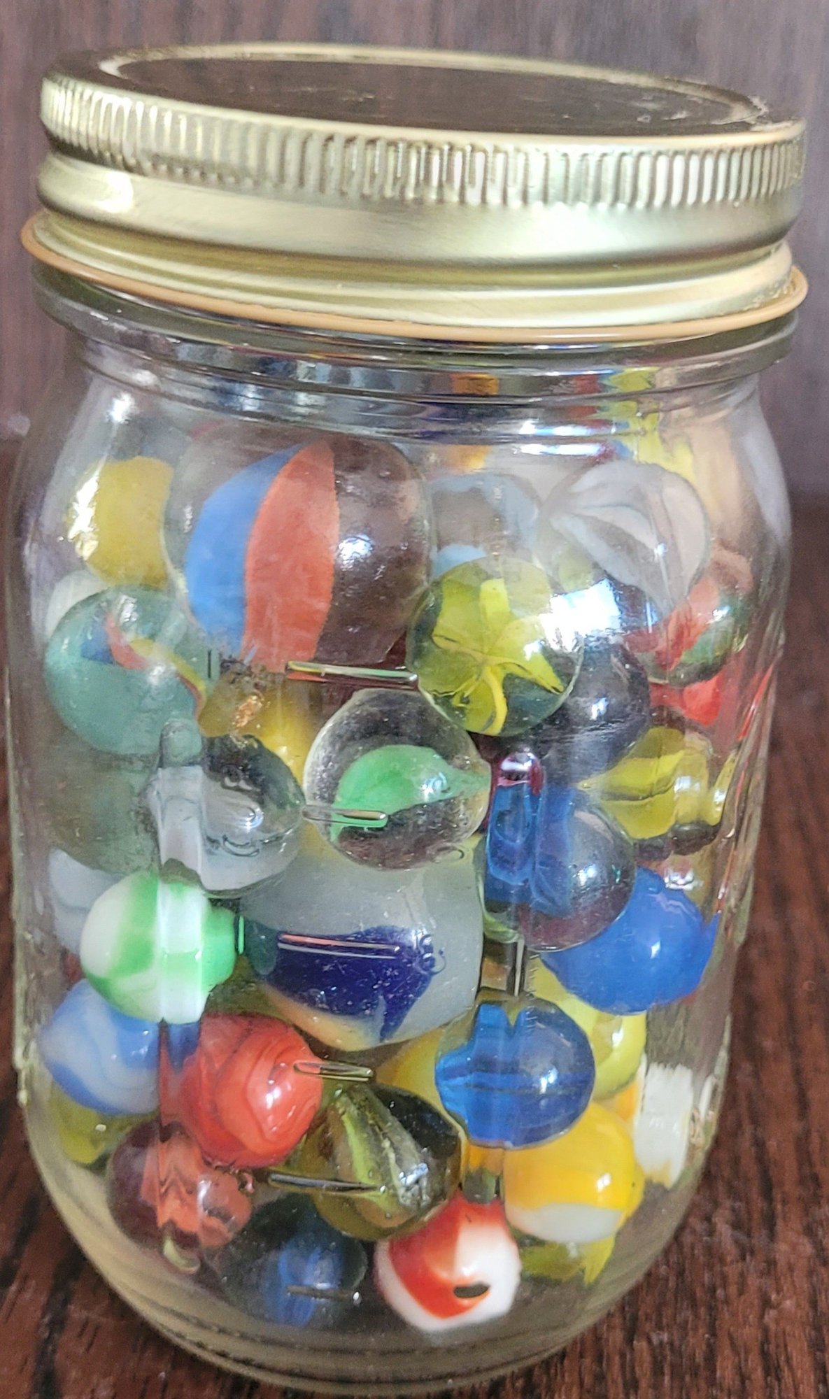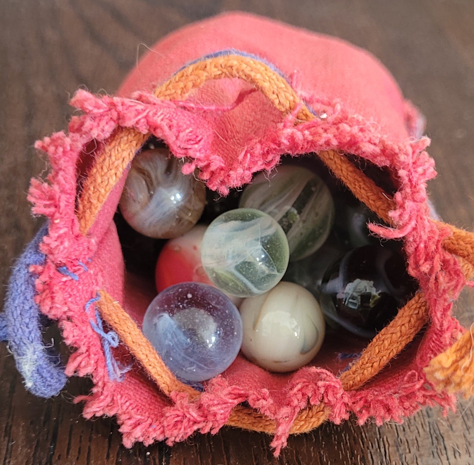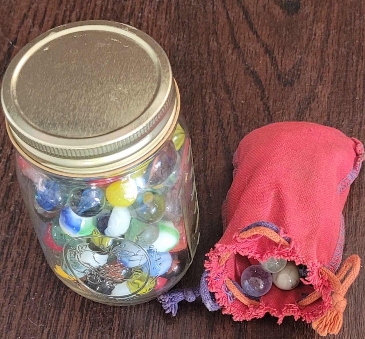 This lot comes with a bag and jar of different marbles. See pictures for details.