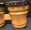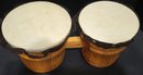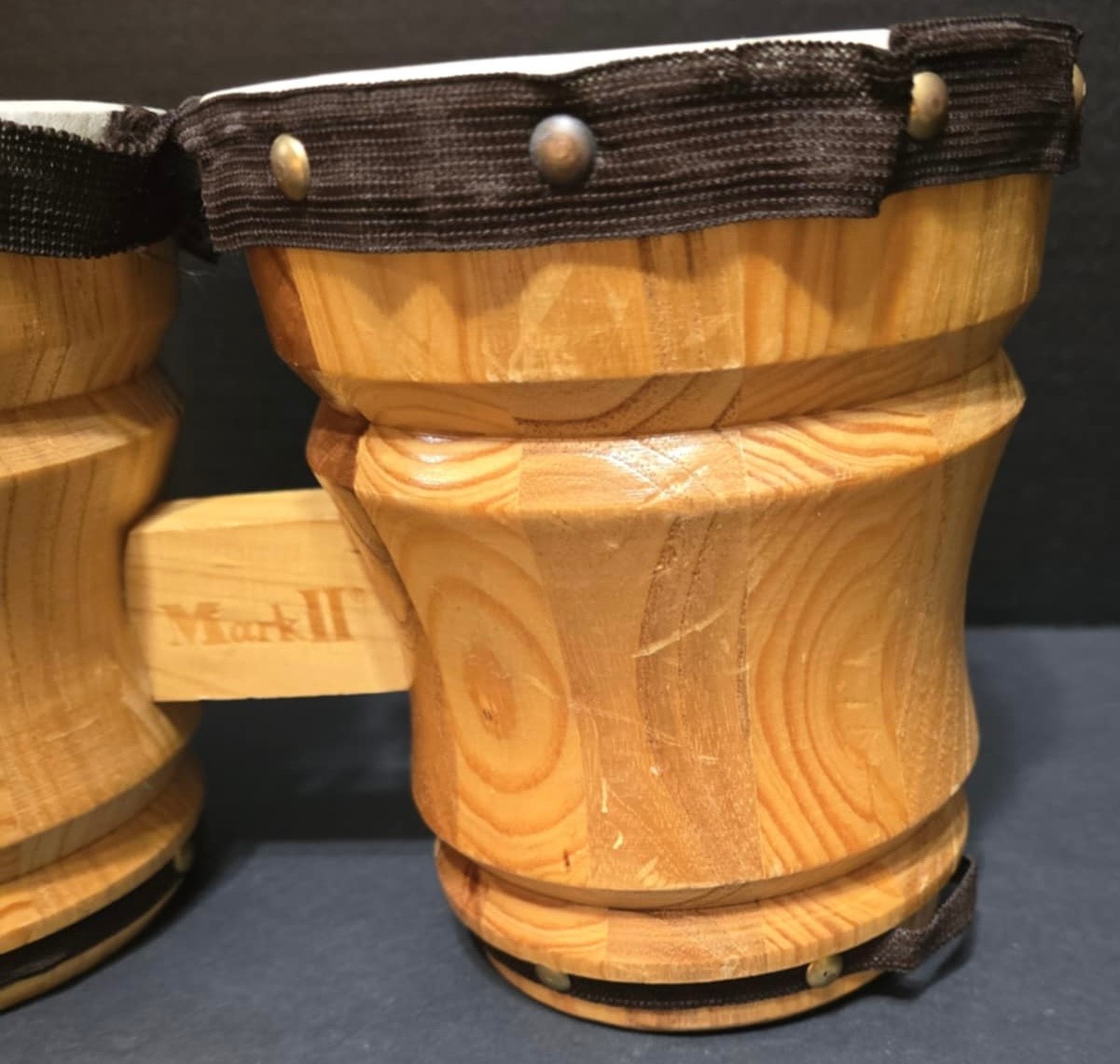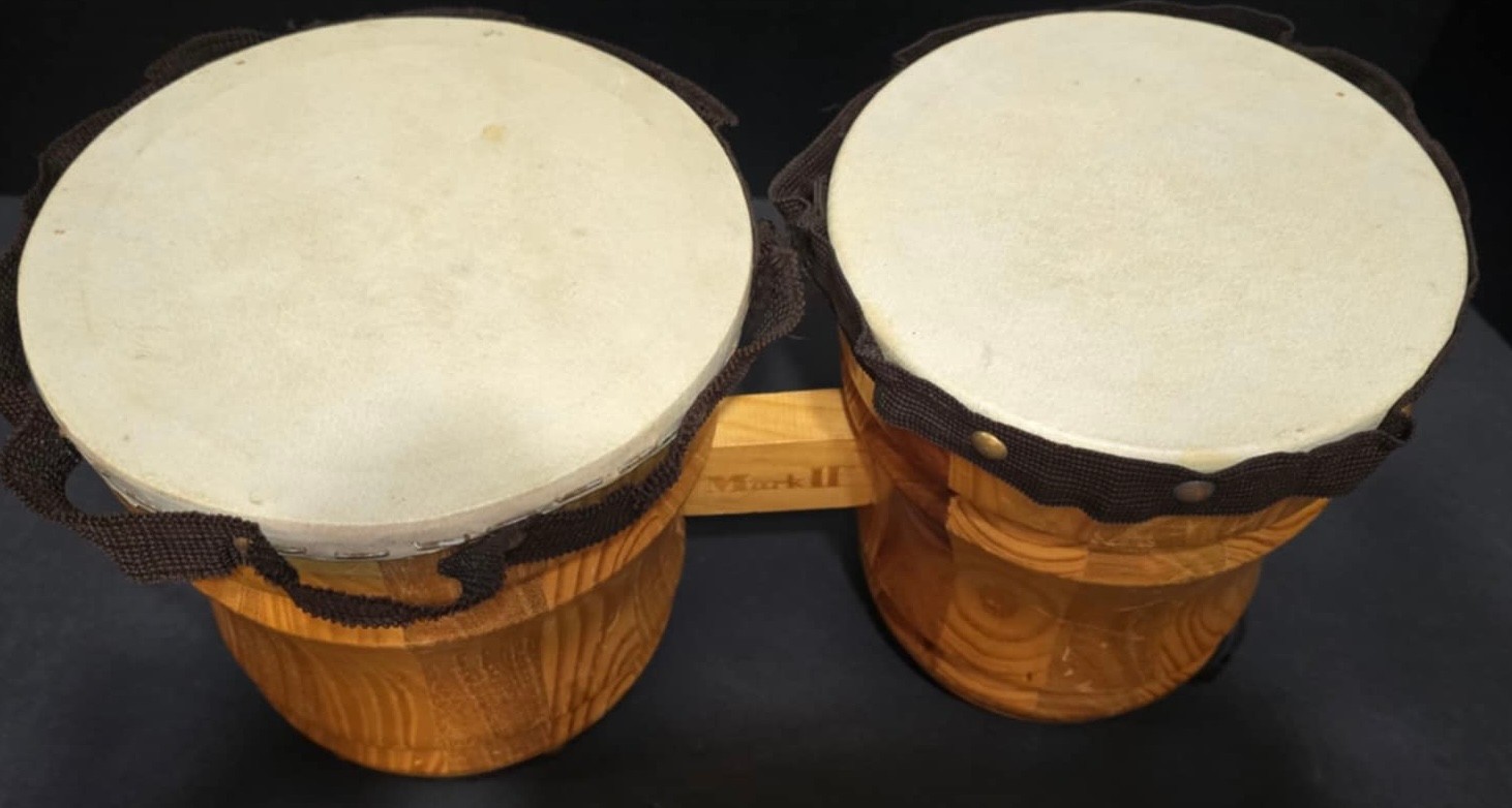 Mark II wooden bongo drums. Some scratches. Ribbon is loose in a few places. Measures 13 x 6.5 x 6.75. Some staining on the top.