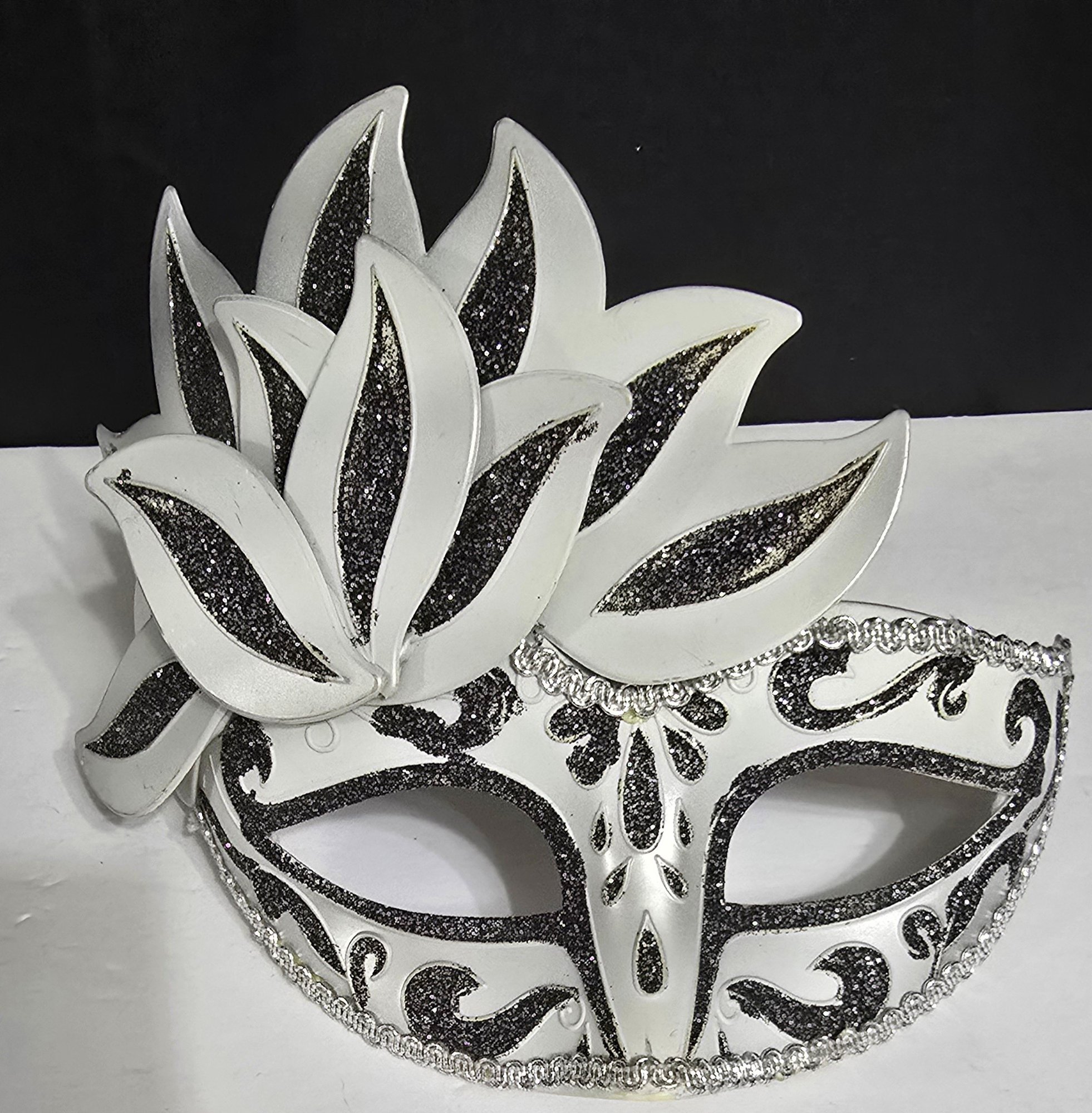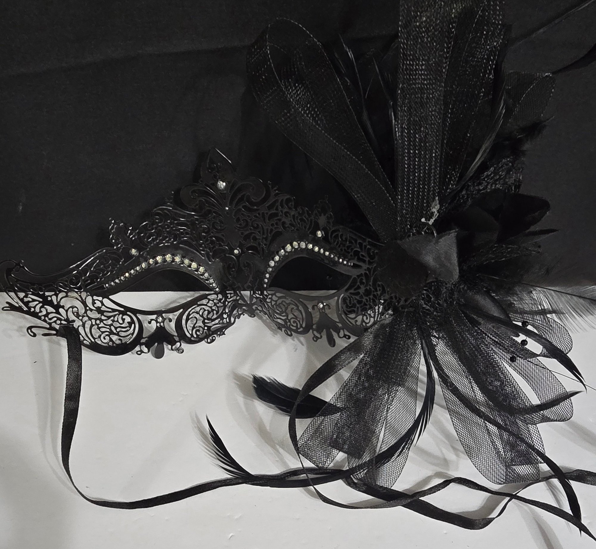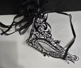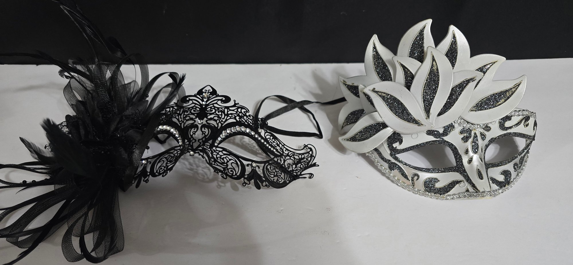 Masquerade Style masks. The black one ties, however the white does not have anyway of using it beside for decoration. Someone could alter it to work. Please see all pics for details.