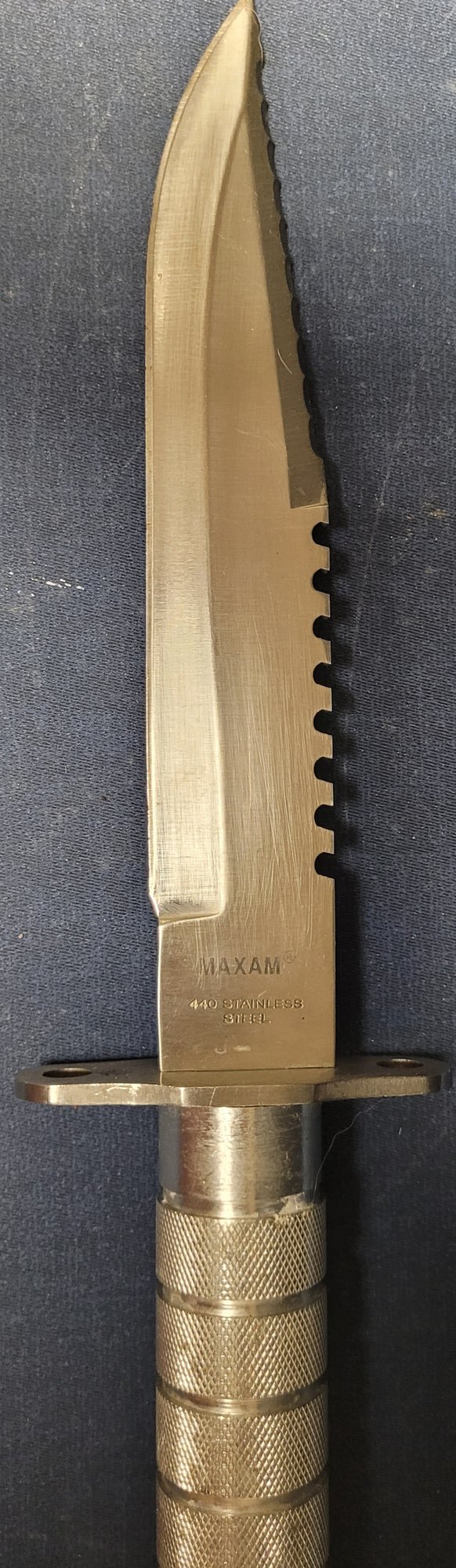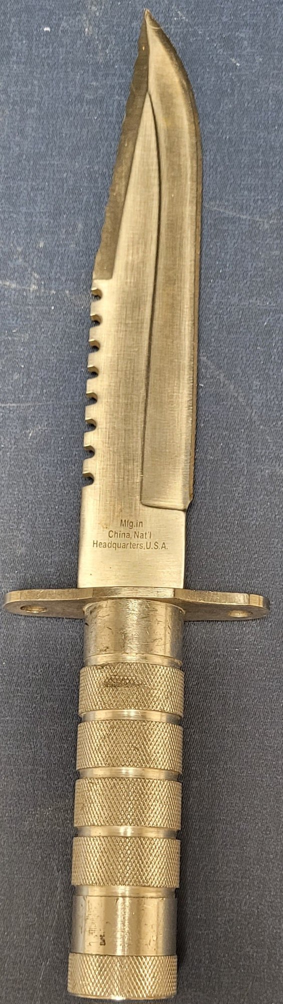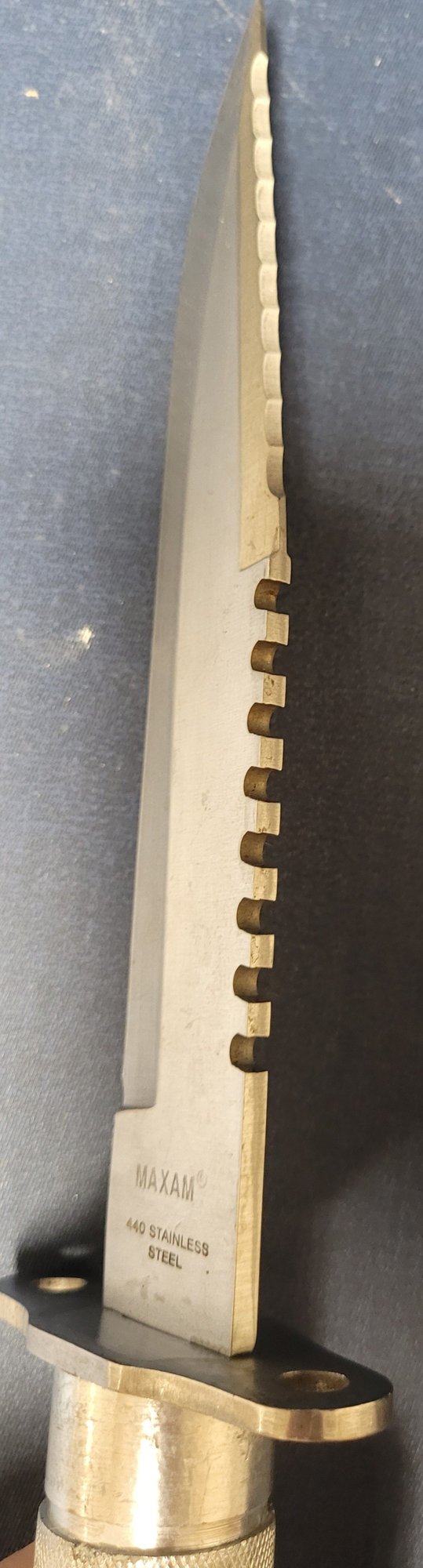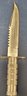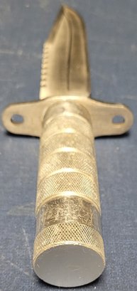 This is more silver color and measures 12.25" long and the blade measures 7.5" long. See pictures for details.