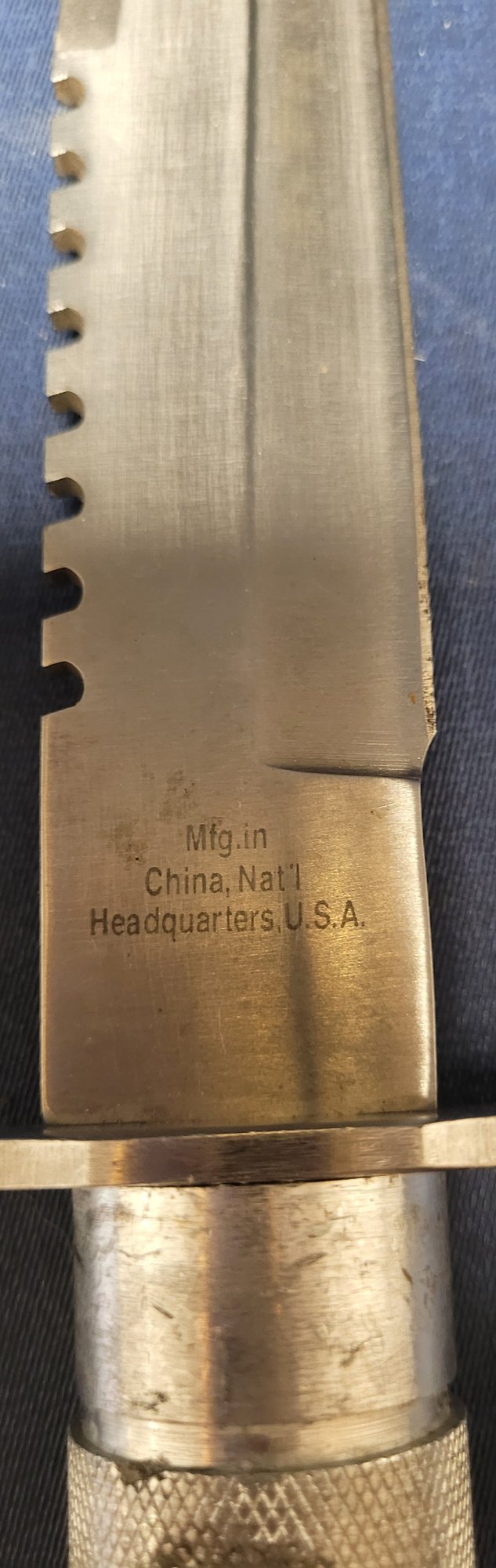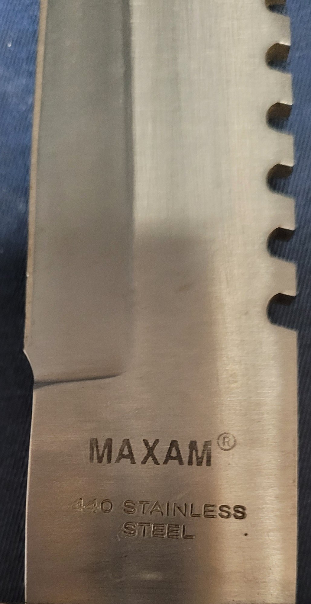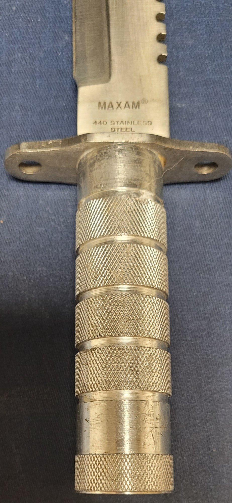 This is more silver color and measures 12.25" long and the blade measures 7.5" long. See pictures for details.