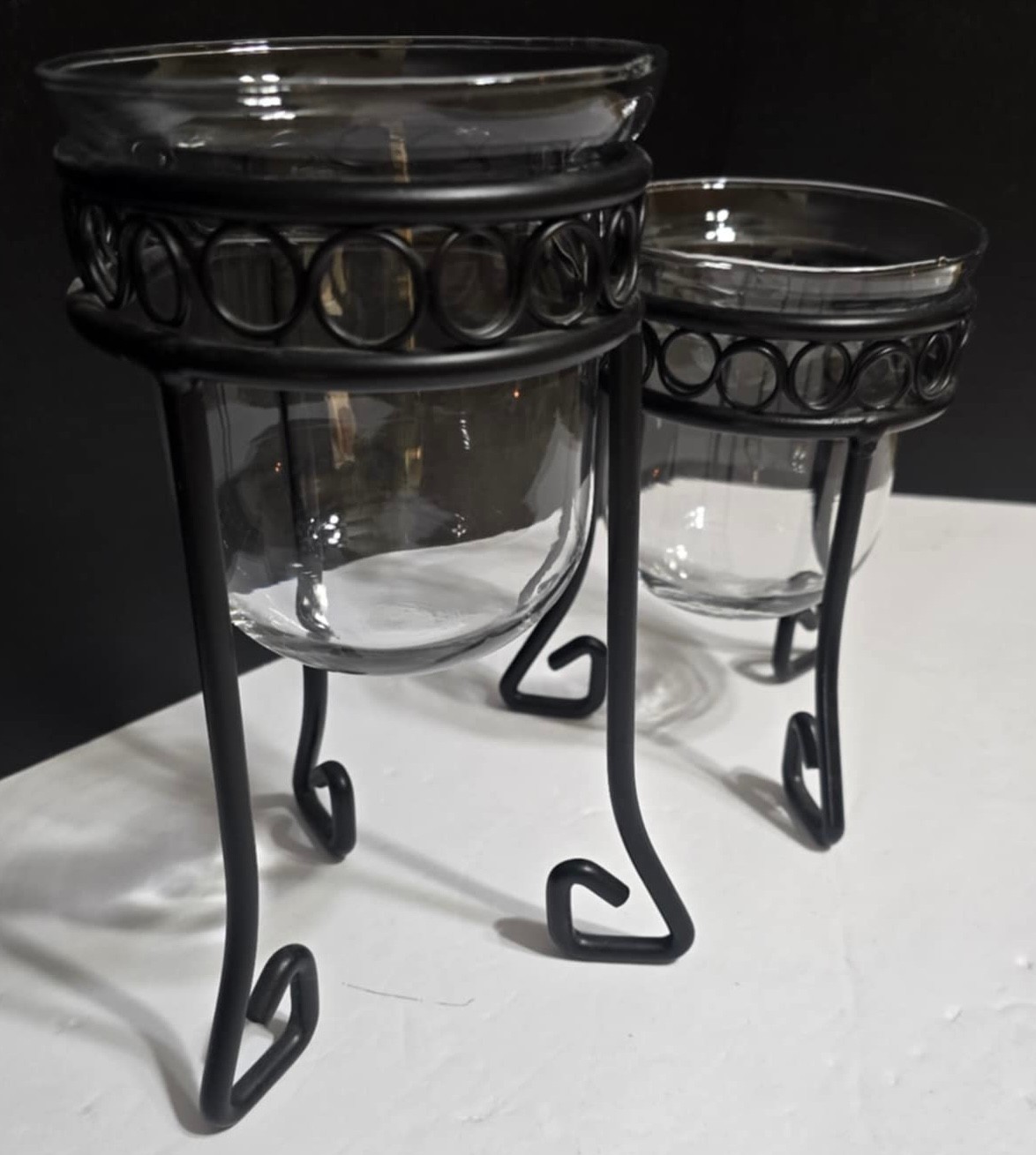 Metal Candle Holders - Set of 2. Measures 5 x 8.5 & 5 x 6.5. No cracks or chips noted. However there glass rim on both does have some imperfections.