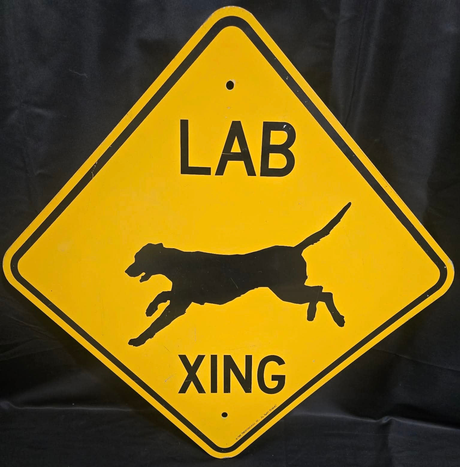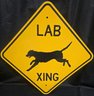 Metal "Lab Xing" (Labrador Crossing) caution sign designed to alert drivers to dogs in the area. Measures 24 x 24.