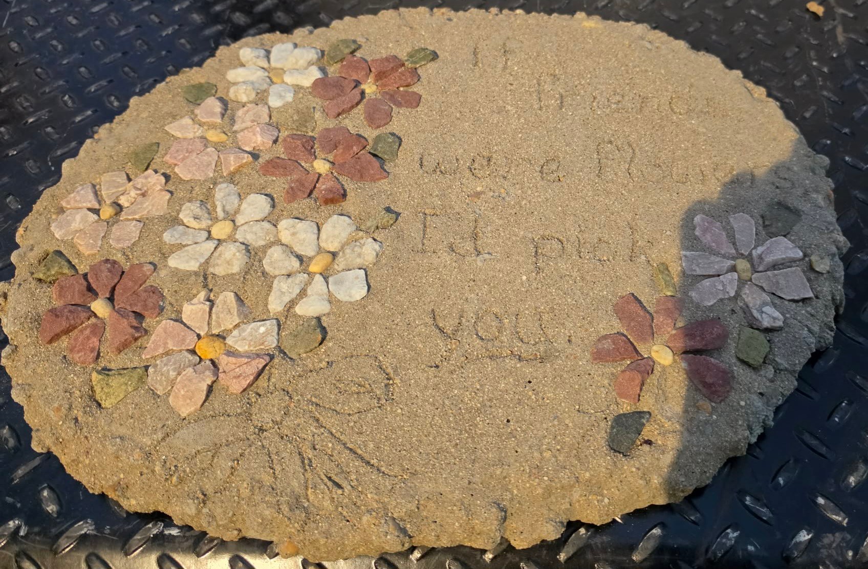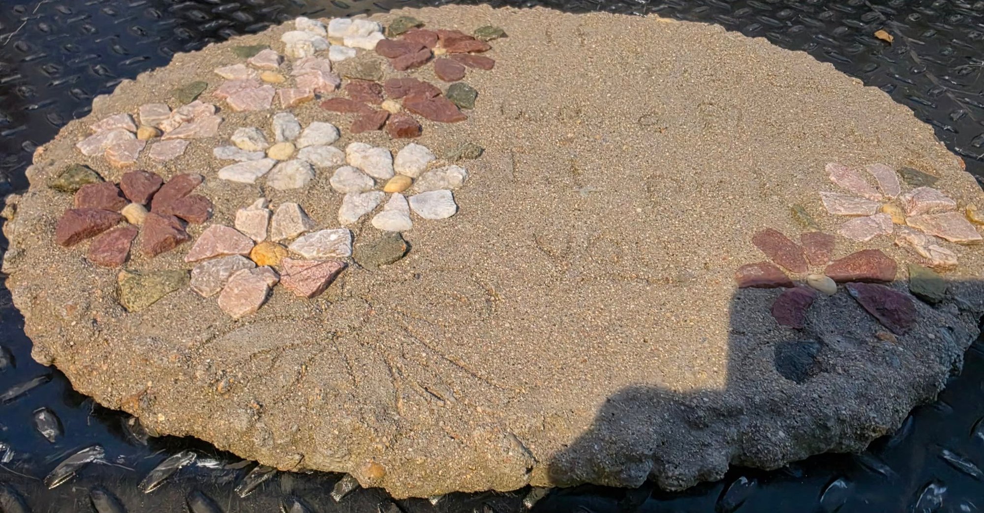 Mosaic garden stepping stone featuring decorative stone flowers. Measures 16 x20.