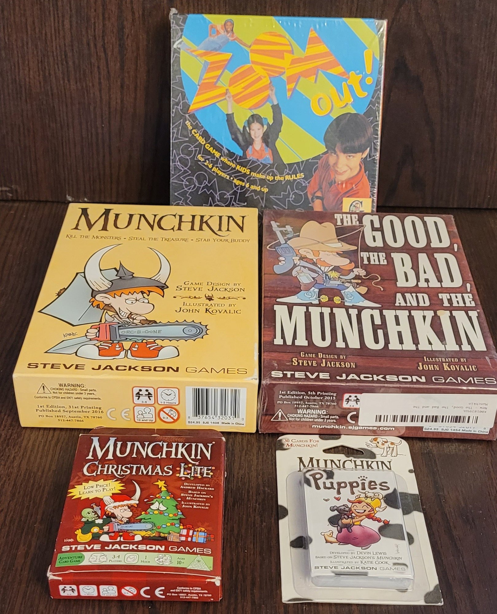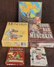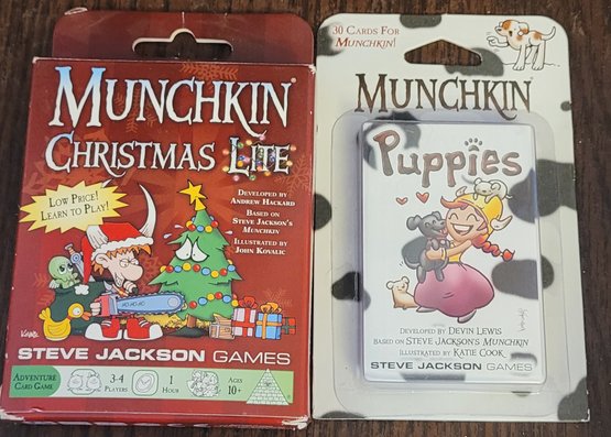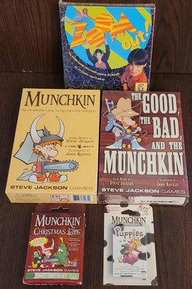 This lot comes with 2 Munchkin games plus 2 munchkin cards and one other game. I can't guarantee all pieces are there. See pictures for details.
