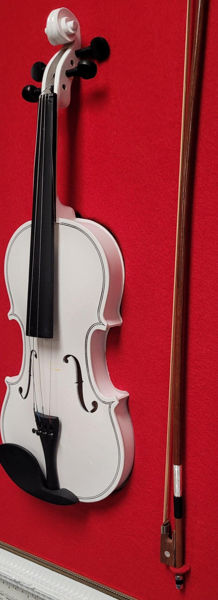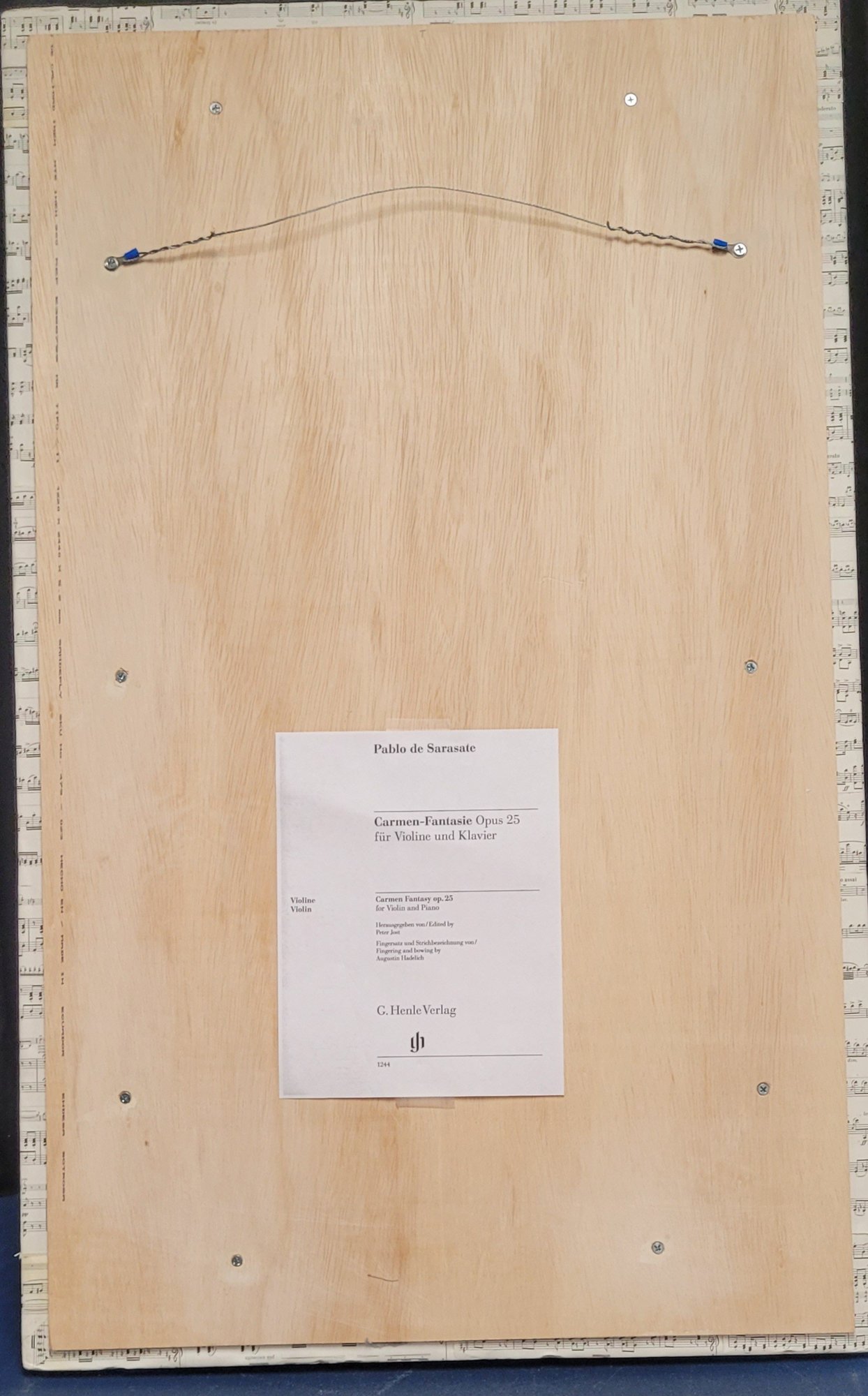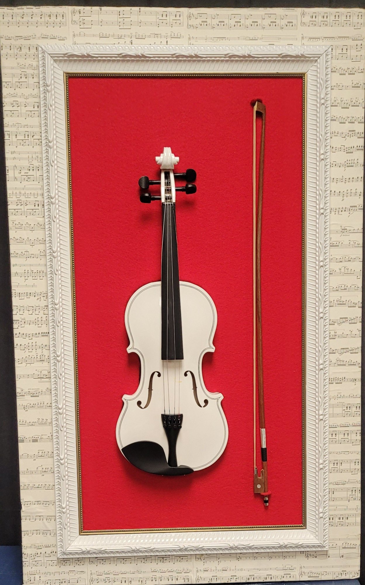 This lot comes with a framed violin. It measures 21.5" wide by 41.5" tall by 3.5" deep. This is in very good condition.