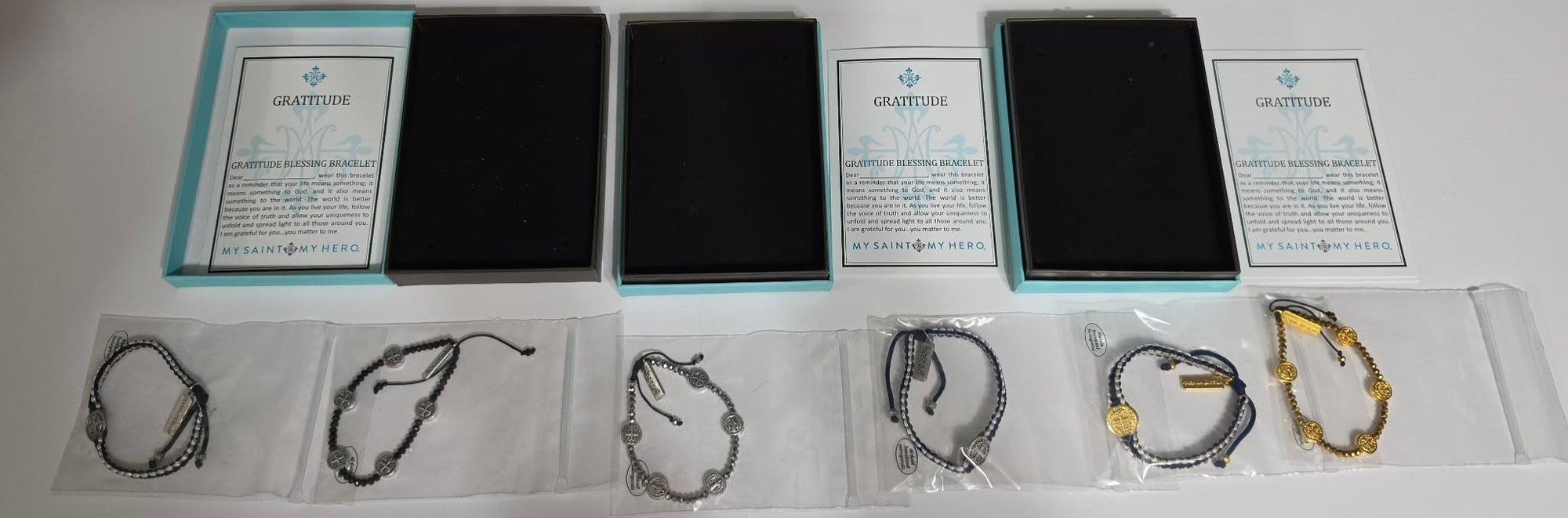 My Saint My Hero brand "Gratitude" blessing bracelets, featuring beaded designs with inspirational cards. Unused.