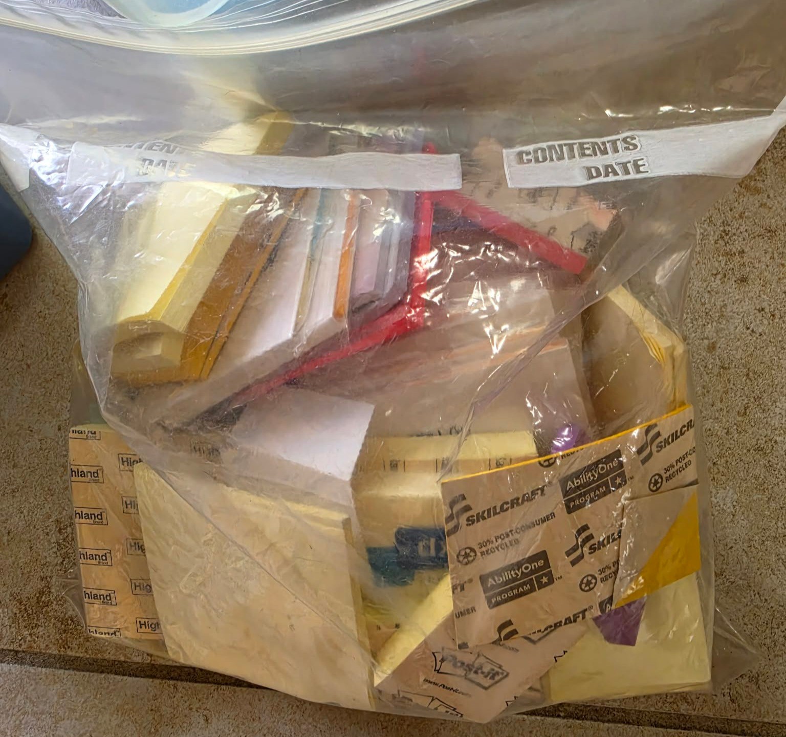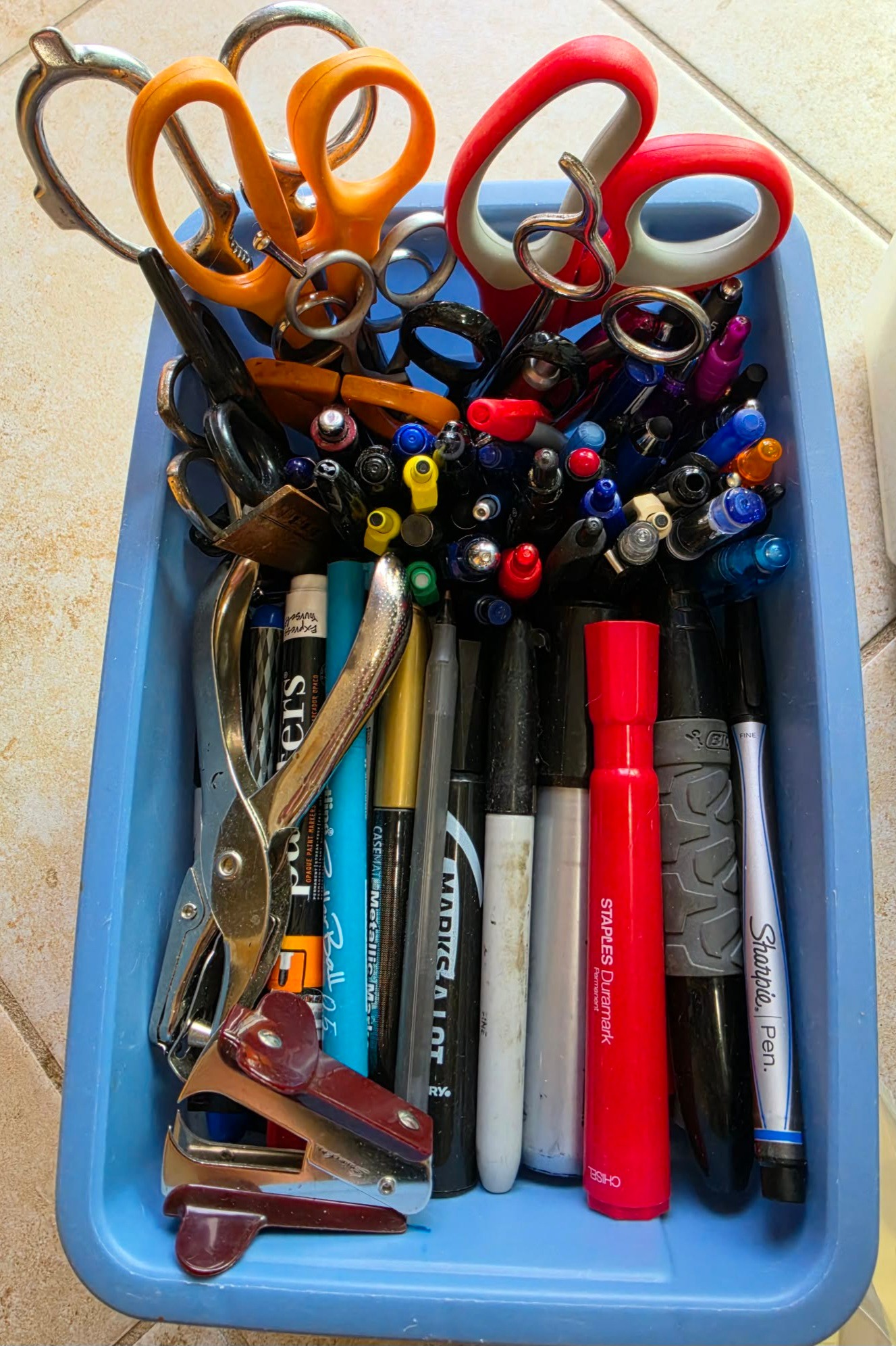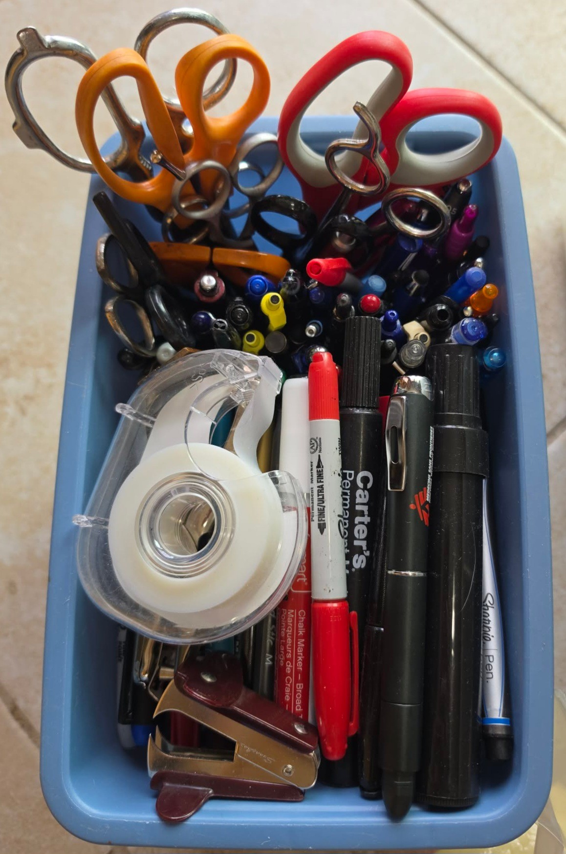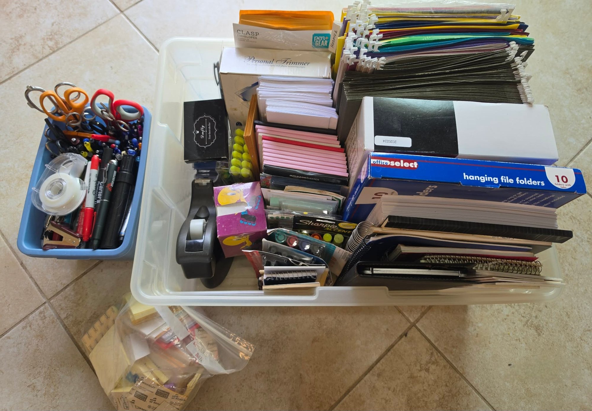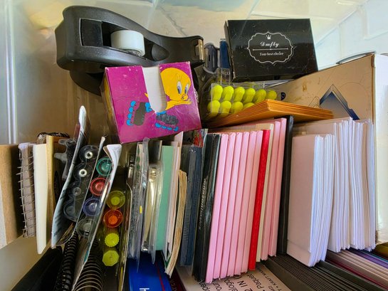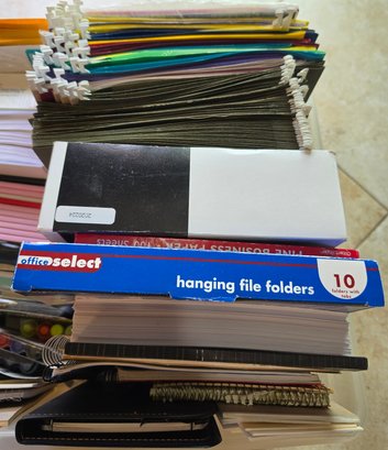 Office Supply Lot. Scratch Paper, pens, highlighters, scissors, tape dispensers, hanging folders and more.