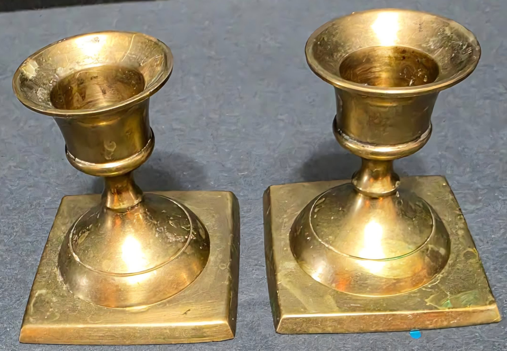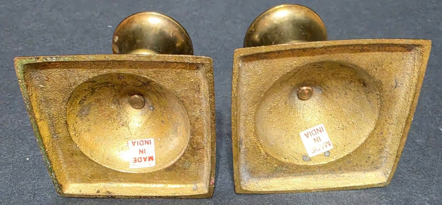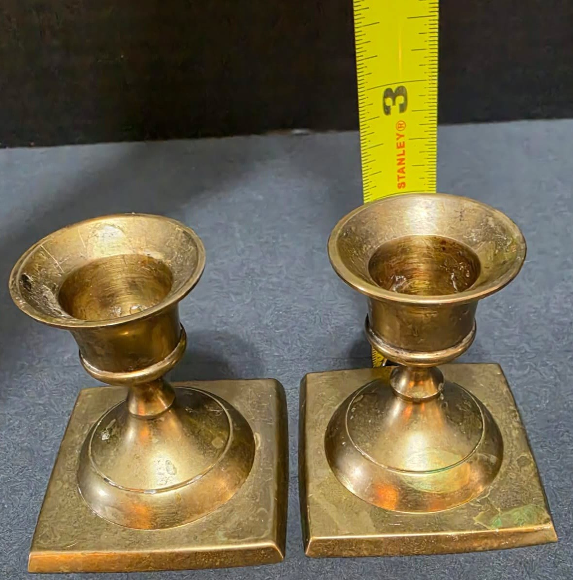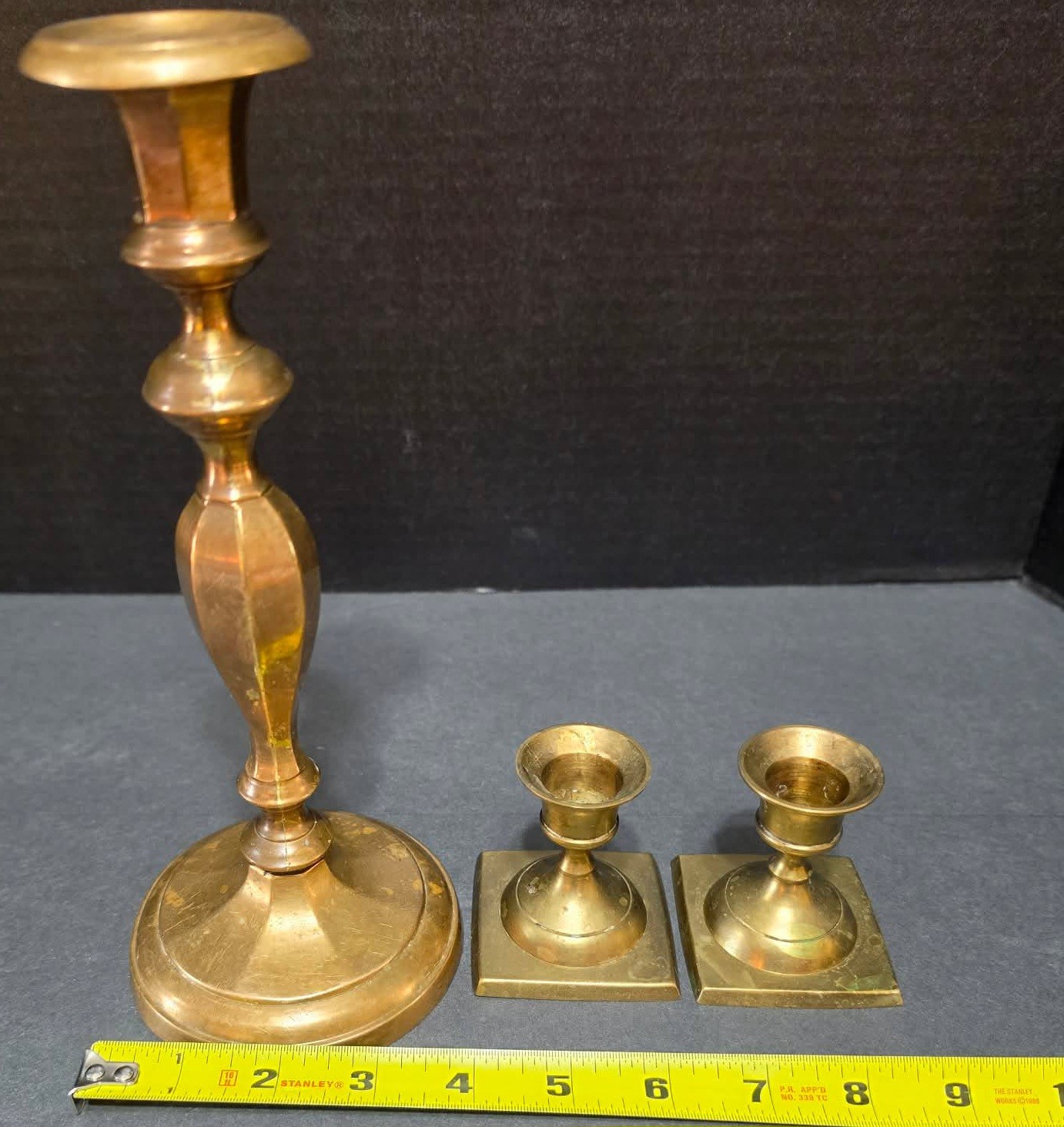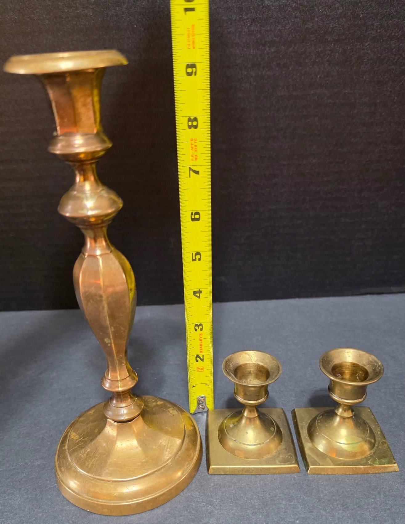 One large and two smaller vintage brass candle holders . Need cleaned.