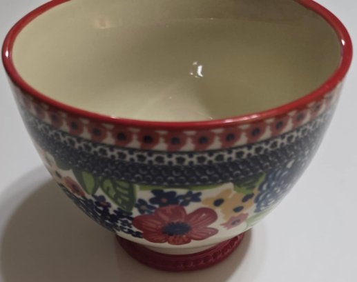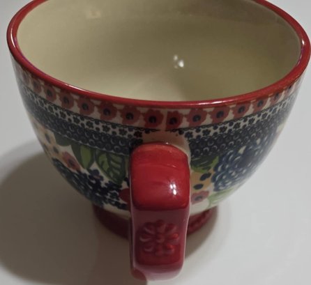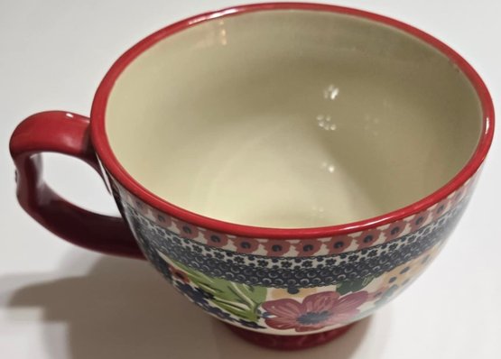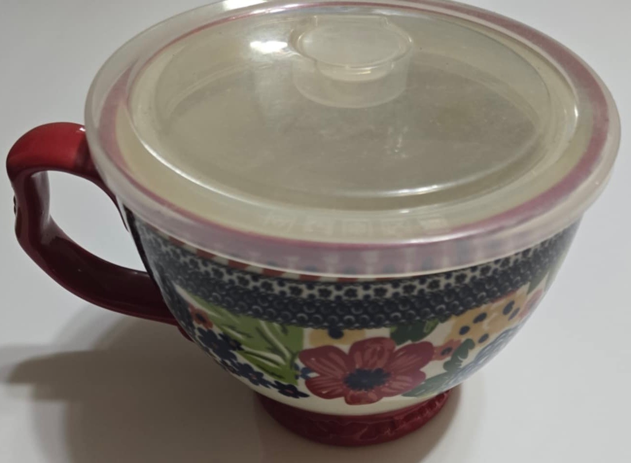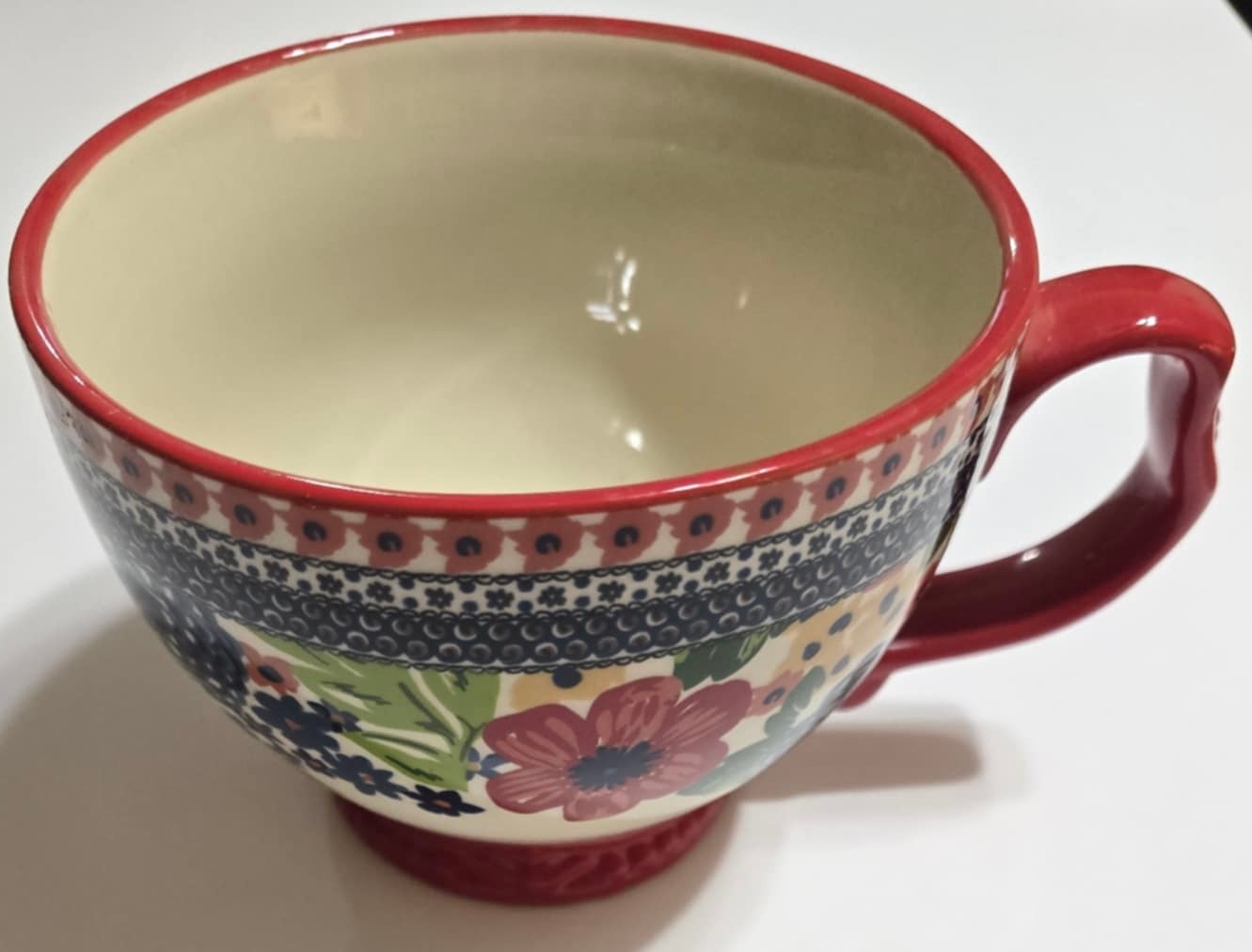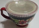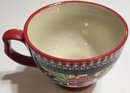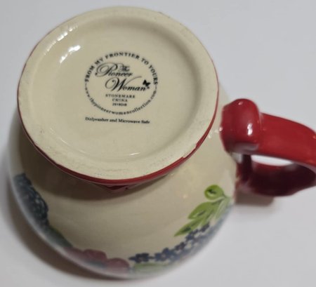 Pioneer Woman Dazzling Dahlias 27oz Jumbo Cup with Lid. Measures 7 x 5.5 x 4.25. Lid does not feel tight. No cracks or chips noted. Paint chipping on the bottom.