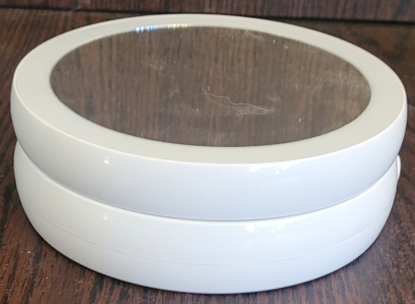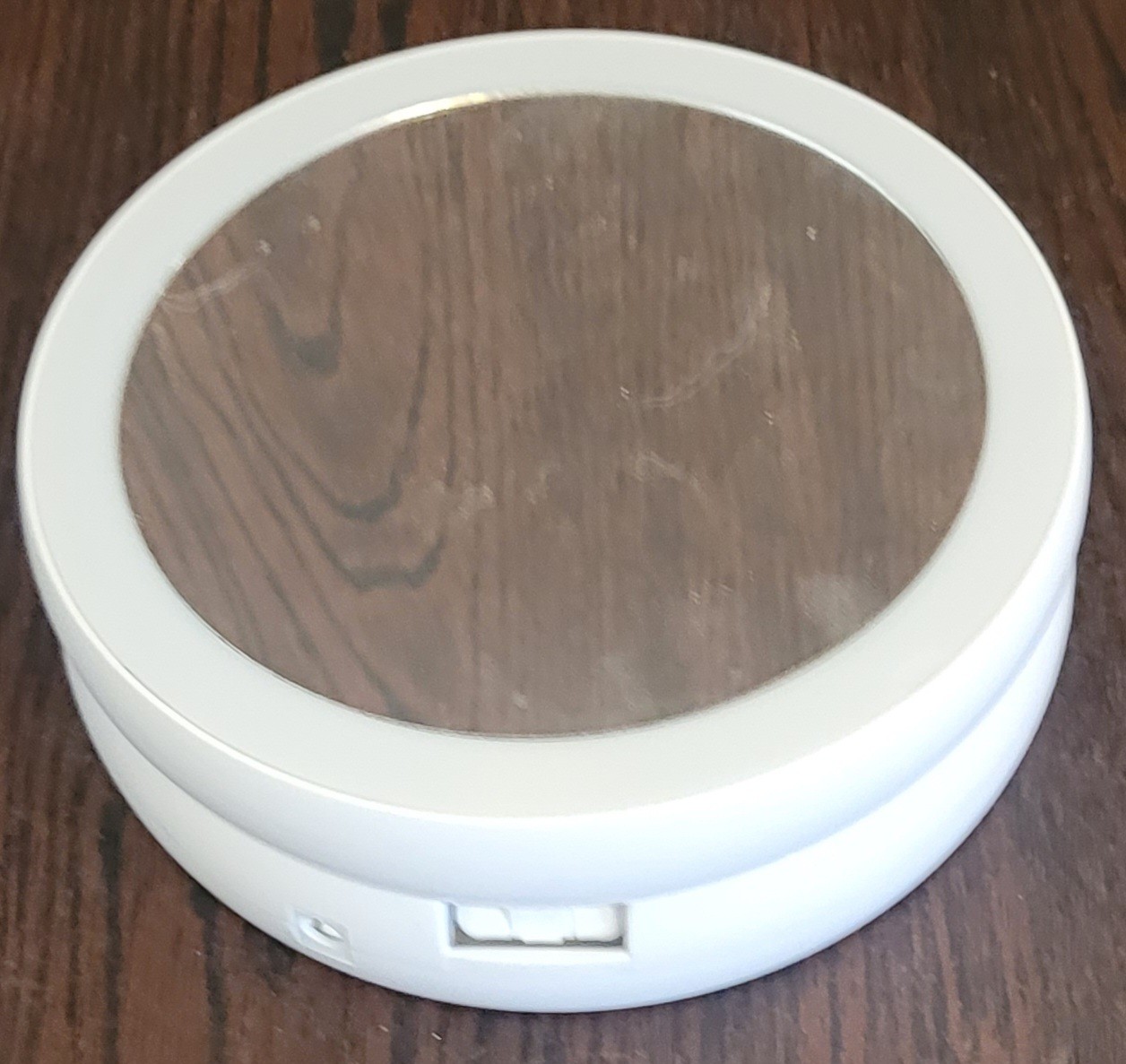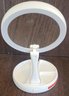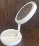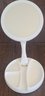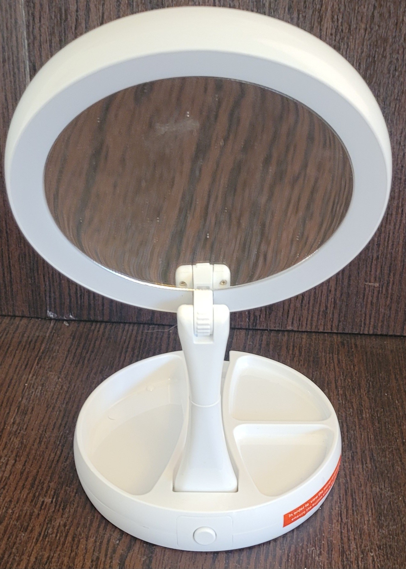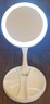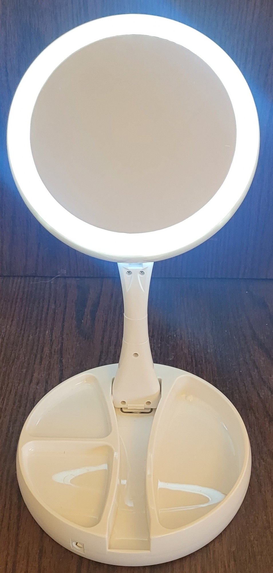 This mirror measures about 10.75" tall when extended. It doesn't have a cord, but it does work on batteries. See pictures for details.