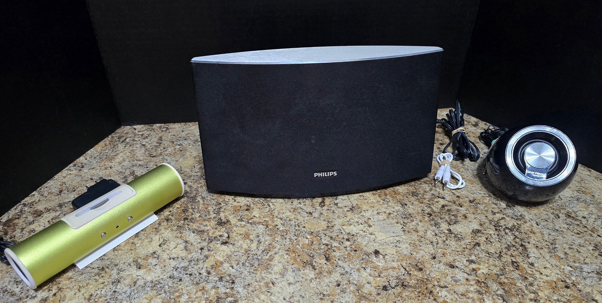 Portable/Wireless Speakers. Portable Power Angel Stereo Speaker, Phillips Wireless Speaker and Gear Head USB 2.0 speaker . Untested. Please see all pics for details.