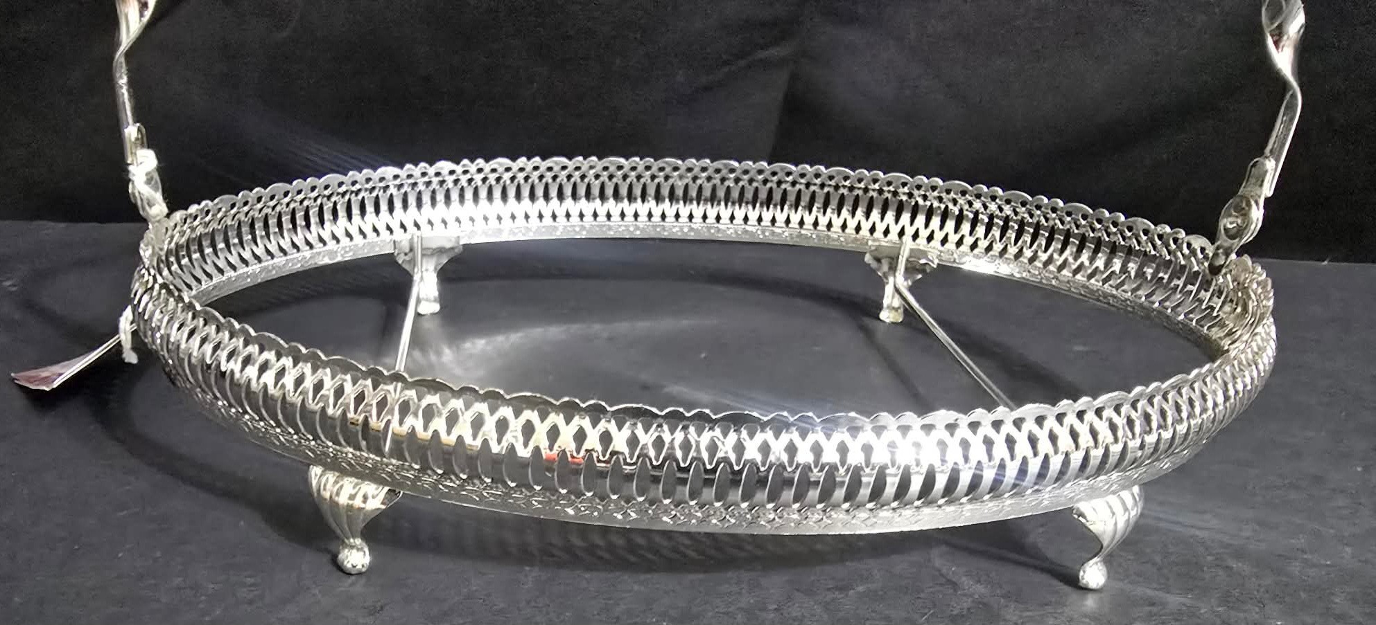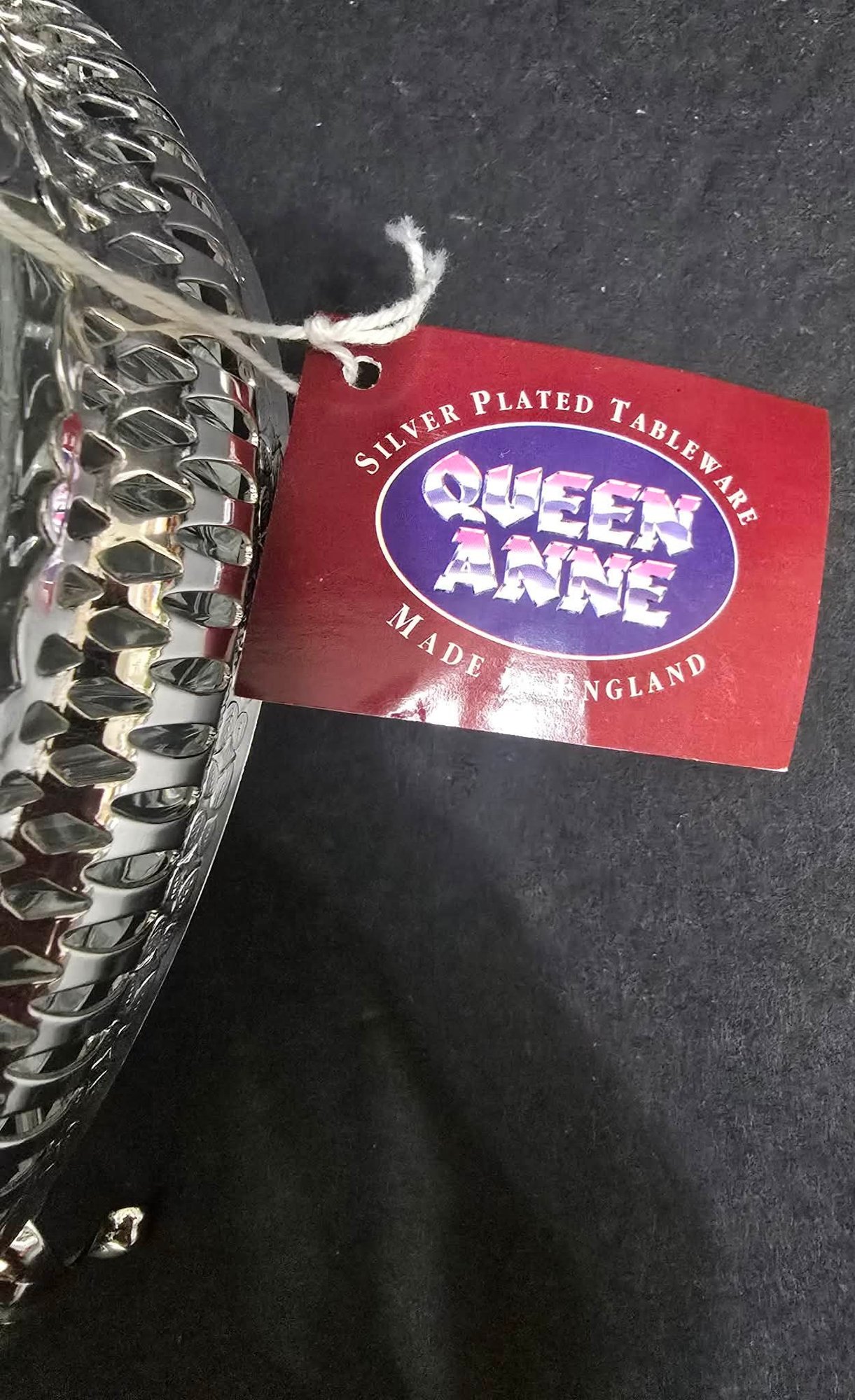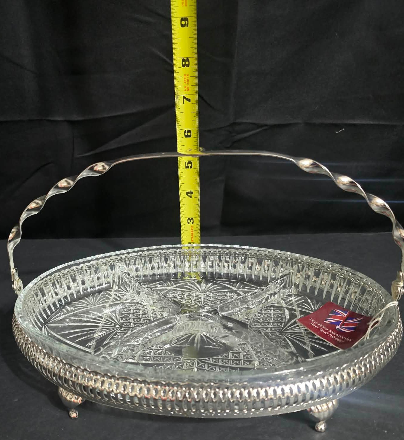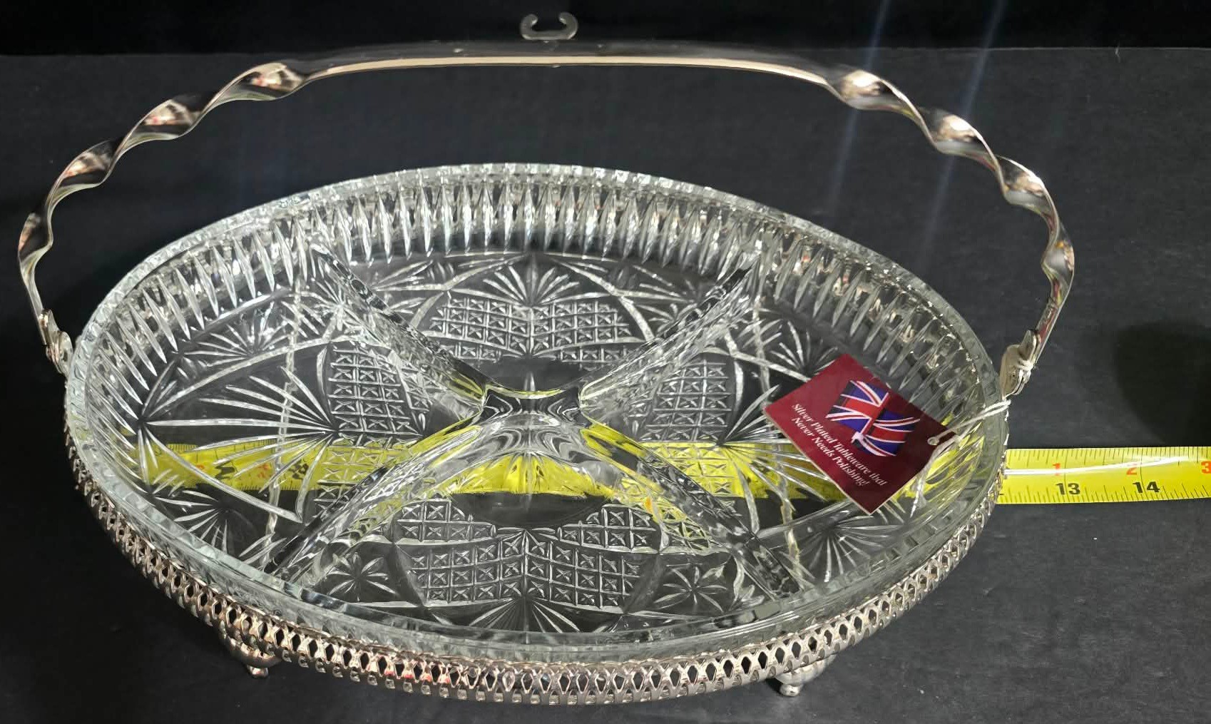 Queen Anne Mayell silver-plated and cut glass divided serving dish. No cracks or chips noted. Comes as pictured only.
