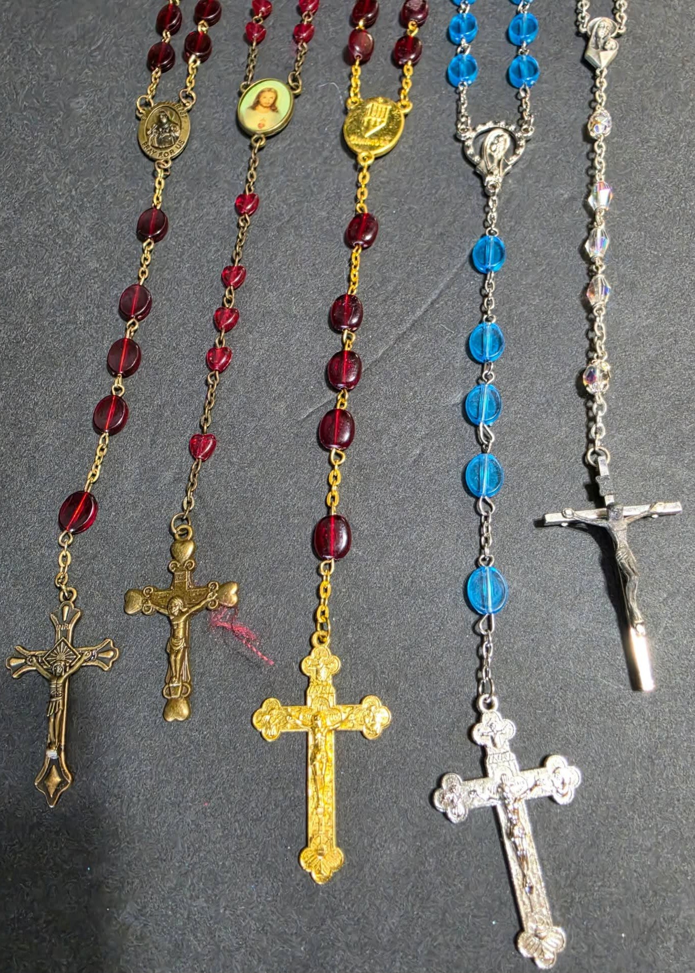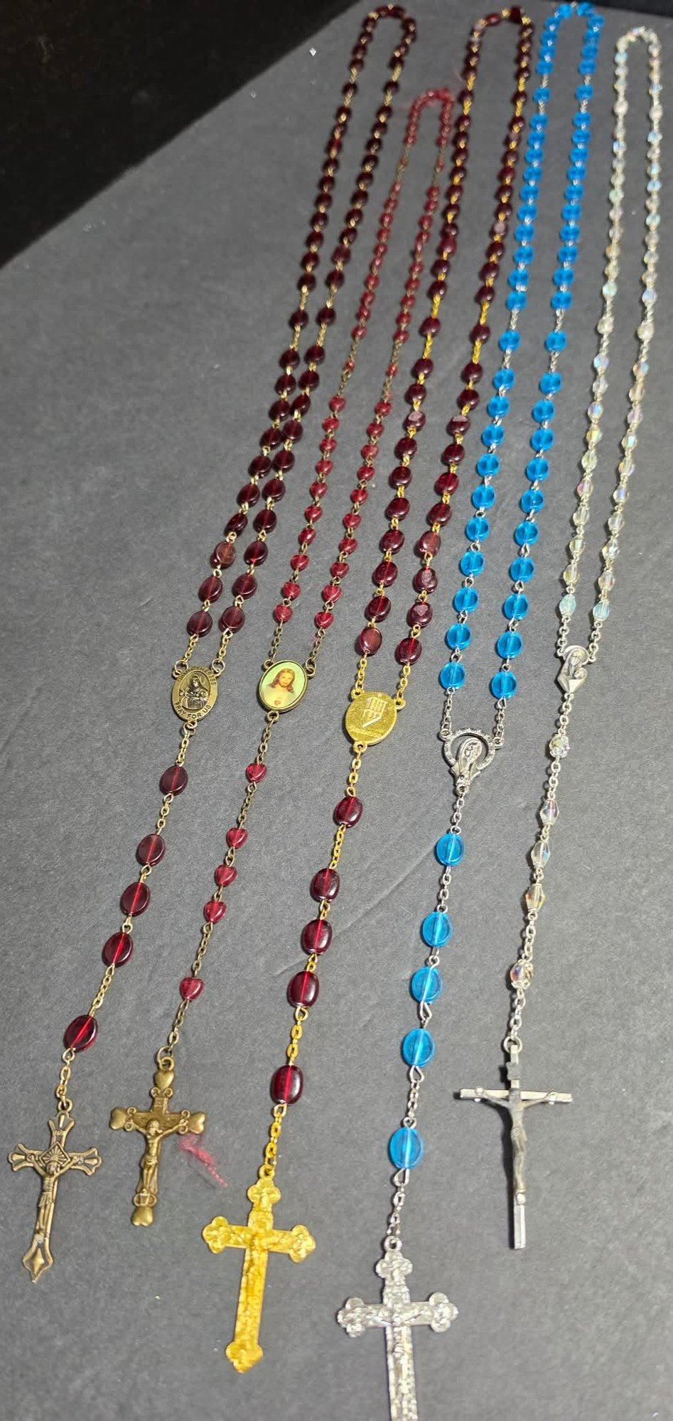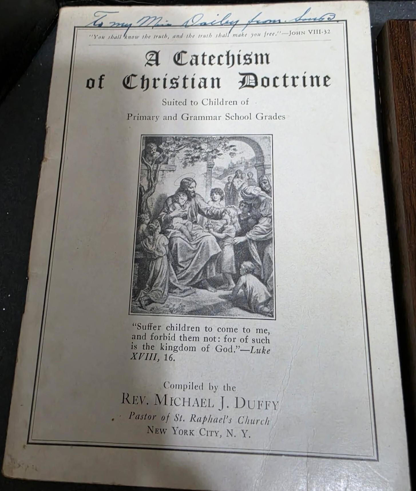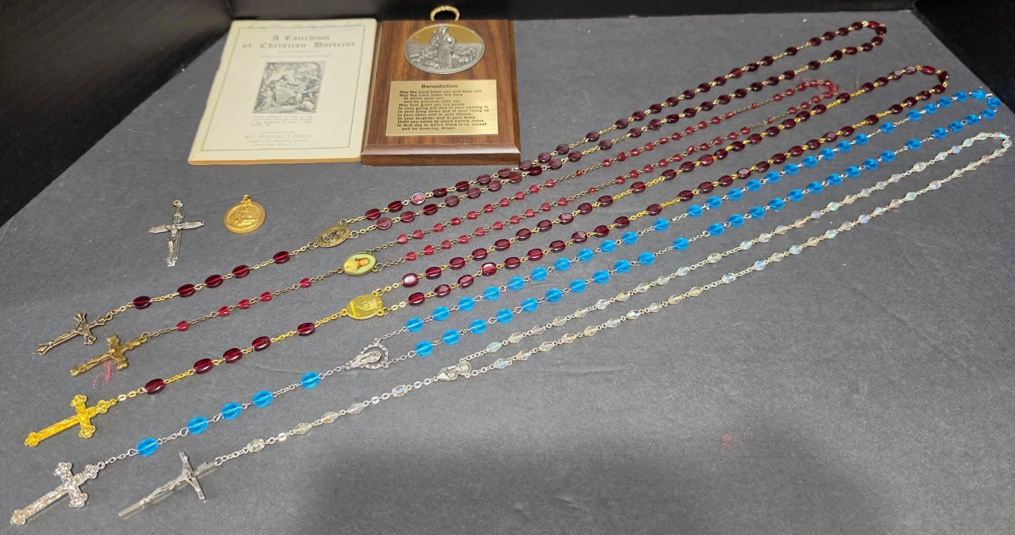 Religious Lot. Rosaries, cross pendant, vintage "Benediction" wooden plaque and a vintage religious booklet titled "A Catechism of Christian Doctrine."