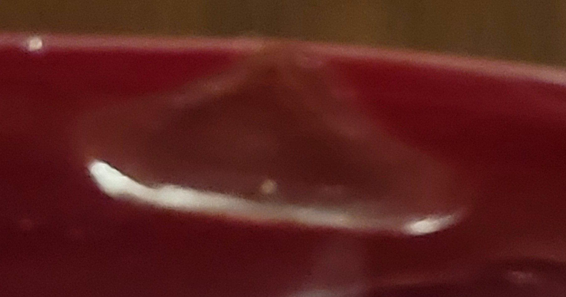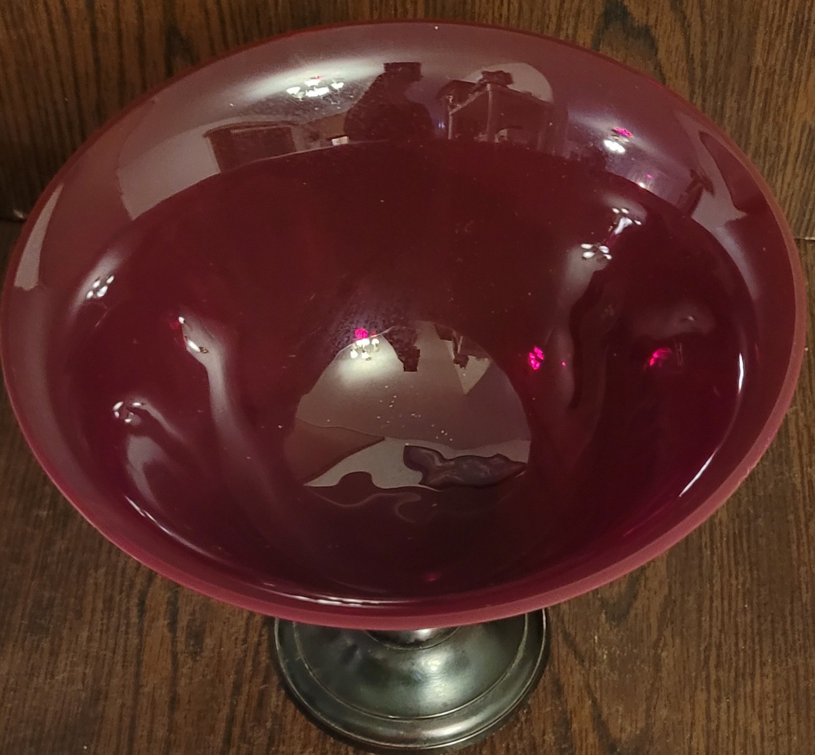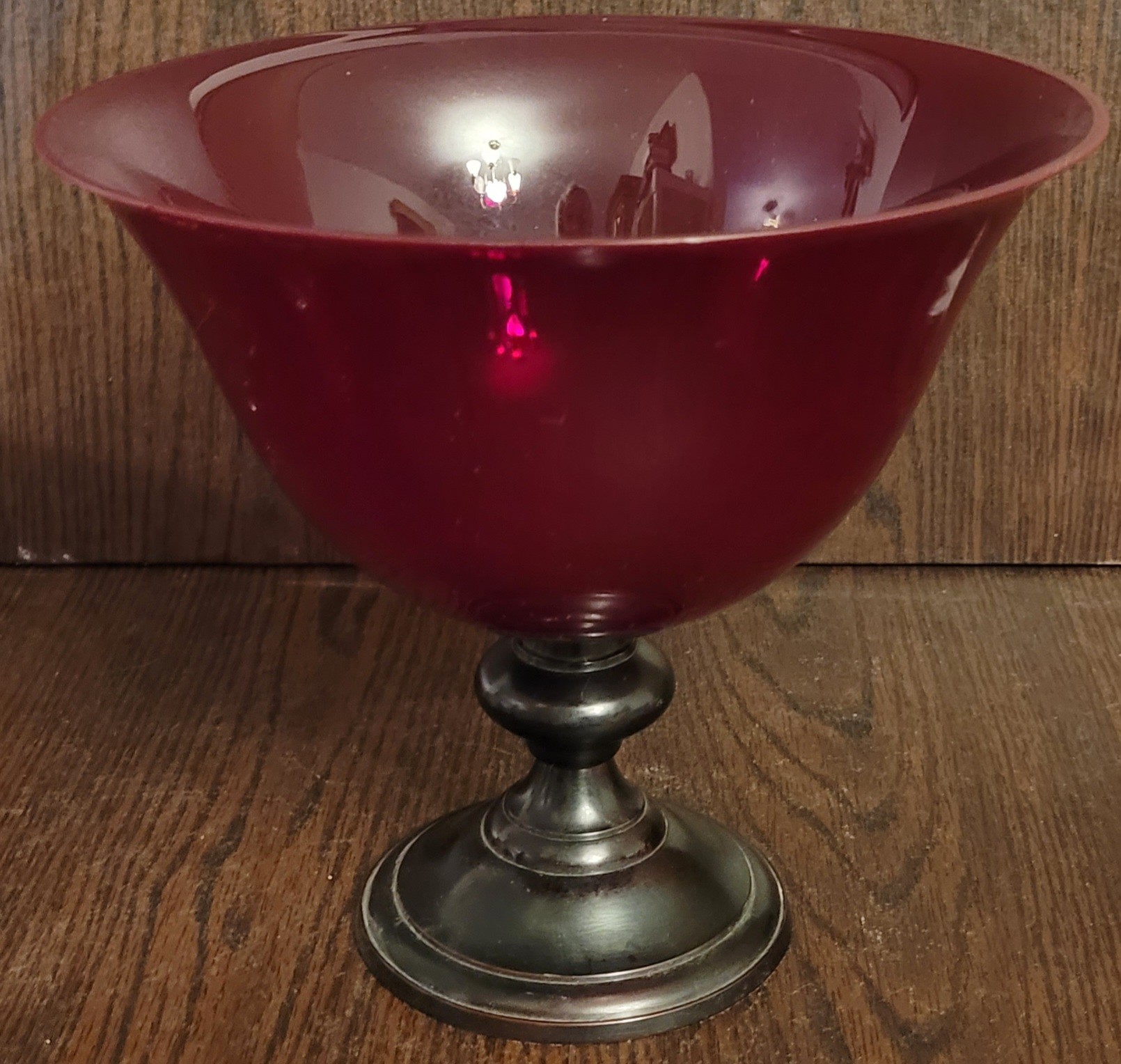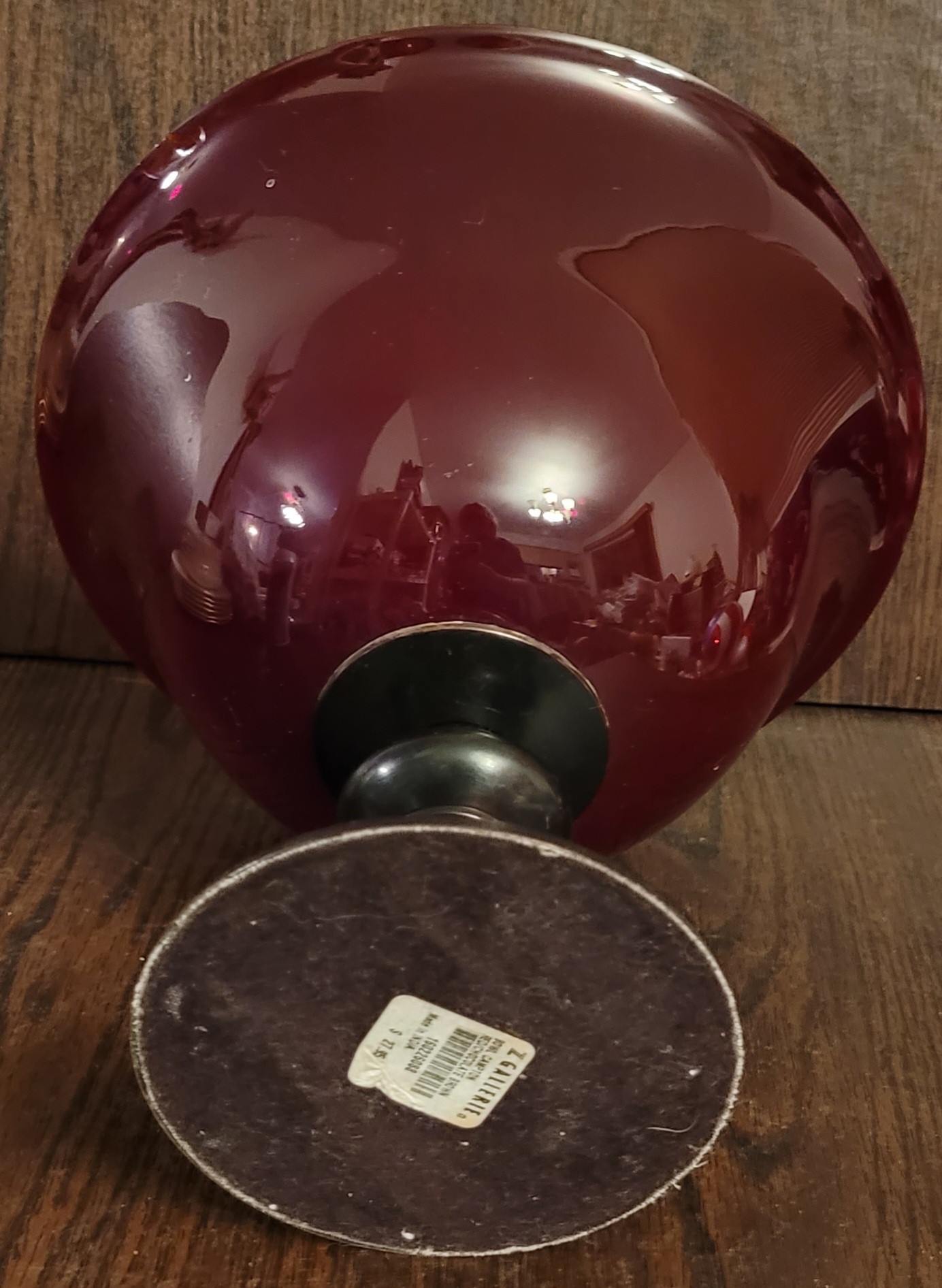 This measures 9" tall by 9.5" in diameter. It does have a small chip on the outer rim. See pictures for details.